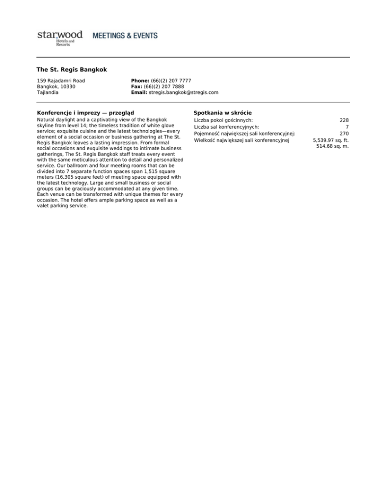 The St. Regis Bangkok 159 Rajadamri Road Bangkok, 10330 Tajlandia Phone: (66)(2) 207 7777 Fax: (66)(2) 207 7888 Email: [email protected] Konferencje i imprezy — przegląd Spotkania w skrócie Natural daylight and a captivating view of the Bangkok skyline from level 14; the timeless tradition of white glove service; exquisite cuisine and the latest technologies—every element of a social occasion or business gathering at The St. Regis Bangkok leaves a lasting impression. From formal social occasions and exquisite weddings to intimate business gatherings, The St. Regis Bangkok staff treats every event with the same meticulous attention to detail and personalized service. Our ballroom and four meeting rooms that can be divided into 7 separate function spaces span 1,515 square meters (16,305 square feet) of meeting space equipped with the latest technology. Large and small business or social groups can be graciously accommodated at any given time. Each venue can be transformed with unique themes for every occasion. The hotel offers ample parking space as well as a valet parking service. Liczba pokoi gościnnych: Liczba sal konferencyjnych: Pojemność największej sali konferencyjnej: Wielkość największej sali konferencyjnej 228 7 270 5,539.97 sq. ft. 514.68 sq. m. The St. Regis Bangkok 159 Rajadamri Road Bangkok, 10330 Tajlandia Phone: (66)(2) 207 7777 Fax: (66)(2) 207 7888 Email: [email protected] Specyfikacja szczegółowa Nieruchomości Typ obiektu Urban Liczba sal konferencyjnych 7 Rok budowy 2011 Całkowita wielkość sal konferencyjnych 1,370.04 sq. m. 14,746.99 sq. ft. Liczba budynków 1 Wielkość największej sali konferencyjnej 514.68 sq. m. 5,539.97 sq. ft. Liczba pięter 43 Pojemność największej sali konferencyjnej 270 Pojemność najmniejszej sali konferencyjnej 68.01 sq. m. Pojemność najmniejszej sali konferencyjnej 12 732.05 sq. ft. Pokoje gościnne Data zameldowania 3:00 PM Internet w pokoju Bezprzewodowy szybki dostęp do Internetu Bezprzewodowy szybki dostęp do Internetu Data wymeldowania 12:00 PM Liczba pokoi gościnnych 228 Udogodnienia Centrum odnowy biologicznej / Centrum Fitness Exercise Room Nazwa basenu Outdoor Swimming Pool Whirlpool/Hot Tub Basen Yes Lokalne & atrakcje Strefa czasowa I Pobliskie lotniska Suvarnabhumi Airport Kod lotniska BKK Odległość od lotniska 19.31 Kilometers 12.00 Miles Obszar lokalny With a prestigious location along Rajadamri Road, Bangkok’s key commercial corridor and the choice address of major corporations and financial institutions, The St. Regis Bangkok offers easy access to many of the city’s finest restaurants and upscale boutiques, from Bulgari to Valentino. Just five minutes from the hotel, Lumpini Park is home to picturesque lakes with rowing and paddle boats, expanses of rolling greenery, outdoor concerts, and a sports and activity center. In the early morning, the park is full of locals exercising and groups practicing Tai Chi, the ancient Chinese form of exercise. Vendors offer traditional beverages considered health tonics by many Thais and Chinese, as well as Thai snacks. Bangkok’s IMPACT Arena, Exhibition and Convention Center is conveniently located within 45 minutes. • Shopping hours: Malls 10am-10pm; supermarkets 7am-11pm, some 24 hours. Smaller shops 7-8am to 6-7pm • Languages spoken: Thai is the official language but English is widely spoken and understood. • Currency: Thai Baht (THB) • Electric system: 220V Environmental Practices Energy & Water Conservation: • High-efficiency lighting in guest rooms • High-efficiency lighting in public areas • Occupancy sensors • Water conserving fixtures • Smart irrigation practices • Regular preventive maintenance Waste Minimization & Environmentally Responsible Purchasing: • Recycling • Dumpster monitoring • Elimination of styrofoam packaging • Environmentally preferred suppliers • Environmentally preferred products • Amenity management • Sustainable food and beverage options Enhanced Indoor Environmental Quality: • Green Housekeeping • Integrated pest management practices • Low-emitting materials, such as paints, flooring and furniture Raising Awareness: • Property-level Green Council • Sustainable Meetings Practices • Carbon-offset program Opłaty & podatki Waluta lokalna Thailand Baht Kod waluty THB Metody płatności • DINERS/SUNDIN/AMOCO • DISCOVER NETWORK • JAPAN CREDIT BUREAU • AMEX / OPTIMA • MASTER CARD • VISA • CARTE BLANCHE The St. Regis Bangkok 159 Rajadamri Road Bangkok, 10330 Tajlandia Phone: (66)(2) 207 7777 Fax: (66)(2) 207 7888 Email: [email protected] Capacity Charts Room Name Key Dim. (l x w) Area Height Banq. Thtr. Astor Ballroom - 31.21 m. x 16.49 m.102.40 ft. x 54.10 ft. 514.68 sq. m. 5,539.97 sq. ft. 4.15 m. 13.62 ft. 280 360 Astor I - 13.20 m. x 16.49 m.43.31 ft. x 54.10 ft. 217.67 sq. m. 2,342.98 sq. ft. 4.15 m. 13.62 ft. 120 112 Astor II - 8.99 m. x 16.49 m.29.49 ft. x 54.10 ft. 148.27 sq. m. 1,595.96 sq. ft. 4.15 m. 13.62 ft. 80 96 Astor III - 8.99 m. x 16.49 m.29.49 ft. x 54.10 ft. 148.27 sq. m. 1,595.96 sq. ft. 4.15 m. 13.62 ft. 70 96 Rajadamri I - 12.83 m. x 7.99 m.42.09 ft. x 26.21 ft. 102.47 sq. m. 1,102.98 sq. ft. 4.05 m. 13.29 ft. 50 40 Rajadamri II - 11.40 m. x 9.24 m.37.40 ft. x 30.31 ft. 105.26 sq. m. 1,133.01 sq. ft. 4.05 m. 13.29 ft. 60 50 Rajadamri III - 7.59 m. x 8.26 m.24.90 ft. x 27.10 ft. 62.71 sq. m. 675.00 sq. ft. 2.68 m. 8.79 ft. 40 32 Rajadamri IV 7.44 m. x 7.89 m.24.41 ft. x 25.89 ft. - 58.71 sq. m. 631.95 sq. ft. 2.68 m. 8.79 ft. 40 32 Room Name Conf. Rec. Class U-Shp. H. Sq. Dinner Dance Rajadamri IV - 400 200 52 - - Rajadamri IV - 150 70 35 - - Rajadamri IV - 80 60 30 - - Rajadamri IV - 80 60 30 - - Rajadamri IV - 30 24 15 - - Rajadamri IV - 40 30 17 - - Rajadamri IV - 20 20 12 - - Rajadamri IV - 20 20 12 - -