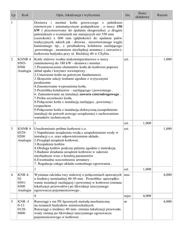Lp Kod 3 4 KNNR 4 05030500 Analogia Ilości składowe KNNR 4 05290200 Analogia KNR 402 05010300 Analogia Kotły stalowe wodne niskotemperaturowe o mocy szt. znamionowej do 180 kW - dostawa i montaż . 1.Przemieszczenie elementów kotła do kotłowni poprzez skład opału i korytarz wewnętrzny . 2.Ustawienie kotła na gotowym fundamencie . 3.Skręcenie sekcji śrubami zgodnie z wytycznymi producenta 4.Zmontowanie wyposażenia kotła. 5.Przeróbka kolektorów - zasilającego i powrotnego . 6. Zamontowanie na instalacji zaworu czterodrogowego . 7.Próba szczelności kotła. 8.Połączenie kotła z instalacją zasilająca , powrotną i czopuchem . 9.Połączenie kotła z instalacją elektryczną (uzupełnienie instalacji do potrzeb nowego urządzenia) z zachowaniem warunków technicznych . 1 szt. Uruchomienie próbne kotłowni c.o. 1.Napełnienie urządzenia wodą z uzupełnieniem wody w instalacji c.o. oraz odpowietrzeniem układu . 2.Przegląd urządzeń kotłowni . 3.Rozpalenie kotłów. 4.Obsługa kotłów podczas palenia zgodnie z instrukcją 5.Badanie działania urządzeń kotłowni w zakresie niezbędnym wraz z korektą parametrów . 6.Ewentualne uszczelnienie armatury . 7. Regulacja całego układu centralnego ogrzewania . szt. 1 szt. Razem KNR -I 0-13 01280400 1,000 1,000 1,000 1,000 Wymiana odcinka rury stalowej o połączeniach spawanych msc o średnicy nominalnej 40-50 mm . Przeróbka- uporządkowanie instalacji zasilającej i powrotnej w kotłowni (zmiana lokalizacji przewodów) po likwidacji nieczynnego ogrzewacza pojemnościowego . 4 5 Jm. Dostawa i montaż kotła grzewczego z palnikiem retortowym i automatycznym podajnikiem , o mocy 150 kW ( przystosowany do spalania ekogroszku) ,z drugim paleniskiem o wymiarach nie mniejszych niż 550 mm (szerokość) x 600 mm (głębokość) do spalania paliw tradycyjnych, takich jak : drewna , niesortowanego węgla kamiennego itp., z przebudową kolektora zasilającego ,powrotnego , montażem niezbędnej armatury ( zaworów)kotłownia budynku przy ul. Bielskiej 40 w Chybiu . 1 2 Opis, lokalizacja i wyliczenia mjsc Rurociągi z rur PE łączonych metodą mechaniczną m na ścianach budynków niemieszkalnych. Rurociągi o średnicy 40 mm- zmiana lokalizacji przewodu wody zimnej po likwidacji nieczynnego ogrzewacza pojemnościowego w kotłowni . 4,000 4,000 4,000