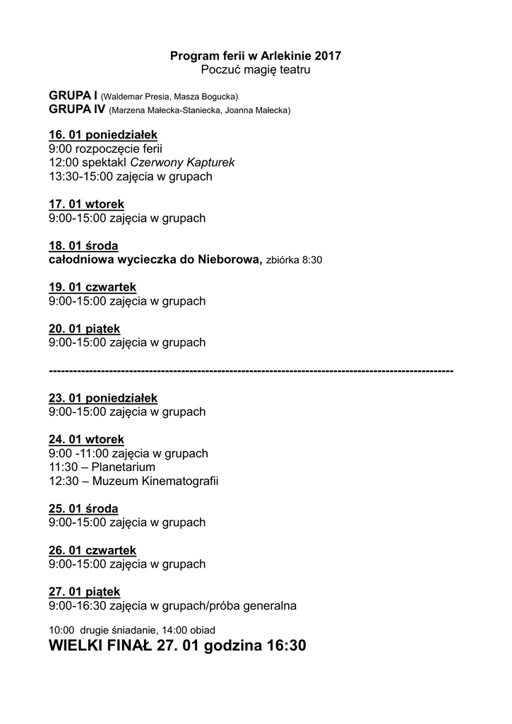 Program ferii w Arlekinie 2017 Poczuć magię teatru GRUPA I (Waldemar Presia, Masza Bogucka) GRUPA IV (Marzena Małecka-Staniecka, Joanna Małecka) 16. 01 poniedziałek 9:00 rozpoczęcie ferii 12:00 spektakl Czerwony Kapturek 13:30-15:00 zajęcia w grupach 17. 01 wtorek 9:00-15:00 zajęcia w grupach 18. 01 środa całodniowa wycieczka do Nieborowa, zbiórka 8:30 19. 01 czwartek 9:00-15:00 zajęcia w grupach 20. 01 piątek 9:00-15:00 zajęcia w grupach ----------------------------------------------------------------------------------------------------23. 01 poniedziałek 9:00-15:00 zajęcia w grupach 24. 01 wtorek 9:00 -11:00 zajęcia w grupach 11:30 – Planetarium 12:30 – Muzeum Kinematografii 25. 01 środa 9:00-15:00 zajęcia w grupach 26. 01 czwartek 9:00-15:00 zajęcia w grupach 27. 01 piątek 9:00-16:30 zajęcia w grupach/próba generalna 10:00 drugie śniadanie, 14:00 obiad WIELKI FINAŁ 27. 01 godzina 16:30
