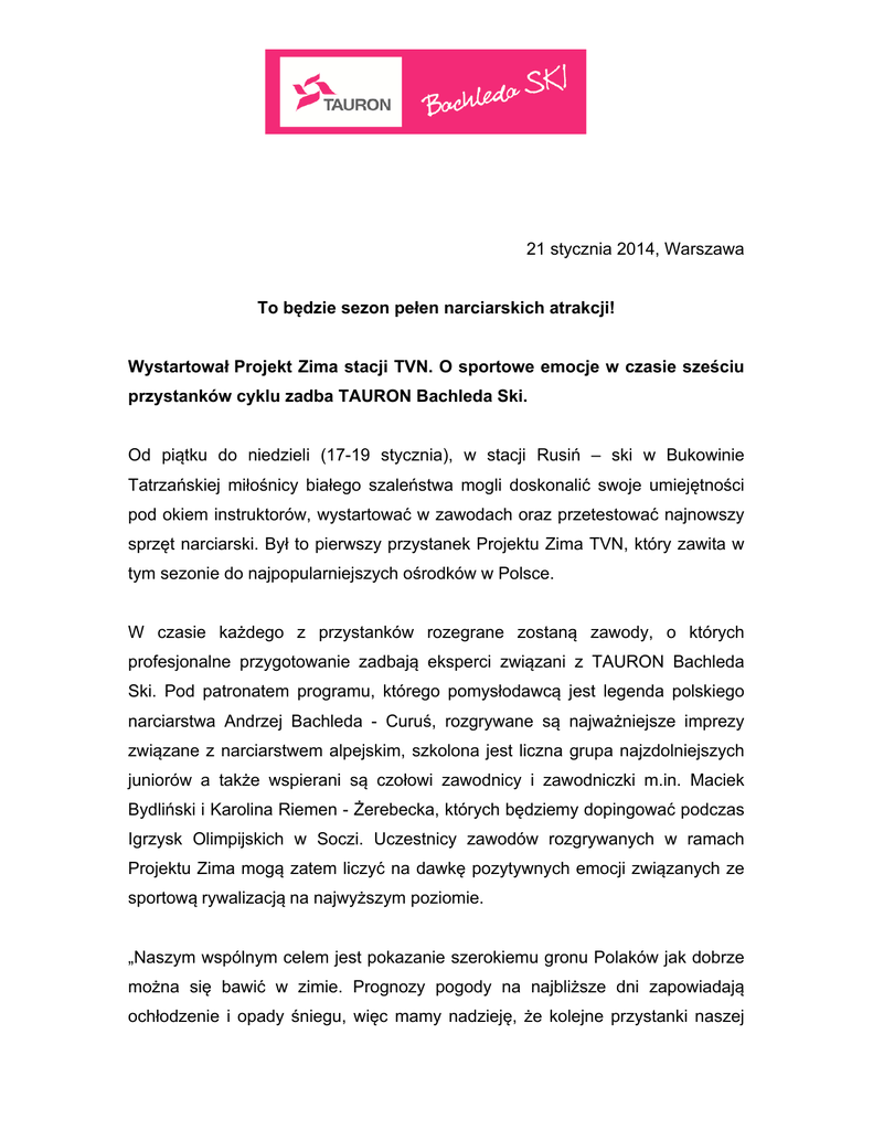 21 stycznia 2014, Warszawa To będzie sezon pełen narciarskich atrakcji! Wystartował Projekt Zima stacji TVN. O sportowe emocje w czasie sześciu przystanków cyklu zadba TAURON Bachleda Ski. Od piątku do niedzieli (17-19 stycznia), w stacji Rusiń – ski w Bukowinie Tatrzańskiej miłośnicy białego szaleństwa mogli doskonalić swoje umiejętności pod okiem instruktorów, wystartować w zawodach oraz przetestować najnowszy sprzęt narciarski. Był to pierwszy przystanek Projektu Zima TVN, który zawita w tym sezonie do najpopularniejszych ośrodków w Polsce. W czasie każdego z przystanków rozegrane zostaną zawody, o których profesjonalne przygotowanie zadbają eksperci związani z TAURON Bachleda Ski. Pod patronatem programu, którego pomysłodawcą jest legenda polskiego narciarstwa Andrzej Bachleda - Curuś, rozgrywane są najważniejsze imprezy związane z narciarstwem alpejskim, szkolona jest liczna grupa najzdolniejszych juniorów a także wspierani są czołowi zawodnicy i zawodniczki m.in. Maciek Bydliński i Karolina Riemen - Żerebecka, których będziemy dopingować podczas Igrzysk Olimpijskich w Soczi. Uczestnicy zawodów rozgrywanych w ramach Projektu Zima mogą zatem liczyć na dawkę pozytywnych emocji związanych ze sportową rywalizacją na najwyższym poziomie. „Naszym wspólnym celem jest pokazanie szerokiemu gronu Polaków jak dobrze można się bawić w zimie. Prognozy pogody na najbliższe dni zapowiadają ochłodzenie i opady śniegu, więc mamy nadzieję, że kolejne przystanki naszej akcji odbędą się już w prawdziwie zimowej scenerii.” - powiedział Andrzej Bachleda - Curuś po zawodach w Bukownie Tatrzańskiej. Już w tym tygodniu, od piątku do niedzieli, miłośnicy narciarstwa będą mogli skorzystać z atrakcji przygotowanych w ramach Projektu Zima na Jankulakowskim Wierchu w Białce Tatrzańskiej. W kolejne weekendy akcja zawita do kilku znakomitych ośrodków narciarskich, zaś wielki finał odbędzie się na przełomie lutego i marca na Polanie Szymoszkowej w Zakopanem. Na uczestników zawodów i konkursów rozgrywanych w ramach Projektu Zima czekają nagrody o wartości ponad 50 tysięcy złotych, więc tym bardziej warto wybrać się na choć jeden z przystanków i włączyć do sportowej zabawy. Jak przekonuje Maja Popielarska, prowadząca Projekt Zima - „Nie trzeba jeździć na nartach żeby dobrze się bawić, oprócz zawodów nie brakuje różnego rodzaju atrakcji na świeżym powietrzu. Ci, którzy nie dotrą na stok mogą śledzić relacje z imprez na trzech antenach - TVN, TVN 24 i TVN Meteo oraz w programie “Co za tydzień”. Więcej informacji na temat akcji i programu TAURON Bachleda Ski znaleźć można na stronach: www.tauronbachledaski.pl oraz facebook.com/TauronBachledaSki. Harmonogram Projektu Zima TVN: 1) 24.01.2014 – 26.01.2014 Białka Tatrzańska – Jankulakowski Wierch 2) 31.01.2014 – 02.02.2014 Małe Ciche 3) 07.02.2014 – 09.02.2014 Palenica – Szczawnica 4) 14.02.2014 – 16.02.2014 Istebna – Złoty Groń 5) 21.02.2014 – 23.02.2014 Czarna Góra 6) 28.02.2014 – 02.03.2014 Szymoszkowa – Zakopane na Andrzej Lesiewski [email protected] +48 512 348 232 TAURON Polska Energia SA jest spółką holdingową w grupie kapitałowej, która zajmuje się wydobyciem węgla, wytwarzaniem, dystrybucją i sprzedażą energii. Grupa TAURON wraz z GZE obejmuje swoim działaniem 18 proc. powierzchni kraju i jest jednym z największych podmiotów gospodarczych w Polsce, posiadającym 5,2 mln klientów. W skład Grupy TAURON wchodzą m.in. TAURON Wytwarzanie, TAURON Dystrybucja, TAURON Sprzedaż, TAURON Obsługa Klienta, Południowy Koncern Węglowy, TAURON Ciepło, TAURON Ekoenergia oraz spółki należące do GZE. Andrzej Bachleda-Curuś II – (ur. 2 stycznia 1947 roku w Zakopanem) to najbardziej utytułowany polski narciarz alpejski. Dwukrotnie reprezentował Polskę na Igrzyskach Olimpijskich – w 1968 roku w Grenoble, gdzie zdobył 6. lokatę w slalomie specjalnym oraz w Sapporo w roku 1972, plasując się na 9. pozycji w slalomie gigancie. W jego kolekcji znajdują się też medale Narciarskich Mistrzostw Świata - brąz za kombinację alpejską w Val Gardena w 1970 roku oraz srebro zdobyte w 1974 w St. Moritz w tej samej konkurencji. Wybitnym wynikiem było też 2. miejsce w slalomowej klasyfikacji Pucharu Świata i 6. miejsce w klasyfikacji generalnej w sezonie 1971/1972. Andrzej Bachleda-Curuś wielokrotnie tryumfował też na Zimowych Uniwersjadach i Spartakiadach Armii Zaprzyjaźnionych. Na najwyższym podium Mistrzostw Polski stawał aż 14 razy. W trakcie swojej kariery ścigał się z największymi legendami narciarstwa alpejskiego, takimi jak Jean Claude Killy czy Gustavo Thöni. Jest pierwszym Polakiem uhonorowanym prestiżową nagrodą „Fair Play” przyznawaną przez UNESCO. W 2009 roku otrzymał Krzyż Kawalerski Orderu Odrodzenia Polski.