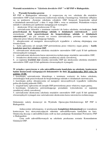 Warunki uczestnictwa w "Szkoleniu dowódców OSP " w KP PSP w Białogardzie. 1. Warunki formalno-prawne KP PSP w Białogardzie informuje, iż rozpoczyna się ww. szkolenie dla strażaków ratowników OSP (część teoretyczna realizowana metodą e-learningową). Szkolenie odbędzie się na podstawie „Systemu szkolenia członków OSP biorących bezpośredni udział w działaniach ratowniczych” z dnia 11 maja 2006 r. wraz ze zmianami. Warunkiem wzięcia udziału w szkoleniu jest spełnienie następujących wymogów: 1. ukończone 18 lat i nie przekroczone 55 lat, 2. zaświadczenie lekarskie z terminem ważności do końca szkolenia, stwierdzające brak przeciwskazań do bezpośredniego udziału w działaniach ratowniczych – jeżeli stwierdzenie „brak przeciwskazań do bezpośredniego udziału w działaniach ratowniczych”, nie jest zawarte we wzorze zaświadczenia, powinno zostać wpisane odręcznie przez lekarza dokonującego badanie, 3. ubezpieczenie od następstw nieszczęśliwych wypadków z ochroną obejmującą czas trwania kursu, 4. karta zgłoszenia od zarządu OSP potwierdzona przez właściwy organ gminy – każdy kandydat musi być członkiem OSP, 5. zaświadczenie ukończenia szkolenia strażaków ratowników OSP część II lub spełnienie równorzędnych wymagań, 6. zaświadczenie ukończenia kursu ratownictwa technicznego strażaków ratowników OSP, 7. świadectwo ukończenia co najmniej zasadniczej szkoły zawodowej, 8. co najmniej trzyletni staż strażaka ratownika OSP (po ukończeniu szkolenia strażaków ratowników OSP część II lub spełnieniu równorzędnych wymagań). W związku z powyższym w celu zakwalifikowania kandydata na szkolenie, koniecznym będzie dostarczenie następujących dokumentów do dnia 30 października 2015 roku, do godziny 15:00. 1. kserokopia zaświadczenia lekarskiego z terminem ważności do końca szkolenia, stwierdzające brak przeciwskazań do bezpośredniego udziału w działaniach ratowniczych, 2. kserokopia polisy ubezpieczenia od następstw nieszczęśliwych wypadków (oddzielna polisa dla każdej jednostki OSP), 3. oryginał karty zgłoszenia od zarządu OSP potwierdzony przez właściwy organ gminy, 4. kserokopia świadectwa potwierdzającego posiadanie wykształcenia co najmniej zasadniczej szkoły zawodowej, 5. zaświadczenie ukończenia szkolenia strażaków ratowników OSP część II lub spełnienie równorzędnych wymagań oraz zaświadczenie ukończenia kursu ratownictwa technicznego. Dokumenty należy dostarczyć do Wydziału Operacyjno-Szkoleniowego KP PSP w Białogardzie. Jednocześnie informujemy, iż przekazanie kompletnej dokumentacji jest warunkiem koniecznym lecz niewystarczającym odnośnie zakwalifikowania kandydata na kurs. Ostateczną decyzję o zakwalifikowaniu osób na kurs podejmuje Komendant Powiatowy PSP w Białogardzie. Lista osób zakwalifikowanych na szkolenie przekazana zostanie Komendantom Gminnym OSP. 1 2. Realizacja szkolenia 2.1.Część teoretyczna – e-learning 2.1.1. Kurs Warunkiem przystąpienia do części praktycznej jest ukończenie 100 % kursu znajdującego się na platformie e-learningowej: • „Szkolenie dowódców OSP”, Procent realizacji kursu widoczny jest w zakładce „Strona główna”, po zalogowaniu użytkownika. 2.1.2. Test Po ukończeniu szkolenia na platformie e-learningowej, każdy kursant ma obowiązek odbyć również test. Warunkiem jego zaliczenia jest uzyskanie więcej niż 80 % możliwych do zdobycia punktów. Rozpoczęcie testu możliwe w zakładce „Testy”, po zalogowaniu użytkownika. W przypadku zdobycia mniejszej niż wymagana ilość punktów, kursant może zresetować test. Opcja ta możliwa jest w zakładce „Moje konto”- należy kliknąć polecenie „resetuj wyniki testów”. Test należy wykonywać do momentu uzyskania wymaganej liczby punktów. Fakt ukończenia kursu e-learning oraz zaliczenie testu na platformie e-learningowej, będzie sprawdzane w chwili składania dokumentów, czyli do dnia 30 października 2015 roku, do godziny 15:00. W przypadku niezrealizowania w wymaganym zakresie i terminie szkoleń i testów dokumenty kandydata na kurs nie zostaną przyjęte. W związku z ograniczoną ilością miejsc na części praktycznej (20 strażaków), decydującym parametrem o kolejności przyjęć będą wyniki osiągnięte na teście kwalifikującym oraz potrzeby jednostek. 2.1.3. Test kwalifikujący do kursu W dniu 8 listopada br. w siedzibie KP PSP w Białogardzie przeprowadzony będzie sprawdzian wiedzy dla strażaków ubiegających się o uczestnictwo w kursie. Sprawdzian będzie zawierał pytania testowe z materiału, który zawarty jest na platformie e-learningowej. Test ma za zadanie wyłonić skład strażaków na kurs, jednocześnie odrzucić osoby, które w sposób nieuczciwy zdobyły zaliczenie na platformie e-learningowej. 2.2.Część praktyczna – zajęcia w JRG KP PSP w Białogardzie. Kurs odbywał się będzie w dniach 8 i 22 listopada 2015 roku. Warunkiem dopuszczenia do zajęć praktycznych jest ukończenie kursu i zaliczenia testu na platformie e-learningowej oraz zaliczenie testu kwalifikującego do kursu, który przeprowadzony zostanie w dniu 8 listopada br. w siedzibie KP PSP w Białogardzie. Osoby, które nie spełnią tych warunków, zostaną wykreślone z listy kursantów i nie będą mogły wziąć udziału w części praktycznej. Zajęcia praktyczne odbywać się będą na terenie KP PSP w Białogardzie. 2 Każdy strażak na zajęciach praktycznych zobowiązany jest posiadać kompletne umundurowanie: · środki ochrony indywidualnej: ubranie specjalne, rękawice specjalne, kominiarka, buty strażackie, hełm strażacki, · ekwipunek osobisty: pas strażacki, toporek strażacki, zatrzaśnik, podpinka. Obecność na wszystkich zajęciach praktycznych jest obowiązkowa. 2.3.Egzamin Egzamin teoretyczny i praktyczny odbędzie się 22 listopada 2015 roku. 2.3.1. Egzamin teoretyczny Warunkiem dopuszczenia do egzam