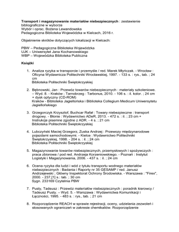 Transport i magazynowanie materiałów niebezpiecznych : zestawienie bibliograficzne w wyborze Wybór i oprac. Bożena Lewandowska Pedagogiczna Biblioteka Wojewódzka w Kielcach, 2016 r. Objaśnienie skrótów dotyczących lokalizacji w Kielcach: PBW – Pedagogiczna Biblioteka Wojewódzka UJK – Uniwersytet Jana Kochanowskiego WBP – Wojewódzka Biblioteka Publiczna Książki 1. Analiza ryzyka w transporcie i przemyśle / red. Marek Młyńczak. - Wrocław : Oficyna Wydawnicza Politechniki Wrocławskiej, 1997. - 133 s. : rys., tab. ; 24 cm Biblioteka Politechniki Świętokrzyskiej 2. Bębnowski, Jan : Przewóz towarów niebezpiecznych : materiały szkoleniowe. – Wyd. 8. - Kraków ; Tarnobrzeg : Tarbonus, 2010. - 106 s. : il. kolor. ; 24 cm + dysk optyczny (CD-ROM) Kraków - Biblioteka Jagiellońska i Biblioteka Collegium Medicum Uniwersytetu Jagiellońskiego 3. Grzegorczyk Krzysztof, Buchcar Rafał : Towary niebezpieczne : transport drogowy. - Błonie : Wydawnictwo ADeR, 2013. - 472 s. : il. ; 23 cm + Instrukcje pisemne zgodne z ADR. - 4 s. ; 21 cm Biblioteka Politechniki Świętokrzyskiej 4. Lubczyński Maciej Grzegorz, Zuska Andrzej : Przewozy międzynarodowe pojazdami samochodowymi. - Kielce : Wydawnictwo Politechniki Świętokrzyskiej, 1998. - 204 s. : il. ; 24 cm Biblioteka Politechniki Świętokrzyskiej 5. Magazynowanie towarów niebezpiecznych, przemysłowych i spożywczych : praca zbiorowa / pod red. Andrzeja Korzeniowskiego. - Poznań : Instytut Logistyki i Magazynowania, 2006. - 437 s. : il. ; 24 cm 6. Ocena ryzyka dla ludzi i wód z tytułu transportu wodnego materiałów niebezpiecznych : Badania i Raporty nr 35 GESAMP / red. Janusz Andrzejewski ; Główny Inspektorat Ochrony Środowiska. - Warszawa : "Firex", 2000. - 237,[1] s.: tab. ; 30 cm Sygn. 233169 Czytelnia PBW 7. Pusty, Tadeusz : Przewóz materiałów niebezpiecznych : poradnik kierowcy / Tadeusz Pusty. – Wyd. 5. - Warszawa : Wydawnictwa Komunikacji i Łączności, 1995. - 483 s. : rys., tab. ; 21 cm 8. Rozporządzenie REACH w sprawie rejestracji, oceny, udzielania zezwoleń i stosowanych ograniczeń w zakresie chemikaliów. Rozporządzenie Registration, Evaluation and Authorisation of Chemicals. – Warszawa : Ministerstwo Gospodarki, 2008. - 380 s. ; 21 cm Biblioteka Politechniki Świętokrzyskiej WBP 9. Różycki, Marek [et al.] : Bezpieczny transport towarów niebezpiecznych. T. 1, Kurs podstawowy. - Mikołów : PPHU Moritz Marek Różycki, 2008. - 114, [4] s. : il. ; 24 cm Biblioteka Politechniki Świętokrzyskiej 10. Różycki, Marek [et al.] : Bezpieczny transport towarów niebezpiecznych. T. 2, Kursy specjalistyczne : cysterny - klasa 1 - klasa 7. - Mikołów : PPHU Moritz Marek Różycki, [2008]. - 134 s. : il. ; 24 cm Biblioteka Politechniki Świętokrzyskiej 11. Różycki, Marek : Bezpieczny transport towarów niebezpiecznych. - Wyd. 2. T. 3, Niezbędnik praktyków ADR - RID - IMDG, ADR 2009-2010 : wykaz towarów niebezpiecznych . - [S.l. : Redakcja Towary Niebezpieczne, 2008]. 376 s. ; 24 cm 12. Transport drogowy : prawo przewozowe, drogi publiczne, czas pracy kierowców, przewóz towarów niebezpiecznych / [zebr. i oprac.] Tadeusz Fijałkowski ; [współpr. Marlena Fijałkowska-Kopyrska]. - Wyd. 5, stan prawny na 20 sierpnia 2009. - Warszawa : Fotoskład Pracownia Poligraficzna, 2009. .532 s., [12] s. tabl. : il. (w tym kolor.) ; 21 cm Biblioteka Politechniki Świętokrzyskiej 13. Uzarczyk, Andrzej : Czynniki chemiczne : charakterystyka czynników szkodliwych i niebezpiecznych w środowisku pracy / oprac. Andrzej Uzarczyk, Wojciech Zabiegała. - Gdańsk : Ośrodek Doradztwa i Doskonalenia Kadr, 1999. -185 s. : il. ; 21 cm. - Bibliogr. UJK Magazyn-parter Artykuły w czasopismach 14. Bielawski, Rafał : Uwarunkowania prawno ekonomiczne transportu materiałów strategicznych w Polsce / Uniwersytet Humanistyczno-Przyrodniczy Jana Kochanowskiego w Kielcach. - Bibliogr., netogr. - Streszcz. ang. W: Studia i Materiały - Wydział Zarządzania i Administracji. Uniwersytet HumanistycznoPrzyrodniczy Jana Kochanowskiego w Kielcach. - R. 18, nr 4 (2014), s. 287294 15. Biesok Grzegorz, Wyród-Wróbel Jolanta : Bezpieczeństwo transportu w opinii kierowców przewożących materiały niebezpieczne. W: Logistyka. - 2010, nr 1, s. 47-50 WBP 16. Bojar Piotr, Woropay Maciej : Analiza zagrożeń związanych z przewozem drogowym materiałów niebezpiecznych / Uniwersytet TechnologicznoPrzyrodniczy w Bydgoszczy, Wyższa Szkoła Techniki i Przedsiębiorczości we Włocławku. - Streszcz. ang. W: Studia i Materiały Polskiego Stowarzyszenia Zarządzania Wiedzą. - Nr 45 (2011), s. 23-32. – Bibliogr. 17. Celczyńska, Anna : Wykonywanie przewozów materiałów niebezpiecznych transportem samochodowym w Polsce. - Zeszyt Naukowy / Wyższa Szkoła Finansów i Informatyki im. prof. Janusza Chechlińskiego. Wydział Ekonomii w Kaliszu. - Nr 8 (2007), s. 33-49 Substancje niebezpieczne i szkodliwe - transport - prawo - Polska - stan na 2007 r. Substancje niebezpieczne i szkodliwe - transport - prawo międzynarodowe - stan na 2007 r. Transport samochodowy - Polska - od 1989 r. 18. Giercuszkiewicz-Bajtlik Mieczysława, Gworek Barbara : Ocena ryzyka środowiskowego stwarzanego przez produkty biobójcze - Streszcz. ang. W: Ochrona Środowiska i Zasobów Naturalnych. - Nr 32 (2007), s. 276-288 Substancje niebezpieczne i szkodliwe - wpływ na środowisko. 19. Gronowicz, Jan : Zagrożenie środowiska przewozem towarów niebezpiecznych w transporcie kolejowym. - Streszcz. w jęz. ang. W: Zeszyty Naukowe. Transport / Politechnika Śląska. - Z. 49, (2003), s. 139-150 20. Grzegorczyk, Krzysztof : Prawo w przewozie drogowym materiałów niebezpiecznych. W: Atest. - 1999, nr 2, s. 20-22 21. Gwiazda, Hanna : Intermodalne technologie transportu ładunków niebezpiecznych / Hanna Gwiazda. - Streszcz. w jęz. ros. ang. fr. niem. W: Prace Centrum Naukowo-Technicznego Kolejnictwa. - Z. 115, (1996), s. 34-37 22. Hancyk, Bolesław : Co z doradcami 