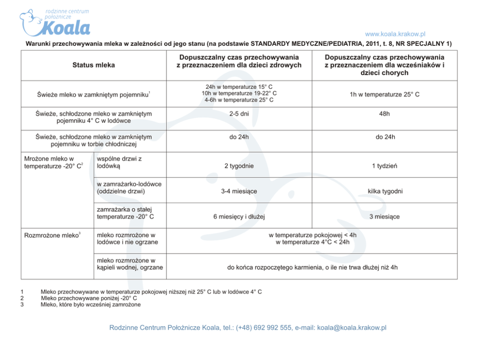 www.koala.krakow.pl Warunki przechowywania mleka w zależności od jego stanu (na podstawie STANDARDY MEDYCZNE/PEDIATRIA, 2011, t. 8, NR SPECJALNY 1) Dopuszczalny czas przechowywania z przeznaczeniem dla dzieci zdrowych Status mleka 24h w temperaturze 15° C 10h w temperaturze 19-22° C 4-6h w temperaturze 25° C 1h w temperaturze 25° C Świeże, schłodzone mleko w zamkniętym pojemniku 4° C w lodówce 2-5 dni 48h Świeże, schłodzone mleko w zamkniętym pojemniku w torbie chłodniczej do 24h Ido 24h 2 tygodnie 1 tydzień 3-4 miesiące ikilka tygodni 6 miesięcy i dłużej 3 miesiące Świeże mleko w zamkniętym pojemniku Mrożone mleko w 2 temperaturze -20° C 1 wspólne drzwi z lodówką w zamrażarko-lodówce (oddzielne drzwi) zamrażarka o stałej temperaturze -20° C Rozmrożone mleko 3 mleko rozmrożone w lodówce i nie ogrzane mleko rozmrożone w kąpieli wodnej, ogrzane 1 2 3 Dopuszczalny czas przechowywania z przeznaczeniem dla wcześniaków i dzieci chorych w temperaturze pokojowej < 4h w temperaturze 4°C < 24h ido końca rozpoczętego karmienia, o ile nie trwa dłużej niż 4h Mleko przechowywane w temperaturze pokojowej niższej niż 25° C lub w lodówce 4° C Mleko przechowywane poniżej -20° C Mleko, które było wcześniej zamrożone Rodzinne Centrum Położnicze Koala, tel.: (+48) 692 992 555, e-mail: [email protected]