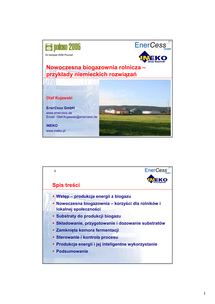 1 22 listopad 2006 Poznań Nowoczesna biogazownia rolnicza – przykłady niemieckich rozwiązań Olaf Kujawski EnerCess GmbH www.enercess.de Email: [email protected] INEKO www.ineko.pl 2 Spis treści Wstęp – produkcja energii z biogazu Nowoczesna biogazownia – korzyści dla rolników i lokalnej społeczności Substraty do produkcji biogazu Składowanie, przygotowanie i dozowanie substratów Zamknięta komora fermentacji Sterowanie i kontrola procesu Produkcja energii i jej inteligentne wykorzystanie Podsumowanie 1 3 Wstęp – produkcja energii z biogazu sieć ciepłownicza SEE budynki gospodarcze energia elektryczna energia cieplna budynek mieszkalny biogaz dozownik automatyczny kogenerator nawóz po fermentacji zbiornik magazynowy na gnojowicę zamknięta komora fermentacji zamknięta komora fermentacji > 70 °C > 60 min kosubstraty SEE – sieć elektroenergetyczna zbiornik końcowy na przefermentowane substraty higienizacja 4 Wstęp – produkcja energii z biogazu sieć ciepłownicza energia elektryczna SEESterowanie ! budynki gospodarcze energia cieplna budynek mieszkalny biogaz dozownik automatyczny kogenerator nawóz po fermentacji zbiornik magazynowy na gnojowicę zamknięta komora fermentacji zamknięta komora fermentacji > 70 °C > 60 min kosubstraty SEE – sieć elektroenergetyczna higienizacja zbiornik końcowy na przefermentowane substraty 2 5 Nowoczesna biogazownia dla rolników i lokalnej społeczności Korzyści • Zyski ze sprzedaŜy energii elektrycznej i ciepła dla właścicieli biogazowni • Tani i wartościowy nawóz dla rolników Azot w łatwiej przyswajalnej formie NH4-N Redukcja zjawiska wypalania roślin (gnojowica) • Nowe miejsca pracy • Przychody z tytułu podatków dla lokalnej administracji • Redukcja emisji metanu (CH4) do atmosfery • Redukcja emisji dwutlenku węgla (CO2) do atmosfery • Redukcja emisji zapachów (np: bliskie zabudowania, obszary chronione) 6 Substraty do produkcji biogazu - surowce odnawialne Odpady z produkcji rolniczej np: gnojowica bydlęca, gnojowica świńska obornik bydlęcy, obornik ptasi odpady zboŜowe i inne odpady roślinne Rośliny energetyczne np: pszenica, pszenŜyto, kukurydza (kiszonka), jęczmień, rzepak lucerna, trawa sudańska ziemniak, burak pastewny 3 7 Substraty do produkcji biogazu - kosubstraty Odpady z przemysłu spoŜywczego odpady warzyw odpady z produkcji Ŝelatyny, skrobi odpadki chleba i ciast (np: piekarnie, cukiernie) odpady tłuszczy i serów wytłoki owoców i winogron wywar gorzelniany, wysłodziny browarniane odpady poubojowe Inne odpady organiczne odpady Ŝywności (np: stołówki, restauracje) odpady paszy gliceryna 8 Substraty do produkcji biogazu - potencjał Potencjał produkcji energii z biogazu (FNR, 2005): Niemcy • Potencjał produkcji: • Moc zainstalowana (2005): > 10.000 MW 17 % produkcji energii około 500 MW Unia europejska (EU-25)1 • Potencjał produkcji: 469 bilion m3 CH4/a • Całkowita rosyjska produkcja gazu: 636 bilion m3 CH4/a 1 EU 25: Austria, Belgia, Czechy, Cypr, Dania, Estonia, Finlandia, Francja, Niemcy, Grecja, Węgry, Irlandia, Włochy, Litwa, Łotwa, Luxemburg, Malta, Niderlandy, Polska, Portugalia, Słowacja, Słowenia, Hiszpania, Szwecja, Wielka Brytania 4 9 Składowanie, przygotowanie i dozowanie substratów Przykłady: • Silos przejazdowy dozownik substratów stałych (np: rośliny energetyczne) • Zbiornik magazynowy pompa dozująca (np: gnojowica) • Hala + zbiornik magazynowy higienizacja pompa dozująca (np: odpady spoŜywcze) Automatyzacja procesu dozowania i przygotowania substratów oznacza w praktyce: + mniejszy nakład pracy + lepszą kontrolę dozowania substratów + niŜsze ryzyko destabilizacji procesu 10 Zamknięta komora fermentacji Zalety nowoczesnej techniki: • Wypróbowana konstrukcja zbiorników i materiały budowlane niskie koszty inwestycyjne, bezawaryjność • Efektywne mieszanie (dwa mieszadła w zbiorniku) optymalny rozkład substratów w zbiorniku, niskie koszty eksploatacyjne 5 11 Zamknięta komora fermentacji Zalety nowoczesnej techniki: • Reaktor przepływowy dwu-zbiornikowy (2 x ZKF) dowolne dozowanie, optymalne wykorzystanie pojemności, optymalne warunki dla produkcji biogazu, lepsza stabilność procesu • Centralna pompownia ułatwione i optymalne sterowanie biogazownią • Nowoczesna technika pomiarowa nadzór, kontrola procesu fermentacji 12 Zamknięta komora fermentacji technika pomiarowa Pomiary online • Zawartość komory: sucha pozostałość, pH, RedOx, temperatura, stopień napełnienia, czujnik napełnienia maksymalnego, zuŜycie energii (np. mieszanie) • Zintegrowany zbiornik biogazu: objętość gazu • Zasilanie kogeneratora: przepływ biogazu, monitorowanie zagroŜenia wybuchem, skład biogazu (CH4, CO2, O2, H2S) Pomiary offline (mini laboratorium) • Chemiczne zapotrzebowanie tlenu (ChZT), azot amonowy (NH4-N), kwasy organiczne (ekwiwalent kwasu octowego), kwasowość (ks) 6 13 Sterowanie i kontrola procesu produkcji biogazu Sterowanie komputerowe najnowszy stan techniki Funkcje: obsługa, kontrola, meldowanie, raportowanie, archiwizacja, zatwierdzanie Centralna archiwizacja wszystkich danych Zdalne sterowanie i kontrola Zapisywanie kaŜdego „Bitu“ informacji 14 Zalety zastosowania sterowania oraz nadzoru biogazowni Zautomatyzowanie większości procesów • Maksymalne wykorzystanie istniejących potencjałów • Lepsza kontrola i niezawodność dla obsługi Analiza i wizualne przedstawienie wyników pomiarów • WyŜszy stopień zrozumienia procesu produkcji biogazu (przejrzystość) Instrukcje oraz wsparcie przy podejmowaniu decyzji Funkcje alarmowe i ostrzegawcze Doradztwo (analizy naukowe) 7 15 Produkcja energii i jej inteligentne wykorzystanie Skojarzona produkcja energii cieplnej i elektrycznej Maksymalne wykorzystanie energii pierwotnej Zastosowanie wysokiej jakości kogeneratorów Nieprzerwana produkcja energii równieŜ przy niskiej zawartości metanu Zastosowanie najn
