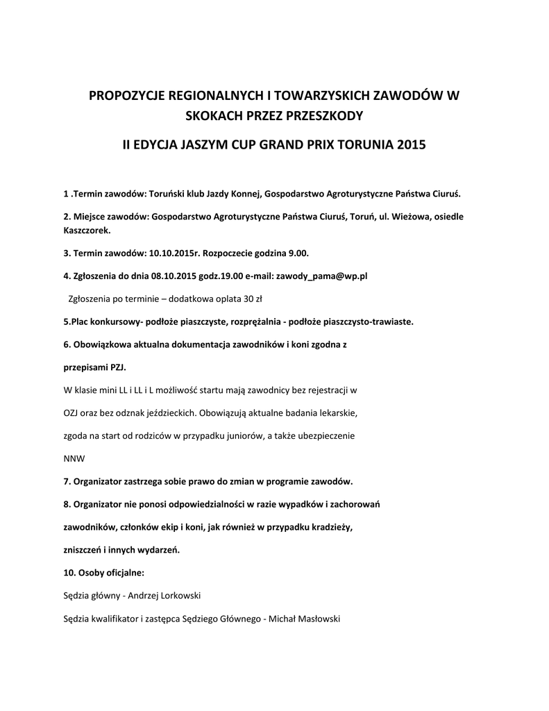 PROPOZYCJE REGIONALNYCH I TOWARZYSKICH ZAWODÓW W SKOKACH PRZEZ PRZESZKODY II EDYCJA JASZYM CUP GRAND PRIX TORUNIA 2015 1 .Termin zawodów: Toruński klub Jazdy Konnej, Gospodarstwo Agroturystyczne Państwa Ciuruś. 2. Miejsce zawodów: Gospodarstwo Agroturystyczne Państwa Ciuruś, Toruń, ul. Wieżowa, osiedle Kaszczorek. 3. Termin zawodów: 10.10.2015r. Rozpoczecie godzina 9.00. 4. Zgłoszenia do dnia 08.10.2015 godz.19.00 e-mail: [email protected] Zgłoszenia po terminie – dodatkowa oplata 30 zł 5.Plac konkursowy- podłoże piaszczyste, rozprężalnia - podłoże piaszczysto-trawiaste. 6. Obowiązkowa aktualna dokumentacja zawodników i koni zgodna z przepisami PZJ. W klasie mini LL i LL i L możliwość startu mają zawodnicy bez rejestracji w OZJ oraz bez odznak jeździeckich. Obowiązują aktualne badania lekarskie, zgoda na start od rodziców w przypadku juniorów, a także ubezpieczenie NNW 7. Organizator zastrzega sobie prawo do zmian w programie zawodów. 8. Organizator nie ponosi odpowiedzialności w razie wypadków i zachorowań zawodników, członków ekip i koni, jak również w przypadku kradzieży, zniszczeń i innych wydarzeń. 10. Osoby oficjalne: Sędzia główny - Andrzej Lorkowski Sędzia kwalifikator i zastępca Sędziego Głównego - Michał Masłowski Sędzia - Aleksandra Oczachowska Sędzia/ komisarz - Ewa Burdzy Gospodarz toru - Piotr Masłowski Obsługa komputerowa - Piotr Masłowski Sprawy organizacyjne - Sławomir Ciuruś tel.660 423 039 11. Opłaty: Wpisowe: 100 zl od konia za całe zawody, 50 zł od konia za całe zawody dla wszystkich koni zawodników TKJK. Startowe: 10zł od konia za start w Jaszym Cup. Startowe w całości przeznaczone będzie na nagrodę - w postaci bonu na sprzęt jeździecki- dla zwycięscy konkursu finalowego . 12. PROGRAM ZAWODÓW: 10.10.2015 r. (sobota godz. 9.00) KONKURS nr.1 mini LL -z trafieniem w normę czasu (towarzyski) KONKURS nr.2 kl. LL-z trafieniem w normę czasu (towarzyski) KONKURS nr 3. kl. L- dwufazowy art.274.5.3 (towarzystki) KONKURS nr 4. kl. L- LICENCYJNY art.238.1.1 KONKURS nr 5.kl. P – zwykły z rozgrywką art.238.2.2 - Finał Jaszym Cup Grand Prix Torunia KONKURS nr.6. kl. N-zwykły art.238.2.1 Szczegóły zasad rozgrywania Jaszym Cup Grand Prix Torunia na stronie internetowej www.tkjk.pl. 13. NAGRODY: W konkursach nr 1, 2 i 3 - nagrody rzeczowe. W konkursie nr 5 - nagrody finasowe - I miejsce 400 pln, II miejsce - 250 pln, III miejsce - 150 pln, IV miejsce - 100 pln, V miejsce - 50 pln. W konkursie nr 6 - nagrody finasowe - I miejsce - 500 pln, II miejsce - 300 pln, III miejsce miejsce - 150 pln, V miejsce 100 pln. W konkursie Licencyjnym - flo. We wszystkich pozostałych konkursach flo, puchary. - 200 pln, IV Polski Związek Jeździecki prosi wszystkie osoby zaangażowane w jakikolwiek sposób w sporty konne o przestrzeganie przedstawionego poniżej kodeksu oraz zasady, że dobro konia jest najważniejsze. Kodeks Postępowania z Koniem: I. Na wszystkich etapach treningu i przygotowań konia do startu w zawodach, dobro konia musi stać ponad wszelkimi innymi wymaganiami. Dotyczy to stałej opieki, metod treningu, starannego obrządku, kucia, transportu. II. Konie i jeźdźcy musza być wytrenowani, kompetentni i zdrowi zanim wezmą udział w zawodach. Odnosi się to także do podawania leków i środków medycznych, zabiegów chirurgicznych zagrażających dobru konia lub ciąży klaczy, oraz do przypadków nadużywania pomocy. III. Zawody nie mogą zagrażać dobru konia. Wymaga to zwrócenia szczególnej uwagi na teren zawodów, powierzchnie podłoża, pogodę, warunki stajenne, kondycje koni i ich bezpieczeństwo także podczas podróży powrotnej z zawodów. IV. Należy dołożyć wszelkich starań, aby zapewnić koniom staranna opiekę po zakończeniu zawodów, a także humanitarne traktowanie po zakończeniu kariery sportowej. Dotyczy to właściwej opieki weterynaryjnej obrażeń odniesionych na zawodach, spokojnej starości, ewentualnej eutanazji. SERDECZNIE ZAPRASZAMY. Propozycje zatwierdzone przez KPZJ dnia 24.09.2015 - Krzysztof Kierzek