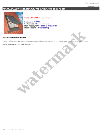 Informacje o produkcie Utworzono 04-03-2017 MARKIZA ZEWNĘTRZNA OKPOL AMZ/AMW 55 x 78 cm Cena : 191,88 zł (netto: 156,00 zł) MARKIZA ZEWNĘTRZNA AMZ/AMW er m ar k Producent : OKPOL Dostępność : Na zamówienie Stan magazynowy : brak w magazynie Średnia ocena : brak recenzji Tkanina z włókna szklanego, odpornego na działanie czynników atmosferycznych, chroni poddasze przed nadmiernym nasłonecznieniem. w at Rozmiar okna - wymiar: szer. x wys. [cm] 55 x 78 Wygenerowano w programie www.oscGold.com