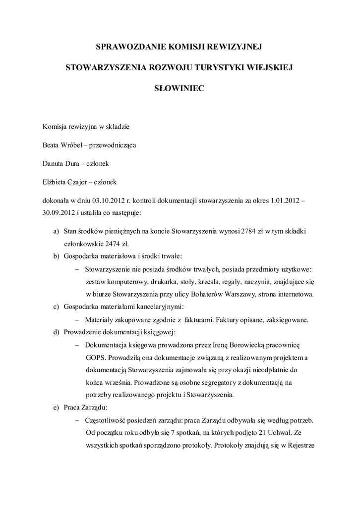SPRAWOZDANIE KOMISJI REWIZYJNEJ STOWARZYSZENIA ROZWOJU TURYSTYKI WIEJSKIEJ SŁOWINIEC Komisja rewizyjna w składzie Beata Wróbel – przewodnicząca Danuta Dura – członek Elżbieta Czajor – członek dokonała w dniu 03.10.2012 r. kontroli dokumentacji stowarzyszenia za okres 1.01.2012 – 30.09.2012 i ustaliła co następuje: a) Stan środków pieniężnych na koncie Stowarzyszenia wynosi 2784 zł w tym składki członkowskie 2474 zł. b) Gospodarka materiałowa i środki trwałe: Stowarzyszenie nie posiada środków trwałych, posiada przedmioty użytkowe: zestaw komputerowy, drukarka, stoły, krzesła, regały, naczynia, znajdujące się w biurze Stowarzyszenia przy ulicy Bohaterów Warszawy, strona internetowa. c) Gospodarka materiałami kancelaryjnymi: Materiały zakupowane zgodnie z fakturami. Faktury opisane, zaksięgowane. d) Prowadzenie dokumentacji księgowej: Dokumentacja księgowa prowadzona przez Irenę Borowiecką pracownicę GOPS. Prowadziłą ona dokumentacje związaną z realizowanym projektem a dokumentacją Stowarzyszenia zajmowała się przy okazji nieodpłatnie do końca września. Prowadzone są osobne segregatory z dokumentacją na potrzeby realizowanego projektu i Stowarzyszenia. e) Praca Zarządu: Częstotliwość posiedzeń zarządu: praca Zarządu odbywała się według potrzeb. Od początku roku odbyło się 7 spotkań, na których podjęto 21 Uchwał. Ze wszystkich spotkań sporządzono protokoły. Protokoły znajdują się w Rejestrze Protokołów. Podjęte uchwały przez Zarząd w Rejestrze Uchwał. Wszystkie podjęte uchwały i zamierzenia Zarządu zostały realizowane na bieżąco. f) Działalność Stowarzyszenia: Gospodarka Stowarzyszenia jest zgodna z przedstawioną dokumentacją. Organizacja imprez i spotkań – Stowarzyszenie wywiązywało się w pełni z założeń statutowych odnośnie promocji. Ważniejsze imprezy, spotkania: Z dniem 16.01.2012 Stowarzyszenie podpisało umowę najmu z GOSiR w Smołdzinie na wynajem pomieszczenia na biuro na okres 3 lat – odpłatność 1,23 zł/m2 plus woda + ścieki(sprawdzony przykładowy rachunek z msc. sierpnia 2012 r. – 43,40 zł). Dnia 31.01.2012 odbyło się Walne Zgromadzenie Członków Stowarzyszenia w nowo wyremontowanym pomieszczeniu. Na walnym zebraniu podjęto 6 uchwał. Warsztaty Rozmaitości 13.02.2012 – ozdoby świąteczne 20.02.2012 – haft krzyżykowy – kartki 27.02.2012 – ozdobne opakowania Oferty świąteczne Stowarzyszenia Rozwoju Turystyki Wiejskiej Słowiniec w Smołdzinie – organizacja imprez rodzinnych Projekt – nabór do projektu: Turystyka w zgodzie z naturą – BIS Dnia 10.03.2012 – udział w Babskim Świętowaniu w Zespole SzkolnoPrzedszkolnym. Zorganizowano stoisko wystawiennicze na którym zaprezentowano rezultaty Warsztatów Rozmaitości. W dniach 13.04-15.04.2012 udział w Targach Turystyki w Gdańsku w konkursie kulinarnym wystawiono 11 potraw z 6 gospodarstw. Zdobyliśmy I miejsce za o kiełbasę z komina – p. Artur Skalski, o nalewkę z jarzębiny – p. Renata Knitter Dwa III miejsca za o pierogi – p. Janina Hydzik o pasztet z suszonymi pomidorami – p. Artur Skalski oraz cztery wyróżnienia: o rolada z kurczaka – p. Iwona Barczyk o rolada ze szpinakiem – p. Ula Ostapko o uda ze śliwką – p. Danuta Dura o Juki Słupskie – p. Renata Knitter Stowarzyszenie otrzymało po raz trzeci nagrodę w konkursie na Najciekawsze Stoisko Giełdy Agroturystycznej. Targi w Kielcach – IV Międzynarodowe Targi Turystyki Wiejskiej i Agroturystyki pod patronatem Prezydenta B. Komorowskiego o Wyróżnienie w kat. „Najciekawsze stoisko.” Zadanie Publiczne rozliczone dn. 25.05.2012 r. na Sesji Rady Gminy. 6 czerwca 2012 r. Stowarzyszenie wystawia stoisko promocyjne na imprezie „Wojna o Wydmy Łeba-Smołdzino” 16.06.2012 – udział w imprezie w zorganizowanej na plaży SPN dla dzieci i młodzieży szkolnej. Stowarzyszenie wystawiło stoisko promocyjne, można było posmakować wypieków oraz nabyć ulotkę promocyjną 21.07.2012 r. – Stowarzyszenie wraz z UG Smołdzino wystawiło stoisko promocyjne na imprezie w Słupsku. Zgłoszono do konkursu 6 potraw w konkursie Smaki Pomorza. Zakwalifikowaliśmy się do finału. Dnia 28.07. – udział w Smołdzińskim Jarmarku Integracyjnym w Smołdzińskim Lesie. Prezentacja całego dorobku Stowarzyszenia, pań z Koła Hafciarskiego, Glinianej Zagrody. Była możliwość degustacji potraw, rozdawano materiały promocyjne 18.08.2012 – udział w Podsumowaniu prezentacji Gmin Powiatu Słupskiego podczas eliminacji i finału w trakcie Święta Ryby. W kat. Prezentacja Gminy zajęliśmy I msc. Otrzymaliśmy puchar i dyplom. 01.09.2012 – udział stowarzyszenia w Gminnym Święcie Plonów w miejscowości Czysta. Stowarzyszenie wystawiło stoisko promocyjne oraz przygotowało poczęstunek dla społeczności lokalnej. Wójt Gminy Smołdzino na ręce p. prezes Renaty Knitter złożyła serdeczne podziękowania za trud włożony w promowanie ziemi smołdzińskiej oraz przekazała nagrodę pieniężną na rzecz Stowarzyszenie. Nagroda została przeznaczona na zakup zastawy stołowej. 14.09.2012 nastąpiło uroczyste podsumowanie projektu Turystyka w zgodzie z naturą – BIS w Centrum Kultury w Smołdzinie. g) Aktywność członkowska: W pracach na rzecz Stowarzyszenia bardzo aktywnie bierze udział mała grupa jego członków. To dzięki nim nasze Stowarzyszenie zdobywało nagrody, wyróżnienia, jest widoczne w społeczności lokalnej i w skali kraju. Należy zatem zachęcić pozostałych członków Stowarzyszenia aby zaangażowali się bardziej w pracę na rzecz wspólnego dobra jakim jest Stowarzyszenie i nie ograniczało się jedynie do opłacanie składek. h) Wnioski Po Przeprowadzeniu kontroli działalności Zarządu Stowarzyszenia Komisja Rewizyjna nie stwierdziła nieprawidłowości zarówno pod względem finansowym jak i merytorycznym. W związku z powyższym Komisja wnosi o udzielenie Zarządu absolutorium za 