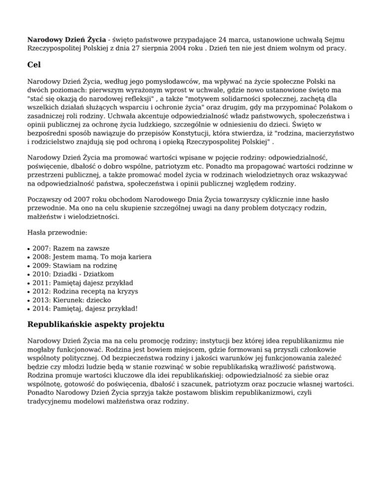 Narodowy Dzień Życia - święto państwowe przypadające 24 marca, ustanowione uchwałą Sejmu Rzeczypospolitej Polskiej z dnia 27 sierpnia 2004 roku . Dzień ten nie jest dniem wolnym od pracy. Cel Narodowy Dzień Życia, według jego pomysłodawców, ma wpływać na życie społeczne Polski na dwóch poziomach: pierwszym wyrażonym wprost w uchwale, gdzie nowo ustanowione święto ma "stać się okazją do narodowej refleksji" , a także "motywem solidarności społecznej, zachętą dla wszelkich działań służących wsparciu i ochronie życia" oraz drugim, gdy ma przypominać Polakom o zasadniczej roli rodziny. Uchwała akcentuje odpowiedzialność władz państwowych, społeczeństwa i opinii publicznej za ochronę życia ludzkiego, szczególnie w odniesieniu do dzieci. Święto w bezpośredni sposób nawiązuje do przepisów Konstytucji, która stwierdza, iż "rodzina, macierzyństwo i rodzicielstwo znajdują się pod ochroną i opieką Rzeczypospolitej Polskiej" . Narodowy Dzień Życia ma promować wartości wpisane w pojęcie rodziny: odpowiedzialność, poświęcenie, dbałość o dobro wspólne, patriotyzm etc. Ponadto ma propagować wartości rodzinne w przestrzeni publicznej, a także promować model życia w rodzinach wielodzietnych oraz wskazywać na odpowiedzialność państwa, społeczeństwa i opinii publicznej względem rodziny. Począwszy od 2007 roku obchodom Narodowego Dnia Życia towarzyszy cyklicznie inne hasło przewodnie. Ma ono na celu skupienie szczególnej uwagi na dany problem dotyczący rodzin, małżeństw i wielodzietności. Hasła przewodnie: ● ● ● ● ● ● ● ● 2007: Razem na zawsze 2008: Jestem mamą. To moja kariera 2009: Stawiam na rodzinę 2010: Dziadki - Dziatkom 2011: Pamiętaj dajesz przykład 2012: Rodzina receptą na kryzys 2013: Kierunek: dziecko 2014: Pamiętaj, dajesz przykład! Republikańskie aspekty projektu Narodowy Dzień Życia ma na celu promocję rodziny; instytucji bez której idea republikanizmu nie mogłaby funkcjonować. Rodzina jest bowiem miejscem, gdzie formowani są przyszli członkowie wspólnoty politycznej. Od bezpieczeństwa rodziny i jakości warunków jej funkcjonowania zależeć będzie czy młodzi ludzie będą w stanie rozwinąć w sobie republikańską wrażliwość państwową. Rodzina promuje wartości kluczowe dla idei republikańskiej: odpowiedzialność za siebie oraz wspólnotę, gotowość do poświęcenia, dbałość i szacunek, patriotyzm oraz poczucie własnej wartości. Ponadto Narodowy Dzień Życia sprzyja także postawom bliskim republikanizmowi, czyli tradycyjnemu modelowi małżeństwa oraz rodziny.