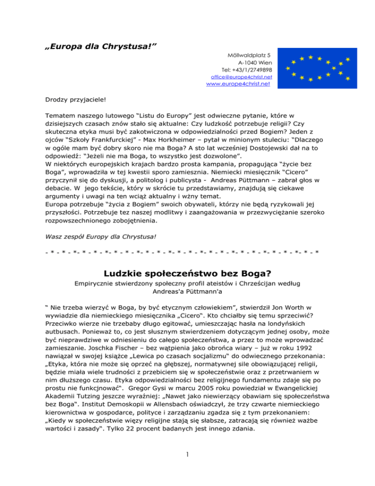 „Europa dla Chrystusa!” Möllwaldplatz 5 A-1040 Wien Tel: +43/1/2749898 [email protected] www.europe4christ.net Drodzy przyjaciele! Tematem naszego lutowego “Listu do Europy” jest odwieczne pytanie, które w dzisiejszych czasach znów stało się aktualne: Czy ludzkość potrzebuje religii? Czy skuteczna etyka musi być zakotwiczona w odpowiedzialności przed Bogiem? Jeden z ojców “Szkoły Frankfurckiej” - Max Horkheimer – pytał w minionym stuleciu: “Dlaczego w ogóle mam być dobry skoro nie ma Boga? A sto lat wcześniej Dostojewski dał na to odpowiedź: “Jeżeli nie ma Boga, to wszystko jest dozwolone”. W niektórych europejskich krajach bardzo prosta kampania, propagująca “życie bez Boga”, wprowadziła w tej kwestii sporo zamiesznia. Niemiecki miesięcznik “Cicero” przyczynił się do dyskusji, a politolog i publicysta - Andreas Püttmann – zabrał głos w debacie. W jego tekście, który w skrócie tu przedstawiamy, znajdują się ciekawe argumenty i uwagi na ten wciąż aktualny i wżny temat. Europa potrzebuje “życia z Bogiem” swoich obywateli, którzy nie będą ryzykowali jej przyszłości. Potrzebuje tez naszej modlitwy i zaangażowania w przezwyciężanie szeroko rozpowszechnionego zobojętnienia. Wasz zespół Europy dla Chrystusa! - * - * - *- * - * - *- * - * - *- * - * - *- * - * - *- * - * - *- * - * - *- * - * - *- * - * Ludzkie społeczeństwo bez Boga? Empirycznie stwierdzony społeczny profil ateistów i Chrześcijan według Andreas'a Püttmann'a “ Nie trzeba wierzyć w Boga, by być etycznym człowiekiem”, stwierdził Jon Worth w wywiadzie dla niemieckiego miesięcznika „Cicero“. Kto chciałby się temu sprzeciwić? Przeciwko wierze nie trzebaby długo egitować, umieszczając hasła na londyńskich autbusach. Ponieważ to, co jest słusznym stwierdzeniem dotyczącym jednej osoby, może być nieprawdziwe w odniesieniu do całego społeczeństwa, a przez to może wprowadzać zamieszanie. Joschka Fischer – bez wątpienia jako obrońca wiary – już w roku 1992 nawiązał w swojej książce „Lewica po czasach socjalizmu“ do odwiecznego przekonania: „Etyka, która nie może się oprzeć na głębszej, normatywnej sile obowiązującej religii, będzie miała wiele trudności z przebiciem się w społeczeństwie oraz z przetrwaniem w nim dłuższego czasu. Etyka odpowiedzialności bez religijnego fundamentu zdaje się po prostu nie funkcjnować“. Gregor Gysi w marcu 2005 roku powiedział w Ewangelickiej Akademii Tutzing jeszcze wyraźniej: „Nawet jako niewierzący obawiam się społeczeństwa bez Boga“. Institut Demoskopii w Allensbach oświadczył, że trzy czwarte niemieckiego kierownictwa w gospodarce, polityce i zarządzaniu zgadza się z tym przekonaniem: „Kiedy w społeczeństwie więzy religijne stają się słabsze, zatracają się również ważbe wartości i zasady“. Tylko 22 procent badanych jest innego zdania. 1 Przekonania i praktyki religijne nie są w gruncie rzeczy wyizolowaną częścią życia. Przenikają bowiem – świadomie lub nieświadomie – ludzką egzystencję we wszystkich jej wymiarach: w życiu rodzinnym, jako chłopak, albo dziewczyna, jako ojciec lub matka, w środowisku pracy, jako członek pewnej społeczności, sąsiad, jako podmiot gospodarczy oraz obywatel. Przekonania religijne wpływają na sposób myślenia, odczuwania, a także postępowania; na poglądy i moralność, na świadomość wartości i anty-wartości. (…) Obraz świata i moralność ateizmu Wyniki empirycznego badania społeczeństwa w dzisiejszych czasach nie pozwalają powiedzieć na temat duchowo – moralnego profilu obywateli bezwyznaniowych oraz zadeklarowanych ateistów zbyt wielu pochlebnych stwierdzeń. Ogólnie mówiąc ateiści są nastawieni do życia bardziej materialistycznie, egoistycznie i hedonistycznie. Reprezentacyjna ankieta dla przeprowadzonej w 2005 roku analizy mediów w Allensbach skierowała do 14-29-letnich Niemców następujące pytanie: „Co jest ważne w życiu?“. Młodzi ludzie, którzy określają się jako religijni, wymieniali dużo częściej niż niewierzący wartości takie jak: „dobre, wszechstronne wykształcenie“ (72% w porównaniu z 55%), „ciągłe zdobywanie wiedzy“ (69%:54%), „sprawiedliwość społeczna“ (69%:52%), „pomaganie ludziom w potrzebie“ (69%:46%), „posiadanie dzieci“ (61%:42%), „branie odpowiezialności za innych“ (43%:26%), „zadawanie sobie pytania o sens rzeczy“ (45%:19%), „kontakt z naturą“ (38%:22%), „aktywny udział w życiu politycznym“ (14%:7%). Przy dwóch propozycjach odpowiedzi osoby niewierządze zdecydowanie jednak prowadzą: „wysokie dochody“ (49%:37%) i „dobra zabawa, korzystanie życia“ (76%:67%). (...) W Stanach Zjednoczonych członkowie wspólnot wyznaniowych – kościołów i synagog – dużo częściej niż osoby do takich wspólnot nie należące za ważne uznają wydawanie pieniędzy na dobroczynne cele (80%:55%), a także wolontariat (51%:33%). 89 procent badanych, których charakteryzuje głęboka wiara, uważa pomoc cierpiącym ubostwo za bardzo ważną; wśród osób, dla których wiara ma niewielkie lub zerowe znaczenie, pogląd ten podziela zaledwie 52 procent. (...) Już przy podstawowym określaniu etycznych zasad widać wyraźny podział. Według ankiety z maja 2005 roku, przeprowadzonej w Allensnbach, 50 procent osób regularnie chodzących dop kościoła (w porównaniu do zaledwie 32 procent ludzi bezwyznaniowych) uznaje „całkowicie jasne zasady, określające co jest dobre, a co złe. Obowiązują one zawsze i dla każdego człowieka, niezależnie od okoliczności“. Całkiem przeciwne spojrzenie: „Nie może być nigdy całkowicie jasnych zasad, określających co jest dobre, a co złe. Zależy to bowiem zawsze tylko od danych okoliczności“ charakteryzuje 49 procent osób bezwyznaniowych i zaledwie 18 procent praktykujących wiarę katolików i 29 procent ewang