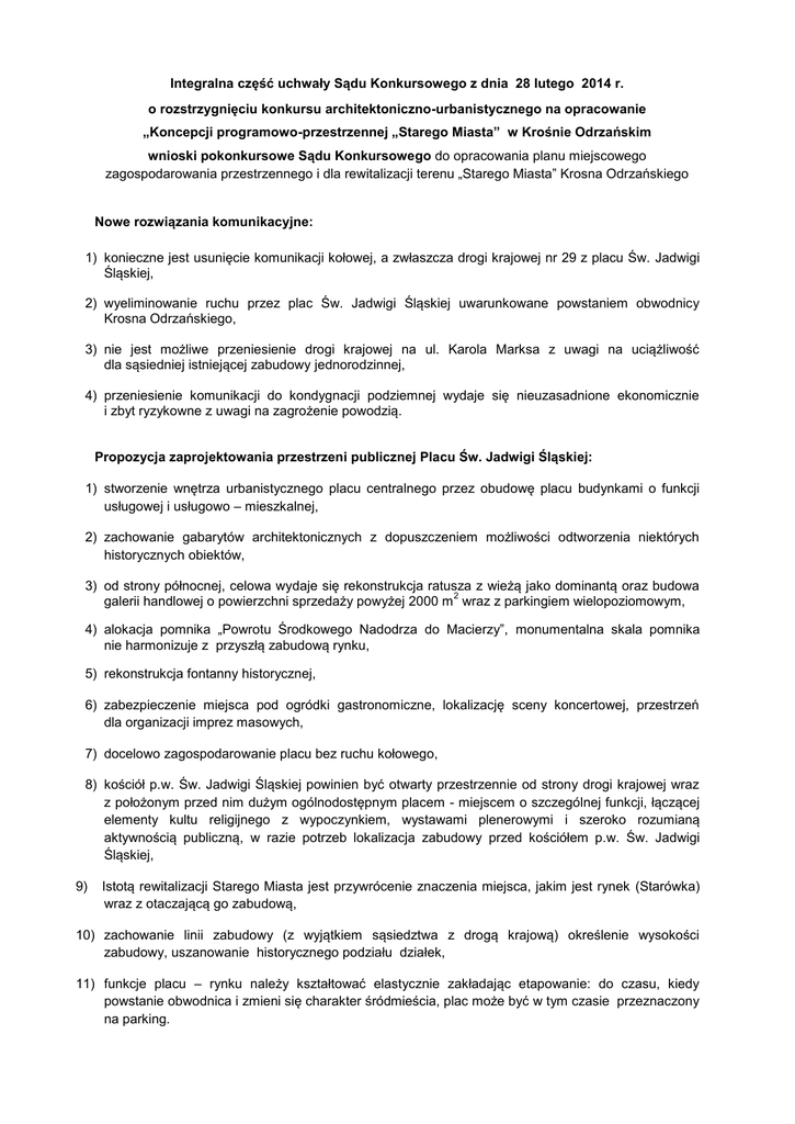 Integralna część uchwały Sądu Konkursowego z dnia 28 lutego 2014 r. o rozstrzygnięciu konkursu architektoniczno-urbanistycznego na opracowanie „Koncepcji programowo-przestrzennej „Starego Miasta” w Krośnie Odrzańskim wnioski pokonkursowe Sądu Konkursowego do opracowania planu miejscowego zagospodarowania przestrzennego i dla rewitalizacji terenu „Starego Miasta” Krosna Odrzańskiego Nowe rozwiązania komunikacyjne: 1) konieczne jest usunięcie komunikacji kołowej, a zwłaszcza drogi krajowej nr 29 z placu Św. Jadwigi Śląskiej, 2) wyeliminowanie ruchu przez plac Św. Jadwigi Śląskiej uwarunkowane powstaniem obwodnicy Krosna Odrzańskiego, 3) nie jest możliwe przeniesienie drogi krajowej na ul. Karola Marksa z uwagi na uciążliwość dla sąsiedniej istniejącej zabudowy jednorodzinnej, 4) przeniesienie komunikacji do kondygnacji podziemnej wydaje się nieuzasadnione ekonomicznie i zbyt ryzykowne z uwagi na zagrożenie powodzią. Propozycja zaprojektowania przestrzeni publicznej Placu Św. Jadwigi Śląskiej: 1) stworzenie wnętrza urbanistycznego placu centralnego przez obudowę placu budynkami o funkcji usługowej i usługowo – mieszkalnej, 2) zachowanie gabarytów architektonicznych z dopuszczeniem możliwości odtworzenia niektórych historycznych obiektów, 3) od strony północnej, celowa wydaje się rekonstrukcja ratusza z wieżą jako dominantą oraz budowa 2 galerii handlowej o powierzchni sprzedaży powyżej 2000 m wraz z parkingiem wielopoziomowym, 4) alokacja pomnika „Powrotu Środkowego Nadodrza do Macierzy”, monumentalna skala pomnika nie harmonizuje z przyszłą zabudową rynku, 5) rekonstrukcja fontanny historycznej, 6) zabezpieczenie miejsca pod ogródki gastronomiczne, lokalizację sceny koncertowej, przestrzeń dla organizacji imprez masowych, 7) docelowo zagospodarowanie placu bez ruchu kołowego, 8) kościół p.w. Św. Jadwigi Śląskiej powinien być otwarty przestrzennie od strony drogi krajowej wraz z położonym przed nim dużym ogólnodostępnym placem - miejscem o szczególnej funkcji, łączącej elementy kultu religijnego z wypoczynkiem, wystawami plenerowymi i szeroko rozumianą aktywnością publiczną, w razie potrzeb lokalizacja zabudowy przed kościółem p.w. Św. Jadwigi Śląskiej, 9) Istotą rewitalizacji Starego Miasta jest przywrócenie znaczenia miejsca, jakim jest rynek (Starówka) wraz z otaczającą go zabudową, 10) zachowanie linii zabudowy (z wyjątkiem sąsiedztwa z drogą krajową) określenie wysokości zabudowy, uszanowanie historycznego podziału działek, 11) funkcje placu – rynku należy kształtować elastycznie zakładając etapowanie: do czasu, kiedy powstanie obwodnica i zmieni się charakter śródmieścia, plac może być w tym czasie przeznaczony na parking. Nowa zabudowa kwartałów: 1) nowa zabudowa powinna uwzględniać historyczny układ urbanistyczny kwartałów, 2) nowa zabudowa powinna posiadać nowoczesny wystrój elewacji, ale nawiązywać do walorów historycznych sąsiedztwa, gabarytów i proporcji podziałów na elewacjach, z zastosowaniem nowoczesnych technologii wykorzystujących szkło, kamień, aluminium, klinkier, drewno, tynk i podobne materiały, z wykluczeniem paneli o fakturze elewacyjnej z sidingu, blachy trapezowej lub blachy falistej, 3) funkcja usługowo - mieszkalna, 4) zagospodarowanie wnętrz kwartałów zielenią i małą architekturą, 5) zagospodarowanie Starówki kwartałami zabudowy z dopuszczeniem kubatury handlowo - usługowej 2 o powierzchni powyżej 2000 m w północnej części placu, 6) zaleca się wprowadzenie dodatkowej funkcji usługowej na terenie przemysłowym, 7) dopuszcza się zabudowę kondygnacji podziemnych z wyłączeniem parkingów. Propozycja alternatywnego zagospodarowania terenu obecnie zabudowanego współczesnymi pawilonami handlowo – usługowymi 1) sugeruje się zabudowę o funkcji handlowo-usługowej i turystycznej, 2) sukcesywna zamiana dysharmonizujących budynków, w tym usługowego przy ul. Słonecznej oraz pawilonów przy ulicy Pocztowej, budynków PKS, budynków przy ulicy Zamkowej na nową zabudowę usługowo-mieszkalną, 3) zaleca się przebudowę (rewitalizację) budynków przy ulicy 22 Lipca, Propozycje zagospodarowania bulwaru nadodrzańskiego od strony północnej i terenów nadodrzańskich w zakolu starego kanału rzeki Odry 1) sugeruje się zabudowę o funkcji usługowo-turystycznej z infrastrukturą techniczną, w tym budowę przystani dla małych jednostek pływających w celu wzbogacenia oferty turystycznej miasta, Lokalizacja miejsc postojowych i parkingów, w tym wielopoziomowych: 1) nie zaleca się parkingów podziemnych, 2) dopuszcza się lokalizację parkingu wielopoziomowego w okolicy rynku głównego i galerii handlowej, 3) parkingi wzdłuż linii rozgraniczających ulice oraz dopuszcza się ich lokalizację wewnątrz kwartałów. Wyznaczenie i zagospodarowanie przestrzeni publicznych, rynku(ów), placów zabaw, rekreacyjno-sportowych, artykułów rzemiosła artystycznego, targowisk i straganów z kwiatami 1) zaleca się ukształtowanie przestrzeni publicznych - wnętrz urbanistycznych: rynku, Placu Solnego, Placu Bolesława Prusa na Rybakach, placu przy Zamku Piastowskim oraz promenady Północnej i Zachodniej jako bulwarów nadbrzeżnych, Rozwiązania zielenią wysoką, niską, wodną, wprowadzenie parku(ów), w tym wytyczne dla istniejącej zieleni. 1) zaleca się pozostawienie wartościowej zieleni wysokiej z możliwością etapowej, ewentualnej wycinki drzew w celu tworzenia zasobów pod zabudowę, 2) umożliwia się wycinkę drzew w miejscach przewidzianych pod inwestycje, 3) wartości krajobrazowe wzbogacone terenami zielonymi mogą stać się ideą pomysłu na szczególny charakter miasta – ogrodu, 4) ciekawa kompozycja zieleni może uzupełnić kwartały zabudowy przewietrzając teren i tworząc zaplecze rekreacyjno-wypoczynkowe, 5) zagospodarowanie kwartałów zielenią z parkingami oraz promenad pó