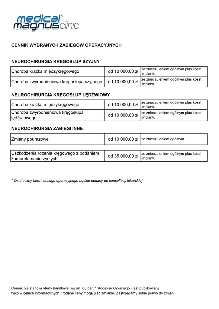 CENNIK WYBRANYCH ZABIEGÓW OPERACYJNYCH NEUROCHIRURGIA KRĘGOSŁUP SZYJNY ze znieczuleniem ogólnym plus koszt Choroba krążka międzykręgowego od 10 000,00 zł implantu Choroba zwyrodnieniowa kręgosłupa szyjnego od 10 000,00 zł implantu ze znieczuleniem ogólnym plus koszt NEUROCHIRURGIA KRĘGOSŁUP LĘDŹWIOWY ze znieczuleniem ogólnym plus koszt Choroba krążka międzykręgowego od 10 000,00 zł implantu Choroba zwyrodnieniowa kręgosłupa lędźwiowego od 10 000,00 zł implantu ze znieczuleniem ogólnym plus koszt NEUROCHIRURGIA ZABIEGI INNE Zmiany pourazowe od 10 000,00 zł ze znieczuleniem ogólnym Uszkodzenia rdzenia kręgowego z podaniem komórek macierzystych od 35 000,00 zł implantu ze znieczuleniem ogólnym plus koszt * Ostateczny koszt zabiegu operacyjnego będzie podany po konsultacji lekarskiej Cennik nie stanowi oferty handlowej wg art. 66 par. 1 Kodeksu Cywilnego i jest publikowany tylko w celach informacyjnych. Podane ceny mogą ulec zmianie. Zastrzegamy sobie prawo do zmian