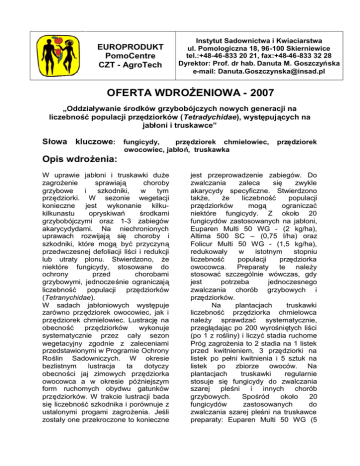 EUROPRODUKT PomoCentre CZT - AgroTech Instytut Sadownictwa i Kwiaciarstwa ul. Pomologiczna 18, 96-100 Skierniewice tel.:+48-46-833 20 21, fax:+48-46-833 32 28 Dyrektor: Prof. dr hab. Danuta M. Goszczyńska e-mail: [email protected] OFERTA WDROŻENIOWA - 2007 „Oddział ywanie środków grzybobójczych nowych generacji na liczebnośćpopulacji przędziorków (Tetradychidae), występujących na jabł oni i truskawce” Sł owa kluczowe: fungicydy, przędziorek chmielowiec, owocowiec, jabł oń, truskawka przędziorek Opis wdrożenia: W uprawie jabł oni i truskawki duże zagrożenie sprawiają choroby grzybowe i szkodniki, w tym przędziorki. W sezonie wegetacji konieczne jest wykonanie kilkukilkunastu opryskiwań środkami grzybobójczymi oraz 1-3 zabiegów akarycydydami. Na niechronionych uprawach rozwijają się choroby i szkodniki, które mogą byćprzyczyną przedwczesnej defoliacji liści i redukcji lub utraty plonu. Stwierdzono, że niektóre fungicydy, stosowane do ochrony przed chorobami grzybowymi, jednocześnie ograniczają liczebność populacji przędziorków (Tetranychidae). W sadach jabł oniowych występuje zarówno przędziorek owocowiec, jak i przędziorek chmielowiec. Lustracjęna obecność przędziorków wykonuje systematycznie przez cał y sezon wegetacyjny zgodnie z zaleceniami przedstawionymi w Programie Ochrony Roślin Sadowniczych. W okresie bezlistnym lustracja ta dotyczy obecności jaj zimowych przędziorka owocowca a w okresie późniejszym form ruchomych obydwu gatunków przędziorków. W trakcie lustracji bada sięliczebnośćszkodnika i porównuje z ustalonymi progami zagrożenia. Jeśli został y one przekroczone to konieczne jest przeprowadzenie zabiegów. Do zwalczania zaleca się zwykle akarycydy specyficzne. Stwierdzono także, że liczebność populacji przędziorków mogą ograniczać niektóre fungicydy. Z okoł o 20 fungicydów zastosowanych na jabł oni, Euparen Multi 50 WG - (2 kg/ha), Altima 500 SC – (0,75 l/ha) oraz Folicur Multi 50 WG - (1,5 kg/ha), redukował y w istotnym stopniu liczebność populacji przędziorka owocowca. Preparaty te należy stosować szczególnie wówczas, gdy jest potrzeba jednoczesnego zwalczania chorób grzybowych i przędziorków. Na plantacjach truskawki liczebność przędziorka chmielowca należy sprawdzać systematycznie, przeglądając po 200 wyrośniętych liści (po 1 z rośliny) i liczyćstadia ruchome Próg zagrożenia to 2 stadia na 1 listek przed kwitnieniem, 3 przędziorki na listek po peł ni kwitnienia i 5 sztuk na listek po zbiorze owoców. Na plantacjach truskawki regularnie stosuje się fungicydy do zwalczania szarej pleśni i innych chorób grzybowych. Spośród okoł o 20 fungicydów zastosowanych do zwalczania szarej pleśni na truskawce preparaty: Euparen Multi 50 WG (5 kg/ha), Biochicol 020 PC w stężeniu 2%, Sumilex 500 SC (1.5 l/ha), Switch 62.5 WG (1.0 kg/ha), Signum 33 WG (1.8 kg/ha) i Domark 100 EC (0.6 l/ha), ograniczał y jednocześnie liczebność populacji przędziorka chmielowca. Przędziorek chmielowiec Najbardziej skuteczny był Euparen Multi 50 WG (5 kg/ha). Stosowanie tego preparatu jest jednak czasowo zawieszone i nie może być on używany do ochrony roślin sadowniczych. Przędziorek owocowiec Innowacyjnośćwdrożeniowa – efekty gospodarcze i społ eczne Innowacyjnośćmetody polega na: Dobierając odpowiednie fungicydy do ochrony jabł oni i truskawki, można jednocześnie zapobiegać lub zwalczać choroby grzybowe i ograniczać populację przędziorków. Jednoczesne zwalczanie chorób grzybowych i przędziorków zmniejsza się ilość zużywanych środków ochrony roślin na danąuprawę. Prowadząc jednoczesne zwalczanie chorób i szkodnika ogranicza sięilośćśrodków ochrony wprowadzanych do środowiska, a jednocześnie redukuje siękoszty produkcji. Podmioty, do których skierowana jest oferta wdrożeniowa Gospodarstwa sadownicze, Ośrodki Doradztwa Rolniczego Twórcy oferty wdrożeniowej: Instytut Sadownictwa i Kwiaciarstwa Zakł ad Ochrony Roślin Sadowniczych Zakł ad Planowania Naukowego Autor: dr Wojciech Warabieda tel. (046) 83 45 391 e-mail:[email protected] Współ autorzy: doc dr hab. Barbara H. Łabanowska dr Beata Meszka