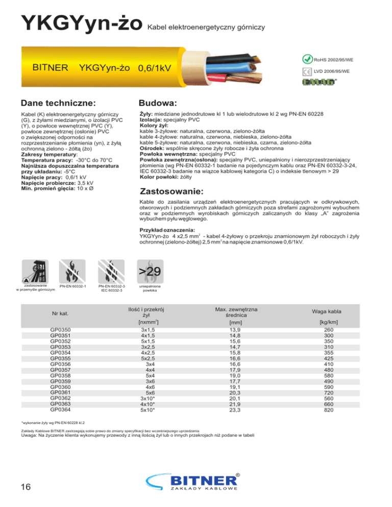 YKGYyn-żo BITNER Kabel elektroenergetyczny górniczy RoHS YKGYyn-żo 0,6/1kV RoHS 2002/95/WE LVD 2006/95/WE Dane techniczne: Budowa: Kabel (K) elektroenergetyczny górniczy (G), z żyłami miedzianymi, o izolacji PVC (Y), o powłoce wewnętrznej PVC (Y), powłoce zewnętrznej (osłonie) PVC o zwiększonej odporności na rozprzestrzenianie płomienia (yn), z żyłą ochronną zielono - żółtą (żo) Zakresy temperatury: Temperatura pracy: -30°C do 70°C Najniższa dopuszczalna temperatura przy układaniu: -5°C Napięcie pracy: 0,6/1 kV Napięcie probiercze: 3,5 kV Min. promień gięcia: 10 x Ø Żyły: miedziane jednodrutowe kl 1 lub wielodrutowe kl 2 wg PN-EN 60228 Izolacja: specjalny PVC Kolory żył: kable 3-żyłowe: naturalna, czerwona, zielono-żółta kable 4-żyłowe: naturalna, czerwona, niebieska, zielono-żółta kable 5-żyłowe: naturalna, czerwona, niebieska, czarna, zielono-żółta Ośrodek: wspólnie skręcone żyły robocze i żyła ochronna Powłoka wewnętrzna: specjalny PVC Powłoka zewnętrzna(osłona): specjalny PVC, uniepalniony i nierozprzestrzeniający płomienia (wg PN-EN 60332-1 badanie na pojedynczym kablu oraz PN-EN 60332-3-24, IEC 60332-3 badanie na wiązce kablowej kategoria C) o indeksie tlenowym > 29 Kolor powłoki: żółty Zastosowanie: Kable do zasilania urządzeń elektroenergetycznych pracujących w odkrywkowych, otworowych i podziemnych zakładach górniczych poza strefami zagrożonymi wybuchem oraz w podziemnych wyrobiskach górniczych zaliczanych do klasy „A” zagrożenia wybuchem pyłu węglowego. Przykład oznaczenia: 2 YKGYyn-żo 4 x2,5 mm - kabel 4-żyłowy o przekroju znamionowym żył roboczych i żyły 2 ochronnej (zielono-żółtej) 2,5 mm na napięcie znamionowe 0,6/1kV. >29 zastosowanie w przemyśle górniczym PN-EN 60332-1 PN-EN 60332-3 IEC 60332-3 uniepalniona powłoka Nr kat. Ilość i przekrój żył 2 [nxmm ] GP0350 GP0351 GP0352 GP0353 GP0354 GP0355 GP0356 GP0357 GP0358 GP0359 GP0360 GP0361 GP0362 GP0363 GP0364 3x1,5 4x1,5 5x1,5 3x2,5 4x2,5 5x2,5 3x4 4x4 5x4 3x6 4x6 5x6 3x10* 4x10* 5x10* Max. zewnętrzna średnica [mm] 13,9 14,8 15,6 14,7 15,8 16,6 16,6 17,9 19,0 17,7 19,1 20,3 20,1 21,9 23,3 *wykonanie żyły wg PN-EN 60228 kl.2 Zakłady Kablowe BITNER zastrzegają sobie prawo do zmiany specyfikacji bez wcześniejszego uprzedzenia Uwaga: Na życzenie klienta wykonujemy przewody z inną ilością żył lub o innych przekrojach niż podane w tabeli ® 16 Waga kabla [kg/km] 260 300 350 310 355 425 410 480 580 490 590 720 560 660 820 YKGYyn-żo Przekrój żył [mm ] 2 1,5 2,5 4 6 10 Rezystancja żył roboczych [Ω/km] 12,1 7,41 4,61 3,08 1,83 Kabel elektroenergetyczny górniczy Indukcyjność jednostkowa [mH/km] 0,34 0,32 0,32 0,30 0,28 Raktancja indukcyjna [Ω/km] Obciążalność długotrwała [A] Obciążalność zwarciowa* [kA] 0,107 0,099 0,100 0,095 0,089 19 27 37 47 62 0,17 0,29 0,46 0,69 1,15 * obciążalność zwarciowa 1 sekundowa, obliczona przy założeniu, że temperatura żył roboczych w chwili zwarcia jest równa temperaturze dopuszczalnej długotrwale 70°C 1 1. Żyła robocza 2. Izolacja 3. Wkładka polwinitowa 4. Żyła ochronna 5. Powłoka 6. Osłona zewnętrzna 2 3 4 5 6 ® 17