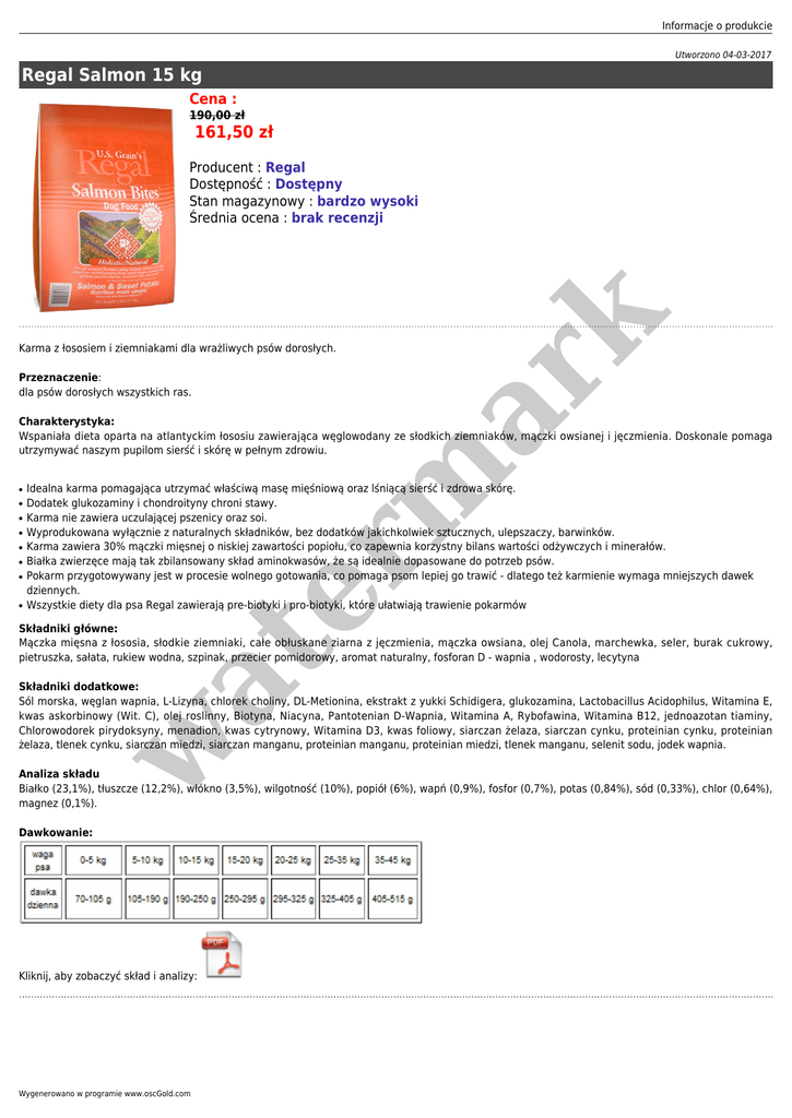 Informacje o produkcie Utworzono 04-03-2017 Regal Salmon 15 kg Cena : 190,00 zł 161,50 zł er m ar k Producent : Regal Dostępność : Dostępny Stan magazynowy : bardzo wysoki Średnia ocena : brak recenzji Karma z łososiem i ziemniakami dla wrażliwych psów dorosłych. Przeznaczenie: dla psów dorosłych wszystkich ras. Charakterystyka: Wspaniała dieta oparta na atlantyckim łososiu zawierająca węglowodany ze słodkich ziemniaków, mączki owsianej i jęczmienia. Doskonale pomaga utrzymywać naszym pupilom sierść i skórę w pełnym zdrowiu. ● ● ● ● ● ● ● ● Idealna karma pomagająca utrzymać właściwą masę mięśniową oraz lśniącą sierść i zdrowa skórę. Dodatek glukozaminy i chondroityny chroni stawy. Karma nie zawiera uczulającej pszenicy oraz soi. Wyprodukowana wyłącznie z naturalnych składników, bez dodatków jakichkolwiek sztucznych, ulepszaczy, barwinków. Karma zawiera 30% mączki mięsnej o niskiej zawartości popiołu, co zapewnia korzystny bilans wartości odżywczych i minerałów. Białka zwierzęce mają tak zbilansowany skład aminokwasów, że są idealnie dopasowane do potrzeb psów. Pokarm przygotowywany jest w procesie wolnego gotowania, co pomaga psom lepiej go trawić - dlatego też karmienie wymaga mniejszych dawek dziennych. Wszystkie diety dla psa Regal zawierają pre-biotyki i pro-biotyki, które ułatwiają trawienie pokarmów at Składniki główne: Mączka mięsna z łososia, słodkie ziemniaki, całe obłuskane ziarna z jęczmienia, mączka owsiana, olej Canola, marchewka, seler, burak cukrowy, pietruszka, sałata, rukiew wodna, szpinak, przecier pomidorowy, aromat naturalny, fosforan D - wapnia , wodorosty, lecytyna w Składniki dodatkowe: Sól morska, węglan wapnia, L-Lizyna, chlorek choliny, DL-Metionina, ekstrakt z yukki Schidigera, glukozamina, Lactobacillus Acidophilus, Witamina E, kwas askorbinowy (Wit. C), olej roslinny, Biotyna, Niacyna, Pantotenian D-Wapnia, Witamina A, Rybofawina, Witamina B12, jednoazotan tiaminy, Chlorowodorek pirydoksyny, menadion, kwas cytrynowy, Witamina D3, kwas foliowy, siarczan żelaza, siarczan cynku, proteinian cynku, proteinian żelaza, tlenek cynku, siarczan miedzi, siarczan manganu, proteinian manganu, proteinian miedzi, tlenek manganu, selenit sodu, jodek wapnia. Analiza składu Białko (23,1%), tłuszcze (12,2%), włókno (3,5%), wilgotność (10%), popiół (6%), wapń (0,9%), fosfor (0,7%), potas (0,84%), sód (0,33%), chlor (0,64%), magnez (0,1%). Dawkowanie: Kliknij, aby zobaczyć skład i analizy: Wygenerowano w programie www.oscGold.com