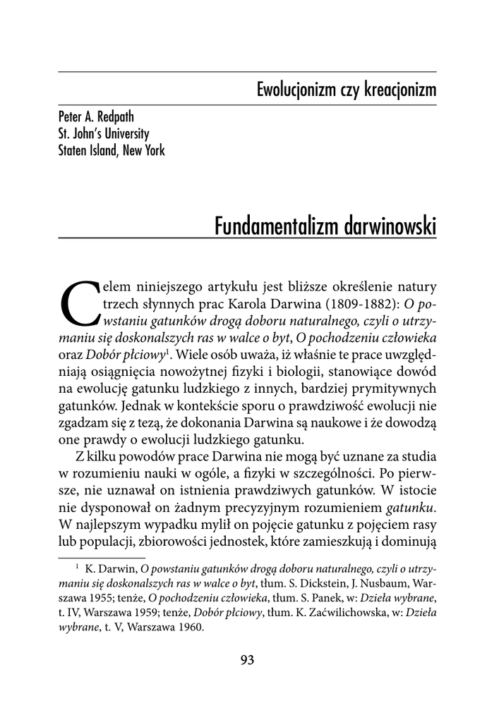 Ewolucjonizm czy kreacjonizm Peter A. Redpath St. John’s University Staten Island, New York Fundamentalizm darwinowski C elem niniejszego artykułu jest bliższe określenie natury trzech słynnych prac Karola Darwina (1809-1882): O powstaniu gatunków drogą doboru naturalnego, czyli o utrzymaniu się doskonalszych ras w walce o byt, O pochodzeniu człowieka oraz Dobór płciowy1. Wiele osób uważa, iż właśnie te prace uwzględniają osiągnięcia nowożytnej fizyki i biologii, stanowiące dowód na ewolucję gatunku ludzkiego z innych, bardziej prymitywnych gatunków. Jednak w kontekście sporu o prawdziwość ewolucji nie zgadzam się z tezą, że dokonania Darwina są naukowe i że dowodzą one prawdy o ewolucji ludzkiego gatunku. Z kilku powodów prace Darwina nie mogą być uznane za studia w rozumieniu nauki w ogóle, a fizyki w szczególności. Po pierwsze, nie uznawał on istnienia prawdziwych gatunków. W istocie nie dysponował on żadnym precyzyjnym rozumieniem gatunku. W najlepszym wypadku mylił on pojęcie gatunku z pojęciem rasy lub populacji, zbiorowości jednostek, które zamieszkują i dominują 1 K. Darwin, O powstaniu gatunków drogą doboru naturalnego, czyli o utrzymaniu się doskonalszych ras w walce o byt, tłum. S. Dickstein, J. Nusbaum, Warszawa 1955; tenże, O pochodzeniu człowieka, tłum. S. Panek, w: Dzieła wybrane, t. IV, Warszawa 1959; tenże, Dobór płciowy, tłum. K. Zaćwilichowska, w: Dzieła wybrane, t. V, Warszawa 1960. 93 Peter A. Redpath w danym regionie geograficznym i mają wspólne korzenie rodowe2. Po drugie, Darwin w sposób równie niepełny rozumiał pojęcie nauki, fizyki, a także ogólne pojęcie materii, które jest podstawową kategorią nowożytnej fizyki. Jeśli wyrażamy się na temat nauki jako takiej, czy też fizyki, to z konieczności mówimy o pewnego rodzaju wiedzy ludzkiej, która dowodzi uniwersalnych i koniecznych twierdzeń na temat pewnej niezależnej od umysłu rzeczywistości. Darwin jednak był nominalistą. Uważał on, że powszechniki są po prostu nazwami konkretów. Stąd też jego teoria ewolucji nie może być naukowa, a nawet nie może być teorią. Darwin nie może wyjaśnić powstania gatunków, ponieważ – jak słusznie dowodzi Larry Azar, a sam twórca tej „teorii” uczciwie przyznaje – wcale nie jest przekonany o tym, że gatunki istnieją3. Poza tym przedmiotem badań wszelkich nauk jest rodzaj, czyli zbiór gatunków. Mówiąc dokładnie, swój początek gatunek znajduje w rodzaju. Nie możemy nawet podjąć naukowych rozważań, zanim nie stwierdzimy istnienia wielu gatunków w obrębie tego samego rodzaju, który – w konkretnych przypadkach, z uwagi na swoje w nich działanie – powoduje, że są one właśnie tymi gatunkami, i sprawia, że możemy je poznać. Na przykład, dentyści muszą najpierw wiedzieć, czym jest konkretny człowiek, by następnie rozpoznać konkretny ludzki ząb i różne jego odmiany. Darwin jednak uważa, że rodzaj jest po prostu czasowo odległym i w dużej mierze niepoznawalnym i niecywilizowanym przodkiem grupy współcześnie istniejących jednostek4. Stąd też cała metoda jego badań bazuje na tezie, która ma dopiero zostać udowodniona, co 2 K. Darwin, O powstaniu gatunków, s. 51-67. L. Azar, Evolution and Other Fairy Tales, Bloomington, Indiana: Authorhouse, 2005, s. 452. 4 K. Darwin, O powstaniu gatunków, s. 51-67. 3 94 Fundamentalizm darwinowski ostatecznie prowadzi do błędu petitio principii. Nie możemy bowiem wiedzieć tego, jaki to starożytny rodzaj jest odległym, historycznym i źródłowym gatunkiem, jeśli najpierw nie poznamy gatunku istniejącego obecnie. A nie możemy poznać obecnie istniejącego gatunku mówiąc, że przypomina on dawno umarłego, dzikiego przodka, który wymarł i którego nie da się zidentyfikować. W skrócie rzecz ujmując, Darwin – po pierwsze – nie odróżnia wyraźnie osobników od ras, a ras od gatunków; po drugie – nie uznaje gatunków istniejących realnie; po trzecie – nie widzi żadnej różnicy między gatunkiem a rodzajem, poza stwierdzeniem, że rodzaj jest to uprzednio istniejący, pierwotny gatunek5. Na temat osobników, ras i gatunków Darwin mówi tak: „[...] uważam słowo gatunek za nazwę dowolnie, dla dogodności tylko, nadaną grupie osobników ściśle do siebie podobnych, że pojęcie to nie różni się istotnie od pojęcia odmiana, którym określa się formy mniej wyodrębnione i bardziej ulegające wahaniom. Podobnie i nazwy odmiany w porównaniu do różnic indywidualnych również używa się zupełnie dowolnie i tylko dla dogodności”6. Dla wygody więc gatunkiem nazywa on odmianę wyraźnie oznaczoną i niezmienną, a odmiany – początkowymi gatunkami, jako że są to „grupy form niejednakowo zbliżonych do siebie i skupionych wokół pewnych form, tj. wokół swych rodzicielskich gatunków”7. Takie niestaranne używanie języka nie ma żadnego związku z nauką. Podobnie jak Menon, tytułowy bohater dialogu Platona, Darwin uważa, że grupy osobników łączą się w gatunki8. Następnie grupy gatunków łączą się w rodzaj. W trzecim rozdziale O powstaniu, zatytułowanym Walka o byt, Darwin stara się wyjaśnić sposób, 5 Nt. bardziej szczegółowej krytyki tych problemów u Darwina, zob. L. Azar, dz.cyt. 6 K. Darwin, O powstaniu gatunków, s. 62. 7 Np. tamże, s. 66. 8 Zob. Platon, Menon, 72A–D. 95 Peter A. Redpath w jaki – według niego – ten proces przebiega. „Przyglądając się – pisze – rozmaitym roślinom i krzewom zarastającym gęsto brzeg rzeki, skłonni jesteśmy przypisywać skład roślinności i stosunkową ilość jej przedstawicieli tylko temu, co nazywamy przypadkiem. Ale jakże fałszywy będzie ten pogląd!”9. To jednak prawo, a nie przypadek, jest przyczyną. Termin walki o byt, o którym Darwin mówi, że używa go w szerokim i metaforycznym sensie, odnosi się do naturalnego faktu, że „każda istota organiczna dą