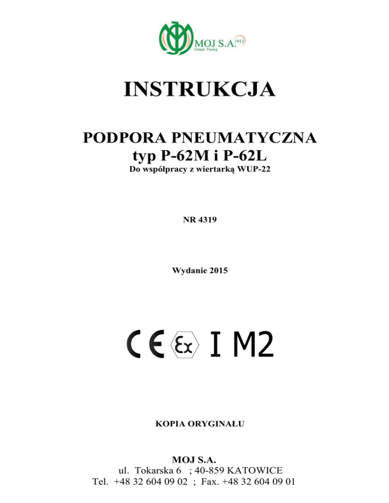 INSTRUKCJA PODPORA PNEUMATYCZNA typ P-62M i P-62L Do współpracy z wiertarką WUP-22 NR 4319 Wydanie 2015 KOPIA ORYGINAŁU MOJ S.A. ul. Tokarska 6 ; 40-859 KATOWICE Tel. +48 32 604 09 02 ; Fax. +48 32 604 09 01 . MOJ S.A. Katowice Nr INSTRUKCJA 4319 Spis treści Lp. 1. 2. 3. 4. 5. 6. 7. 8. Rys.1. Rys.2. Rys.3. Rys.4. Nazwa Zastosowanie Parametry techniczne Normy związane Identyfikacja zagrożeń Obsługa podpory Zamocowanie wiertarki na podporze Dokumenty producenta Wykaz części Podpora pneumatyczna typ P-62M i P-62L Zawór regulacyjny Obsada kompletna Podłączenie węży Strona 3 3 3 3 4 5 5 6 7 8 8 9 2/9 . MOJ S.A. Katowice INSTRUKCJA Nr 4319 1. Zastosowanie. Podpory pneumatyczne typu P-62M i P-62L są przystosowane do współpracy z wiertarką udarową pneumatyczną typu WUP-22. Zastosowanie wiertarki udarowej pneumatycznej przymocowanej do podpory pneumatycznej ma na celu wspomaganie pracy wiertacza podczas wykonywania prac wiertniczych. Wspomaganie to polega na podtrzymywaniu ciężaru wiertarki przez podporę z jednoczesnym równomiernym zwiększeniem siły docisku na wiertło. Podczas pracy podpory pneumatycznej można regulować docisk narzędzia wiercącego do skały w czasie wykonywania prac wiertniczych za pomocą zaworu regulacyjnego (rys.1 poz.2.). 2. Parametry techniczne. Parametry Jednostka Masa Długość całkowita w stanie zsuniętym Skok Ciśnienie zasilania Siła docisku przy 0,4MPa kg mm mm MPa kN P-62M 40 1762 1300 Wielkość P-62M-800 31,5 1347 880 0,4 – 0,6 2,1 P-62L 24 1750 1300 3. Normy związane. P-62-1998M 4093-P-62L-0 PN-EN 22768-1:1999 PN-ISO 965-3:2001 PN-EN 22768-1:1999 PN-EN 13463-1: 2010 PN-EN ISO 12100-2:2005 Dokumentacja konstrukcyjna – Podpora P62M. Dokumentacja konstrukcyjna – Podpora P62L. Tolerancje ogólne. Tolerancje wymiarów liniowych i kątowych bez indywidualnych oznaczeń tolerancji. Gwinty metryczne ISO ogólnego przeznaczenia. Tolerancje. Część3: Odchyłki gwintów maszynowych. Tolerancje ogólne. Tolerancje wymiarów liniowych i kątowych bez indywidualnych oznaczeń tolerancji. Urządzenia nieelektryczne w przestrzeniach zagrożonych wybuchem. Część 1: Podstawowe założenia i wymagania. Maszyny. Bezpieczeństwo. Pojęcia podstawowe, ogólne zasady projektowania. Zasady i wymagania techniczne. 4. Identyfikacja zagrożeń. 1) Do podłączenia podpory pneumatycznej typu P-62M lub P-62L do wiertarki udarowej pneumatycznej WUP-22 należy stosować tylko węże posiadające certyfikat pozwalający na ich stosowanie w podziemiach kopalń. 2) Po zakończeniu prac wiertniczych wykonanych przy pomocy wiertarki udarowej pneumatycznej WUP-22 zamontowanej na podporze pneumatycznej P-62M lub P-62L, należy zamknąć zawór znajdujący się na rurociągu, który odcina doprowadzenie sprężonego powietrza bezpośrednio do wiertarki i podpory, a następnie odłączyć wąż. Dzięki temu uniknie 3/9 . MOJ S.A. Katowice INSTRUKCJA Nr 4319 się wypadków związanych z przypadkowym uruchomieniem wiertarki lub podpory. 3) Sposób w jaki należy wykonywać prace wiertnicze przy użyciu wiertarki udarowej pneumatycznej typu WUP-22 przymocowanej do podpory pneumatycznej typu P-62M lub P-62L zostały omówione w punkcie 3.4. DTR INSTRUKCJI WUP-22. 4) Wszelkie naprawy podpory pneumatycznej typu P-62M lub P-62L należy powierzać doświadczonym pracownikom lub zlecić producentowi: MOJ S.A., 40-859 Katowice, ul. Tokarska 6. 5) Podczas wykonywania prac wiertniczych należy odpowiednio do postępu wiercenia, dostosować siłę docisku. 6) Nie dopuszcza się demontażu i montażu podpory w podziemiach kopalń. Czynności te należy wykonywać w warsztacie na powierzchni przy zachowaniu odpowiedniej czystości. 5. Obsługa podpory. Podpory pneumatyczne typu P-62M lub P-62L służą do podtrzymywania wiertarki udarowej pneumatycznej typu WUP-22 podczas wykonywania prac wiertniczych i wywierania równomiernego nacisku na wiertło. Podpory pneumatyczne stosuje się podczas prac wiertniczych do wiercenia otworów, które mają być wykonane poziomo, odchylone od poziomu w górę i w dół. Zastosowanie podpory pneumatycznej przy pracach wiertniczych przymocowanej do wiertarki udarowej pneumatycznej wpływa na lepsze prowadzenie wiertła w górotworze, przez co uzyskuje się mniejsze zużycie ostrza wiertła, jak również zapobiega przypadkom zakleszczania lub łamania wiertła. Praca wiertarki udarowej pneumatycznej na podporze pneumatycznej zwiększa siłę nacisku na wiertło i powoduje większy postęp wiercenia, jednocześnie wpływa na zmniejszenie wysiłku pracy pracownika, który wykonuje prace wiertnicze. Należy pamiętać o tym, że podczas wykonywania prac wiertniczych wiertarką udarową pneumatyczną z zamocowaną podporą pneumatyczną konieczne jest smarowanie. Smarowanie to zapewnia smarownica przewodowa S3. Smarowanie zabezpiecza części podpory pneumatycznej przed ich zatarciem, przedłuża okres eksploatacji i gwarantuje prawidłową oraz bezawaryjną pracę. Smarownicę przewodową można kupić bezpośrednio u producenta: MOJ S.A., Katowice, ul. Tokarska 6. Sterowanie podporą pneumatyczną typu P-62M lub P-62L odbywa się za pomocą ZAWORU REGULACYJNEGO (rys.1 poz.2.), którym to reguluje się dopływ sprężonego powietrza i tym samym pozwala na równomierne wysuwanie tłoka podpory pneumatycznej. Obrót zaworu regulacyjnego w prawo zwiększa dopływ powietrza do podpory pneumatycznej, a tym samym powoduje zwiększenie docisku wiertła w czasie wykonywania wiercenia. Podpora pneumatyczna jest również wyposażona w tak zwany zawór szybkiego spustu (rys.1.), który służy do równomiernej regulacji odpływu sprężonego powietrza podczas zsuwania tłoka podpory. Za pomocą tego spustu można szybko zwolnić docisk wiertła do górotworu. Spust należy uruchomić w przypadku składania podpory lub zakleszczenia się wiertła w otworze podczas wykonywania prac wiertniczych, celem spustu jest ewentualne szybkie zwolnienie nacisku