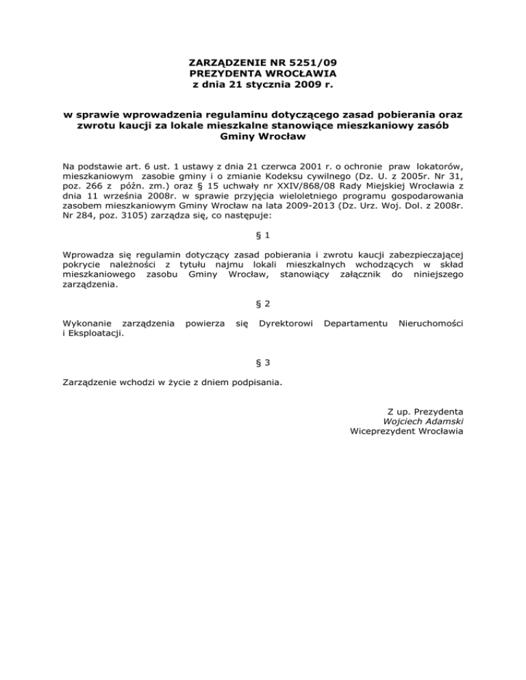 ZARZĄDZENIE NR 5251/09 PREZYDENTA WROCŁAWIA z dnia 21 stycznia 2009 r. w sprawie wprowadzenia regulaminu dotyczącego zasad pobierania oraz zwrotu kaucji za lokale mieszkalne stanowiące mieszkaniowy zasób Gminy Wrocław Na podstawie art. 6 ust. 1 ustawy z dnia 21 czerwca 2001 r. o ochronie praw lokatorów, mieszkaniowym zasobie gminy i o zmianie Kodeksu cywilnego (Dz. U. z 2005r. Nr 31, poz. 266 z późn. zm.) oraz § 15 uchwały nr XXIV/868/08 Rady Miejskiej Wrocławia z dnia 11 września 2008r. w sprawie przyjęcia wieloletniego programu gospodarowania zasobem mieszkaniowym Gminy Wrocław na lata 2009-2013 (Dz. Urz. Woj. Dol. z 2008r. Nr 284, poz. 3105) zarządza się, co następuje: §1 Wprowadza się regulamin dotyczący zasad pobierania i zwrotu kaucji zabezpieczającej pokrycie naleŜności z tytułu najmu lokali mieszkalnych wchodzących w skład mieszkaniowego zasobu Gminy Wrocław, stanowiący załącznik do niniejszego zarządzenia. §2 Wykonanie zarządzenia i Eksploatacji. powierza się Dyrektorowi Departamentu Nieruchomości §3 Zarządzenie wchodzi w Ŝycie z dniem podpisania. Z up. Prezydenta Wojciech Adamski Wiceprezydent Wrocławia Załącznik do Zarządzenia Nr 5251/09 Prezydenta Wrocławia z dnia 21 stycznia 2009 r. Regulamin w sprawie zasad pobierania oraz zwrotu kaucji za lokale mieszkalne stanowiące mieszkaniowy zasób Gminy Wrocław. 1. 2. 3. 4. 5. 6. 7. 8. 9. 10. Na podstawie § 15 uchwały Nr XXIV/868/08 Rady Miejskiej Wrocławia w sprawie przyjęcia wieloletniego programu gospodarowania mieszkaniowym zasobem Gminy Wrocław na lata 2009-2013 (Dz. Urz. Woj. Doln. Nr 284, poz. 3105) ze skutkiem prawnym od dnia 1 stycznia 2009r. zawarcie umowy najmu lokalu mieszkalnego uzaleŜniono od wpłacenia przez najemcę kaucji zabezpieczającej pokrycie naleŜności z tytułu najmu lokalu, przysługujących wynajmującemu w dniu opróŜnienia lokalu. Wydział Lokali Mieszkalnych Urzędu Miejskiego Wrocławia w pismach kierujących do zawarcia umowy najmu wskazuje obowiązek opłaty kaucji przez najemcę za dany lokal. Kaucja wynosi dziesięciokrotność miesięcznego czynszu za dany lokal, obliczonego wg stawki obowiązującej w dniu zawarcia umowy najmu. Wysokość kaucji określa właściwy zarządca, a jej wpłata przez przyszłego najemcę następuje na niŜej wskazane konta bankowe Banku Zachodniego WBK Oddział I Wrocław: 1) dla lokali mieszkalnych będących w zarządzie Zarządu Zasobu Komunalnego: nr konta 24 1090 2398 0000 0006 0803 0361 2) dla lokali mieszkalnych będących w zarządzie spółki „Wrocławskie Mieszkania” sp. z o.o. (rejony C i L): nr konta 36 1090 2398 0000 0001 0895 3796 Osoba wskazana do zawarcia umowy najmu lokalu mieszkalnego przed jej zawarciem zobowiązana jest dokonać wpłaty kaucji oraz przedłoŜyć poświadczenie słuŜb księgowych właściwego zarządcy o wywiązaniu się z tego obowiązku. Brak wpłaty kaucji na koncie wynajmującego określonym w ust. 4 powoduje odstąpienie od zawarcia umowy najmu. Kaucji nie pobiera się, jeŜeli umowa: 1) dotyczy lokalu zamiennego, 2) dotyczy lokalu socjalnego, 3) jest zawierana w związku z zamianą lokali, a najemca uzyskał zwrot kaucji bez dokonania jej waloryzacji. Wpłacenie kaucji nie zwalnia najemcy od obowiązku terminowego uiszczania czynszu i innych opłat z tytułu najmu lokalu oraz od obowiązku utrzymywania lokalu we właściwym stanie, jego odnawiania i dokonywania niezbędnych napraw i konserwacji zgodnie z obowiązującymi przepisami. W czasie trwania najmu najemca nie moŜe domagać się, aby wynajmujący pokrył z wpłaconej kaucji naleŜności wynikające ze stosunku najmu. Kaucja podlega zwrotowi w terminie miesiąca od dnia opróŜnienia lokalu lub nabycia jego własności przez najemcę, po potrąceniu naleŜności wynajmującego wynikających z tytułu najmu lokalu. 11. Zwrot zwaloryzowanej kaucji odnosi się wyłącznie do najemców, którzy ją wpłacili po dniu 1 stycznia 2009r. i następuje w wysokości stanowiącej dziesięciokrotność miesięcznego czynszu za dany lokal mieszkalny obowiązującego w dniu zwrotu kaucji, jednak w kwocie nie niŜszej niŜ kaucja pobrana.