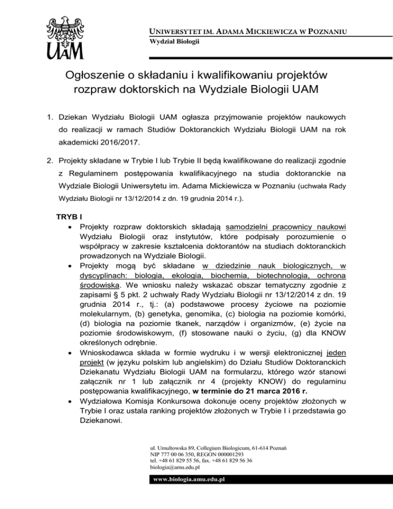Wydział Biologii Ogłoszenie o składaniu i kwalifikowaniu projektów rozpraw doktorskich na Wydziale Biologii UAM 1. Dziekan Wydziału Biologii UAM ogłasza przyjmowanie projektów naukowych do realizacji w ramach Studiów Doktoranckich Wydziału Biologii UAM na rok akademicki 2016/2017. 2. Projekty składane w Trybie I lub Trybie II będą kwalifikowane do realizacji zgodnie z Regulaminem postępowania kwalifikacyjnego na studia doktoranckie na Wydziale Biologii Uniwersytetu im. Adama Mickiewicza w Poznaniu (uchwała Rady Wydziału Biologii nr 13/12/2014 z dn. 19 grudnia 2014 r.). TRYB I Projekty rozpraw doktorskich składają samodzielni pracownicy naukowi Wydziału Biologii oraz instytutów, które podpisały porozumienie o współpracy w zakresie kształcenia doktorantów na studiach doktoranckich prowadzonych na Wydziale Biologii. Projekty mogą być składane w dziedzinie nauk biologicznych, w dyscyplinach: biologia, ekologia, biochemia, biotechnologia, ochrona środowiska. We wniosku należy wskazać obszar tematyczny zgodnie z zapisami § 5 pkt. 2 uchwały Rady Wydziału Biologii nr 13/12/2014 z dn. 19 grudnia 2014 r., tj.: (a) podstawowe procesy życiowe na poziomie molekularnym, (b) genetyka, genomika, (c) biologia na poziomie komórki, (d) biologia na poziomie tkanek, narządów i organizmów, (e) życie na poziomie środowiskowym, (f) stosowane nauki o życiu, (g) dla KNOW określonych odrębnie. Wnioskodawca składa w formie wydruku i w wersji elektronicznej jeden projekt (w języku polskim lub angielskim) do Działu Studiów Doktoranckich Dziekanatu Wydziału Biologii UAM na formularzu, którego wzór stanowi załącznik nr 1 lub załącznik nr 4 (projekty KNOW) do regulaminu postępowania kwalifikacyjnego, w terminie do 21 marca 2016 r. Wydziałowa Komisja Konkursowa dokonuje oceny projektów złożonych w Trybie I oraz ustala ranking projektów złożonych w Trybie I i przedstawia go Dziekanowi. ul. Umultowska 89, Collegium Biologicum, 61-614 Poznań NIP 777 00 06 350, REGON 000001293 tel. +48 61 829 55 56, fax. +48 61 829 56 36 [email protected] www.biologia.amu.edu.pl Wydział Biologii Dziekan ogłasza wykaz tematów i potencjalnych opiekunów naukowych w terminie do 15 kwietnia 2016 r. oraz informuje wnioskodawców o wynikach postępowania kwalifikacyjnego. TRYB II Projekty rozpraw doktorskich składają w formie wydruków i w wersji elektronicznej kierownicy grantów (NCN, NCBiR, MNiSW, FNP lub równoważnych), albo opiekunowie naukowi laureatów w konkursie Diamentowy Grant, będący samodzielnymi pracownikami naukowymi Wydziału Biologii oraz instytutów, które podpisały porozumienie o współpracy w zakresie kształcenia doktorantów na studiach doktoranckich prowadzonych na Wydziale Biologii, lub adiunktami ze stopniem doktora zatrudnionymi na Wydziale Biologii UAM. Granty, o których mowa powyżej, muszą być zatwierdzone do realizacji przez uprawnioną instytucję, a ich zabezpieczenie finansowe potwierdzone odpowiednią umową. Ponadto granty te – z wyjątkiem Diamentowych Grantów – muszą zapewniać finansowanie doktoranta w wysokości netto nie niższej niż minimalna wysokość stypendium doktoranckiego. Wnioskodawca składa w terminie do 21 marca 2016 r.: a) projekt (w języku polskim lub angielskim) do Działu Studiów Doktoranckich na formularzu, którego wzór stanowi załącznik nr 3 lub załącznik nr 4 (projekty KNOW) do regulaminu postępowania kwalifikacyjnego, b) oświadczenie podające treść i numer decyzji instytucji zatwierdzającej grant do realizacji, podające wysokość środków przeznaczonych na finansowanie doktoranta w grancie oraz potwierdzające podpisanie umowy dotyczącej realizacji grantu ze wskazaniem daty zawarcia umowy oraz okresu realizacji grantu. Liczba projektów złożonych przez wnioskodawcę może być większa niż 1, co powinno wynikać z zapisów w przyjętych do realizacji wnioskach grantowych. Wydziałowa Komisja Konkursowa sprawdza od strony formalnej złożone dokumenty, ustala listę złożonych projektów i przedstawia ją dziekanowi. Dziekan ogłasza wykaz tematów i potencjalnych opiekunów naukowych w terminie do 15 kwietnia 2016 r. oraz informuje wnioskodawców o wynikach postępowania kwalifikacyjnego. ul. Umultowska 89, Collegium Biologicum, 61-614 Poznań NIP 777 00 06 350, REGON 000001293 tel. +48 61 829 55 56, fax. +48 61 829 56 36 [email protected] www.biologia.amu.edu.pl Wydział Biologii Uwaga: kolejne terminy przyjmowania projektów składanych w Trybie II mogą zostać ogłoszone dodatkowo po rozstrzygnięciach nowych konkursów grantowych odpowiednich instytucji (np. NCN, NCBiR). 3. Rekrutacja kandydatów na Studia Doktoranckie Wydziału Biologii UAM odbywać się będzie zgodnie z aktualnie obowiązującą uchwałą Senatu UAM w sprawie warunków i trybu przyjęć na I rok studiów doktoranckich stacjonarnych i niestacjonarnych w Uniwersytecie im. Adama Mickiewicza. 4. Harmonogramy rekrutacji kandydatów na studia doktoranckie ogłoszone zostaną oddzielnie. 5. Informacja dot. wniosków składanych w Trybie II – kwotę netto przewidzianą w grancie dla doktoranta należy porównywać z wysokością stypendium w perspektywie 4 lat studiów doktoranckich. Obecnie stypendium to wynosi 1.470,zł, ale jest corocznie waloryzowane proporcjonalnie do najniższego wynagrodzenia asystenta, a wzrost ten wynosi nieco powyżej stu złotych (ostatnio 123,- zł). 6. Pełny tekst Regulaminu postępowania kwalifikacyjnego na studia doktoranckie na Wydziale Biologii UAM oraz formularze wniosków dostępne są na stronie internetowej Wydziału pod zakładką >> Dla pracownika >> Dokumenty do pobrania. Poznań, 4.02.2016 r. Dziekan Wydziału Biologii / --- podpis ---/ prof. dr hab. Bogdan Jackowiak ul. Umultowska 89, Collegium Biologicum, 61-614 Poznań NIP 777 00 06 350, REGON 000001293 tel. +48 61 829 55 56, fax. +48 61 829 56 36 [email protected] www.biologia.amu.edu.pl