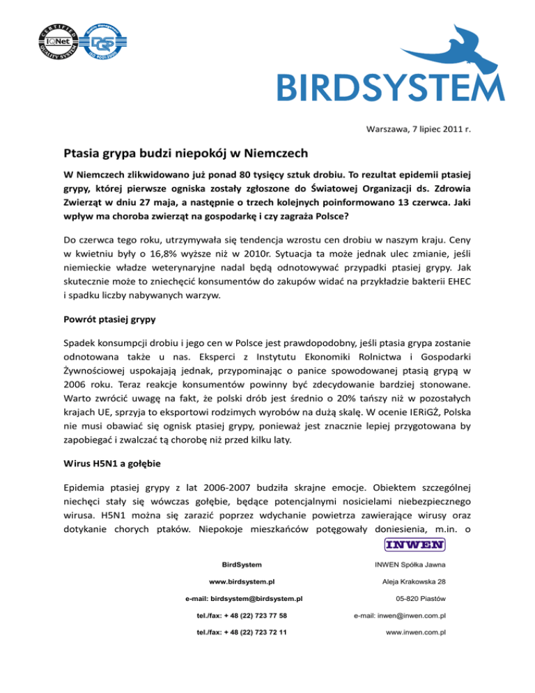 Warszawa, 7 lipiec 2011 r. Ptasia grypa budzi niepokój w Niemczech W Niemczech zlikwidowano już ponad 80 tysięcy sztuk drobiu. To rezultat epidemii ptasiej grypy, której pierwsze ogniska zostały zgłoszone do Światowej Organizacji ds. Zdrowia Zwierząt w dniu 27 maja, a następnie o trzech kolejnych poinformowano 13 czerwca. Jaki wpływ ma choroba zwierząt na gospodarkę i czy zagraża Polsce? Do czerwca tego roku, utrzymywała się tendencja wzrostu cen drobiu w naszym kraju. Ceny w kwietniu były o 16,8% wyższe niż w 2010r. Sytuacja ta może jednak ulec zmianie, jeśli niemieckie władze weterynaryjne nadal będą odnotowywad przypadki ptasiej grypy. Jak skutecznie może to zniechęcid konsumentów do zakupów widad na przykładzie bakterii EHEC i spadku liczby nabywanych warzyw. Powrót ptasiej grypy Spadek konsumpcji drobiu i jego cen w Polsce jest prawdopodobny, jeśli ptasia grypa zostanie odnotowana także u nas. Eksperci z Instytutu Ekonomiki Rolnictwa i Gospodarki Żywnościowej uspokajają jednak, przypominając o panice spowodowanej ptasią grypą w 2006 roku. Teraz reakcje konsumentów powinny byd zdecydowanie bardziej stonowane. Warto zwrócid uwagę na fakt, że polski drób jest średnio o 20% taoszy niż w pozostałych krajach UE, sprzyja to eksportowi rodzimych wyrobów na dużą skalę. W ocenie IERiGŻ, Polska nie musi obawiad się ognisk ptasiej grypy, ponieważ jest znacznie lepiej przygotowana by zapobiegad i zwalczad tą chorobę niż przed kilku laty. Wirus H5N1 a gołębie Epidemia ptasiej grypy z lat 2006-2007 budziła skrajne emocje. Obiektem szczególnej niechęci stały się wówczas gołębie, będące potencjalnymi nosicielami niebezpiecznego wirusa. H5N1 można się zarazid poprzez wdychanie powietrza zawierające wirusy oraz dotykanie chorych ptaków. Niepokoje mieszkaoców potęgowały doniesienia, m.in. o BirdSystem www.birdsystem.pl e-mail: [email protected] INWEN Spółka Jawna Aleja Krakowska 28 05-820 Piastów tel./fax: + 48 (22) 723 77 58 e-mail: [email protected] tel./fax: + 48 (22) 723 72 11 www.inwen.com.pl odwołaniu międzynarodowego wyścigu gołębi z kontynentalnej części Europy do Wielkiej Brytanii. Kooczyło się to nawet przypadkami odnajdywania martwych, prawdopodobnie otrutych, gołębi w wielu polskich miastach. ,,Bez względu na zagrożenie ptasią grypą, lepiej unikad styczności z gołębiami” – komentuje Paweł Dwierzyoski z BirdSystem, firmy zajmującej się profesjonalnym odstraszaniem gołębi. ,,Tyczy się to w szczególności dzieci, które lubią bawid się z gołębiami. Zwierzęta te roznoszą alergeny oraz szkodliwe roztocza.” W Niemczech wybija się całe stada drobiu, nawet jeśli zanotuje się zaledwie kilka przypadków zachorowao. Służby weterynaryjne wprowadziły liczne środki zaradcze w celu opanowania sytuacji. Zwierzęta dotknięte groźnym wirusem obejmuje się kwarantanną, dezynfekcją i strefą ochronną wokół ferm. Ciekawostki od BirdSystem.pl Czy wiesz, że BirdSystem Plus jest rekomendowany przez TOZ? Udało się pogodzid skutecznośd z bezpieczeostwem, tworząc system odstraszania gołębi z budynków w 100% bezpieczny dla ptaków. Silikonowa koocówka chroni zwierzęta, podczas gdy BirdSystem Plus uniemożliwia gołębiom lądowanie w danym miejscu. Towarzystwo Opieki nad Zwierzętami w Polsce oceniło te rozwiązanie pozytywnie. ,,Dotychczasowe ogniska ptasiej grypy (H7N7) doprowadziły do zlikwidowania ponad 80 tysięcy sztuk drobiu” – mówi Paweł Dwierzyoski, przedstawiciel BirdSystem. - ,,W Polsce nie ma powodu do niepokoju, jednak radzimy unikad styczności z ptakami, szczególnie gołębiami.” Źródła: Dziennik Gazeta Prawna i PPR.pl. Korn eliu sz Smol ik, korn eliu sz.smolik@good on ep r.p l , tel.5 10796217 --- -- --- -- -- --- -- -- --- -- -- -- -- --- -- --- -- -- --- -- -- --- -- -- -- -- --- -- --- -- -- --- -- -- --- -- -- -- -- --- -- --- -- -- --BirdSystem - to marka firmy INWEN , która od roku 2000 z sukcesem oferuje rozwiązania pozwalające na skuteczne zabezpieczenie obiektów przed niepożądaną obecnością ptaków. BirdSystem to jedyny w Polsce producent profesjonalnych modułów mechanicznych z koocówkami zabezpieczającymi ptaki przed zranieniem. Więcej o BirdSystem na stronie www.birdsystem.pl. BirdSystem www.birdsystem.pl e-mail: [email protected] INWEN Spółka Jawna Aleja Krakowska 28 05-820 Piastów tel./fax: + 48 (22) 723 77 58 e-mail: [email protected] tel./fax: + 48 (22) 723 72 11 www.inwen.com.pl
