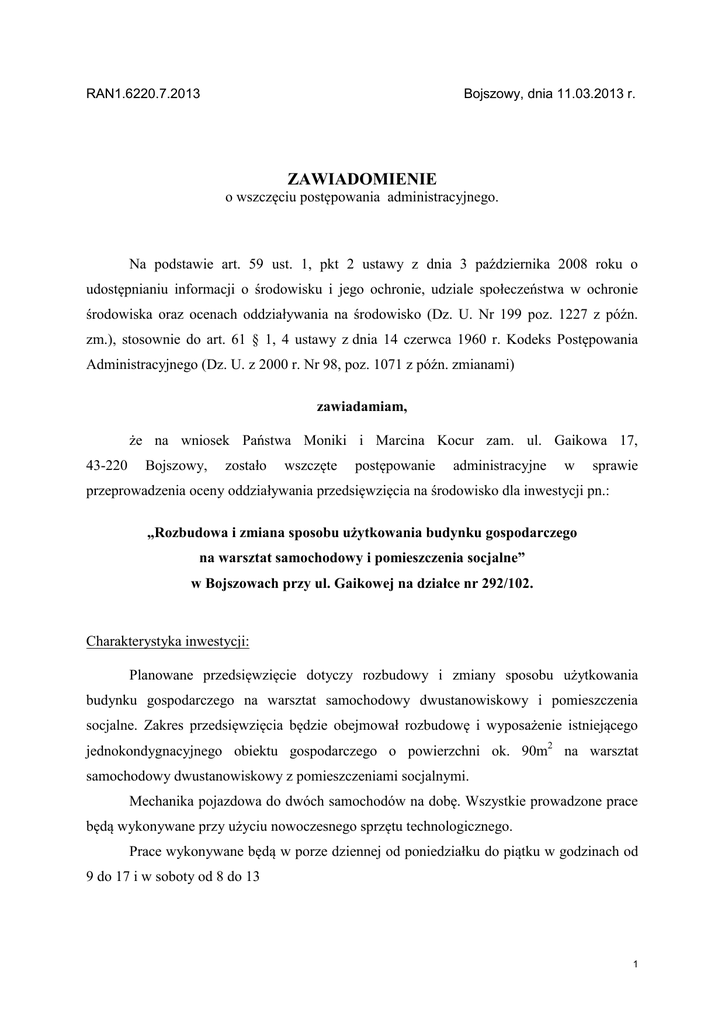 RAN1.6220.7.2013 Bojszowy, dnia 11.03.2013 r. ZAWIADOMIENIE o wszczęciu postępowania administracyjnego. Na podstawie art. 59 ust. 1, pkt 2 ustawy z dnia 3 października 2008 roku o udostępnianiu informacji o środowisku i jego ochronie, udziale społeczeństwa w ochronie środowiska oraz ocenach oddziaływania na środowisko (Dz. U. Nr 199 poz. 1227 z późn. zm.), stosownie do art. 61 § 1, 4 ustawy z dnia 14 czerwca 1960 r. Kodeks Postępowania Administracyjnego (Dz. U. z 2000 r. Nr 98, poz. 1071 z późn. zmianami) zawiadamiam, że na wniosek Państwa Moniki i Marcina Kocur zam. ul. Gaikowa 17, 43-220 Bojszowy, zostało wszczęte postępowanie administracyjne w sprawie przeprowadzenia oceny oddziaływania przedsięwzięcia na środowisko dla inwestycji pn.: „Rozbudowa i zmiana sposobu użytkowania budynku gospodarczego na warsztat samochodowy i pomieszczenia socjalne” w Bojszowach przy ul. Gaikowej na działce nr 292/102. Charakterystyka inwestycji: Planowane przedsięwzięcie dotyczy rozbudowy i zmiany sposobu użytkowania budynku gospodarczego na warsztat samochodowy dwustanowiskowy i pomieszczenia socjalne. Zakres przedsięwzięcia będzie obejmował rozbudowę i wyposażenie istniejącego jednokondygnacyjnego obiektu gospodarczego o powierzchni ok. 90m2 na warsztat samochodowy dwustanowiskowy z pomieszczeniami socjalnymi. Mechanika pojazdowa do dwóch samochodów na dobę. Wszystkie prowadzone prace będą wykonywane przy użyciu nowoczesnego sprzętu technologicznego. Prace wykonywane będą w porze dziennej od poniedziałku do piątku w godzinach od 9 do 17 i w soboty od 8 do 13 1 Informuję więc o uprawnieniach wszystkich stron tego postępowania wynikających z art.10 Kpa do czynnego w nim udziału w każdym jego stadium. Zgodnie z art. 35 § 5 Kodeksu postępowania administracyjnego do terminów załatwienia sprawy nie wlicza się terminów przewidzianych w przepisach prawa dla dokonania określonych czynności, okresów zawieszenia postępowania oraz okresów opóźnień spowodowanych z winy strony albo z przyczyn niezależnych od organu. Zgodnie z art. 41 § 1 Kpa w toku postępowania strony oraz ich przedstawiciele i pełnomocnicy mają obowiązek zawiadomić organ administracji publicznej o każdej zmianie swojego adresu. Zgodnie z § 2 tego przepisu, w razie zaniedbania obowiązku określonego w § 1 doręczenie pisma pod dotychczasowym adresem ma skutek prawny. Ewentualne uwagi mogące mieć wpływ na postępowanie strony mogą składać na piśmie w Urzędzie Gminy Bojszowy ul. Gaikowa 35, 43-220 Bojszowy. Bliższe informacje na temat w/w inwestycji można uzyskać w Referacie Planowania Przestrzennego, Geodezji, Nieruchomości i Rolnictwa Urzędu Gminy Bojszowy pok. nr 6 (I piętro), telefon 032/218-93-66 wew. 109. Otrzymuje: 1. Monika Kocur ul. Gaikowa 17 43-220 Bojszowy 2. Monika Kocur ul. Gaikowa 17 43-220 Bojszowy 2