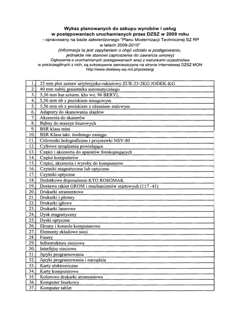 Wykaz planowanych do zakupu wyrob6w i usfug w postepowanlach uruchamianych przez DZSZ w 2009 roku - opracowany na bazie zatwierdzonego "Planu Modernizacji Technicznej 52 RP w latach 2009-2010" (informacja ta jest zapytaniem 0 cnec udzialu w posiepoweniu, jednakte nie stanowi zaproszenia do zawarcia umowy) Ogfoszenia 0 uruchamianych postepowanlach wraz z warunkami uczestnictwa w poszczeg61nych z nich, sa sukcesywnie zamieszczane na stronie internetowej DZSZ MON http://www.dostawy.wp.mil.pl/przetargi 1. 2. 3. 4. 5. 6. 7. 8. 9. 10. II. 12. 13. 14. IS. 16. 17. 18. 19. 20. 21. 22. 23. 24. 25. 26. 27. 28. 29. 30. 31. 32. 33. 34. 35. 36. 37. 23 mm plot zestaw artyleryjsko-rakietowy ZUR-23-2KG JODEK-KG 40 mm nab6j granatnika automatycznego 5,56 mm kar.sztunn. kbs wz. 96 BERYL 5,56 mm nb z pociskiem smugowym 5,56 mm nb z pociskiem z rdzeniem stalowym Adaptery do skanowania slajd6w Akcesoria do skaner6w Bebny do maszyn biurowych BSR klasa mini BSR Klasa takt. sredniego zasiegu Celowniki holograficzne i przystawki NSV-80 Cyfrowe urzadzenia powielajace Czesci i akcesoria do aparat6w fotokopiujacych Czesci komputer6w Czesci, akcesoria i wyroby do komputer6w Czytniki magnetyczne lub optyczne Czytniki optyczne Dodatkowe doposazenie KTO ROSOMAK Dostawa rakiet GROM i mechanizm6w startowych (117 -41) Drukarki atramentowe Drukarki i plotery Drukarki iglowe Drukarki laserowe Dysk magnetyczny Dyski optyczne Ekrany i konsole komputerowe Elementy skladowe sieci Fusery Infrastruktura sieciowa Interfejsy sieciowe Jezyki programowania Jezyki programowania i narzedzia Karty elektroniczne Karty komputerowe Kolorowe drukarki atramentowe Komputer biurkowy Komputer tablet 38. 39. 40. 41. 42. 43. 44. 45. 46. 47. 48. 49. 50. 51. 52. 53. 54. 55. 56. 57. 58. 59. 60. 61. 62. 63. 64. 65. 66. 67. 68. 69. 70. 71. 72. 73. 74. 75. 76. 77. 78. 79. 80. 81. Komputery osobiste Komputery przenosne Komputery wysokowydajne Konserwacja i naprawa sieciowego sprzetu do przetwarzania danych Konsole Lokalna siec komputerowa Modemy Modemizacja i doposazenie okretu rozpoznania radioe1ektronicznego t. 863 ORP "Nawigator" Modemizacja sieci Monitory ekranowe Nadmiarowa macierz niezaleznych dyskow (RAID) Napedy dyskowe Napedy dysku optycznego Niszczarki Obrotnica do montazu uzbrojenia pokladowego - podwozie bazowe wraz z dodatkowym doposazeniem Okablowanie sieciowe Osprzet do duzych systemow komputerowych Pakiety oprogramowania administracyjnego Pakiety oprogramowania antywirusowego Pakiety oprogramowania dla baz danych Pakiety oprogramowania dla baz danych i operacyjne Pakiety oprogramowania dla sieci Pakiety oprogramowania dla sieci, intemetu i intranetu Pakiety oprogramowania dla systemow operacyjnych mikrokomputerow Pakiety oprogramowania do aukcji Pakiety oprogramowania do edycji stron WWW Pakiety oprogramowania do kompilacji Pakiety oprogramowania do kopii zapasowych i odzyskiwania Pakiety oprogramowania do ochrony antywirusowej Pakiety oprogramowania do optycznego rozpoznawania znakow (OCR) Pakiety oprogramowania do pisania tekstow Pakiety oprogramowania do poczty elektronicznej Pakiety oprogramowania do projektowania wspomaganego komputerowo (CAD) Pakiety oprogramowania do publikowania elektronicznego Pakiety oprogramowania do rozszerzania systemu operacyjnego Pakiety oprogramowania do roznych operacji sieciowych Pakiety oprogramowania do rysowania i odwzorowywania Pakiety oprogramowania do skanowania Pakiety oprogramowania do tworzenia dokumentow, rysowania, odwzorowywania, tworzenia harmonogramow i produkowania Pakiety oprogramowania do zabezpieczania danych Pakiety oprogramowania do zamowien Pakiety oprogramowania do zarzadzania projektami Pakiety oprogramowania i systemy informatyczne Pakiety oprogramowania prezentacyjnego 82. 83. 84. 85. 86. 87. 88. 89. 90. 91. 92. 93. 94. 95. 96. 97. 98. 99. 100. 101. 102. 103. 104. 105. 106. 107. 108. 109. 110. 111. 112. 113. 114. 115. 116. 117. 118. 119. 120. 121. 122. 123. 124. 125. 126. 127. 128. Pakiety oprogramowania szko1eniowego Pakiety oprogramowania uzytkowego Pakiety oprogramowania uzytkowego ogolnego Pakiety oprograrnowania zabezpieczajacego Pakiety oprogramowania zapewniajace zgodnosc Pakiety oprogramowania zarzadzajacego 1icencjami Pamieci do przechowywania danych Pamiec flash Platformy komputerowe P10tery Plyty kompaktowe (CD) Podajniki dokumentow do skanera Radio1inia cyfrowa R-450A z zestawem antenowym Radiostacja FH KF do 0,1 kW p1ecakowa Remont samolotow Tu-154M Rozbudowa oprogramowania do celow wojskowych Rozlegla siec komputerowa Rozne pakiety oprogramowania i systemy komputerowe Rozne uslugi opracowywania oprogramowania i systemy komputerowe Rozny sprzet komputerowy Rutery sieciowe Serwery Serwery komputerowe Serwery sieciowe Sieci Sieciowy system operacyjny Siec intemetowa Siec zintegrowana Skanery komputerowe Sprzet do obslugi danych Sprzet do przesylu danych Sprzet obslugowy do smiglowcow Sprzet peryferyjny Sprzet zwiazany z komputerami Stacje robocze System nawigacji TACAN System obrazowania i archiwizowania System projektowania wspomaganego komputerowo (CAD) System zarzadzania baza danych System zarzadzania dokumentacja Systemy baz danych Systemy informacyjne Systemy operacyjne Tasmy do drukarek Terminale komputerowe Toner d1a osrodkow przetwarzania danych oraz badan i dokumentowania Toner do drukarek laserowych/faksow 129. 130. 131. 132. 133. 134. 135. 136. 137. 138. 139. 140. 141. 142. Toner do fotokopiarek Ubi6r bojowy strzelca pokladowego Ubi6r bojowy zolnierza piechoty Uniwersalna kamizelka ochronna Uniwersalne dyski wideo (DVD) Urzadzenia do powie1ania Urzadzenia do przechowywania i odczytu danych Urzadzenia do przetwarzania danych Urzadzenia fotokopiujace Urzadzenia kodujace Urzadzenia rozszerzania pamieci Urzadzenia sieciowe Urzadzenie do odczytu i/lub wypalania plyt kompaktowych (CD) Urzadzenie do odczytu i/lub wypalania plyt kompaktowych (CD) i uniwersalnych dysk6w wideo (DVD) 143. Urzadzenie do odczytu i/lub wypalania uniwersalnych dysk6w wideo (DVD) 144. Uslug