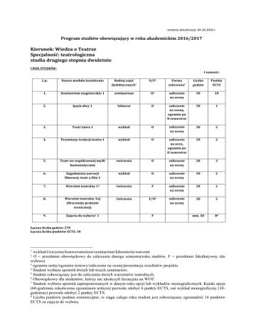 ostatnia aktualizacja: 04.10.2016 r. Program studiów obowiązujący w roku akademickim 2016/2017 Kierunek: Wiedza o Teatrze Specjalność: teatrologiczna studia drugiego stopnia dwuletnie I ROK STUDIÓW: I semestr: L.p. Nazwa modułu kształcenia Rodzaj zajęć dydaktycznych1 O/F2 Forma zaliczenia3 Liczba godzin Punkty ECTS 1. Seminarium magisterskie 1 seminarium O4 zaliczenie na ocenę 30 10 2. Język obcy 1 lektorat O zaliczenie na ocenę, egzamin po II semestrze 30 1 3. Teatr tańca 1 wykład O zaliczenie na ocenę 30 2 4. Przemiany tradycji teatru 1 wykład O zaliczenie na ocen, egzamin po II semestrze 30 2 5. Teatr we współczesnej myśli humanistycznej ćwiczenia O zaliczenie na ocenę 30 3 6. Zagadnienia narracji filmowej: teatr a film 1 wykład O zaliczenie na ocenę 30 2 7. Warsztat teatralny 15 ćwiczenia F zaliczenie na ocenę 30 2 8. Warsztat teatralny 3a) (Warsztaty praktyki scenicznej) ćwiczenia F/O6 zaliczenie na ocenę 30 2 9. Zajęcia do wyboru7 1 min. 30 88 F Łączna liczba godzin: 270 Łączna liczba punktów ECTS: 30 wykład/ćwiczenia/konwersatorium/seminarium/laboratoria/warsztat O = przedmiot obowiązkowy do zaliczenia danego semestru/roku studiów, F = przedmiot fakultatywny (do wyboru) 3 egzamin ustny/egzamin testowy/zaliczenie na ocenę/prezentacja rezultatów projektu 4 Student wybiera spośród dwóch lub trzech seminariów. 5 Student zobowiązany jest do zaliczenia dwóch warsztatów teatralnych. 6 Obowiązkowy dla studentów, którzy nie ukończyli licencjatu na WOT. 7 Student wybiera spośród zaproponowanych w danym roku opcji lub wykładów monograficznych. Każda opcja (60-godzinna zakończona egzaminem ustnym) pozwala zdobyć 6 punkty ECTS, zaś wykład monograficzny (30godzinny) pozwala zdobyć 2 punkty ECTS. 8 Liczba punktów podana orientacyjnie: w ciągu całego roku student jest zobowiązany zgromadzić 16 punktów ECTS za zajęcia do wyboru. 1 2 II semestr: L.p. Nazwa modułu kształcenia Rodzaj zajęć dydaktycznych O/F Forma zaliczenia Liczba godzin Punkty ECTS 1. Seminarium magisterskie 2 seminarium O9 zaliczenie na ocenę 30 11 2. Język obcy 2 lektorat O egzamin 30 1 3. Teatr tańca 2 wykład O zaliczenie na ocenę 30 2 4. Współczesne style inscenizacyjne i aktorskie ćwiczenia O zaliczenie na ocenę 30 2 5. Przemiany tradycji teatru 2 wykład O egzamin ustny 30 2 6. Zagadnienia narracji filmowej: teatr a film 2 wykład O egzamin ustny 30 2 7. Warsztat teatralny 210 ćwiczenia F zaliczenie na ocenę 30 2 8. Warsztat teatralny 3b) (Warsztaty praktyki scenicznej) ćwiczenia F/O11 zaliczenie na ocenę 30 2 9. Zajęcia do wyboru12 2 min. 30 813 F Łączna liczba godzin: 270 Łączna liczba punktów ECTS: 30 Decyzją Rady Wydziału z dnia 19.06.2013 r. (Uchwała nr 4/IX/2012/2013) wszystkie przedmioty kończące się egzaminem i zaliczeniem będą wliczane do średniej ocen za studia. Język obcy zakończony egzaminem w wymiarze 60h na poziomie B2+ Student wybiera spośród dwóch lub trzech seminariów. Student zobowiązany jest do zaliczenia dwóch warsztatów teatralnych. 11 Obowiązkowy dla studentów, którzy nie ukończyli licencjatu na WOT. 12 Student wybiera spośród zaproponowanych w danym roku opcji lub wykładów monograficznych. Każda opcja (60-godzinna zakończona egzaminem ustnym) pozwala zdobyć 6 punkty ECTS, zaś wykład monograficzny (30godzinny) pozwala zdobyć 2 punkty ECTS. W ciągu dwóch lat studiów student ma obowiązek zaliczyć jedną opcję, jeden wykład monograficzny i jeden kurs w j. obcym. 13 Liczba punktów podana orientacyjnie: w ciągu całego roku student jest zobowiązany zgromadzić 16 punktów ECTS za zajęcia do wyboru. . Za kurs w języku obcym student otrzymuje 3 punkty ECTS. 9 10 II ROK STUDIÓW: III semestr: L.p. Nazwa modułu kształcenia Rodzaj zajęć dydaktycznych O/F Forma zaliczenia Liczba godzin Punkty ECTS 1. Seminarium magisterskie 1 seminarium O zaliczenie na ocenę, egzamin po IV semestrze 30 10 2. Współczesne style inscenizacyjne i aktorskie ćwiczenia O egzamin ustny 30 4 3. Teatry świata 1 wykład O zaliczenie na ocenę 30 2 4. Teatr muzyczny1 wykład O zaliczenie na ocenę 30 2 5. Zajęcia do wyboru14 1 min. 30 1215 F Łączna liczba godzin: 120 Łączna liczba punktów ECTS: 30 Student może wybierać wśród proponowanych na dany rok akademicki opcji i wykładów monograficznych. Opcje 60-godzinne (wykłady prowadzone przez cały rok akademicki) otrzymują po 6 punkty ECTS, zaś wykłady monograficzne 30-godzinne (prowadzone przez jeden semestr) – po 2 punkty ECTS. W ciągu dwóch lat studiów student ma obowiązek zaliczyć jedną opcję, jeden wykład monograficzny i jeden kurs w j. obcym. 14 15 Liczba podana orientacyjnie. W ciągu całego roku student powinien zgromadzić 23 punkty za zajęcia do wyboru. IV semestr: L.p. Nazwa modułu kształcenia Rodzaj zajęć dydaktycznych O/F Forma zaliczenia Liczba godzin Punkty ECTS 1. Seminarium magisterskie 2 seminarium O Ustny egzamin magisterski + obrona pracy* 30 15 2. Teatry świata 2 wykład O egzamin 30 2 3. Teatr muzyczny 2 wykład O zaliczenie na ocenę 30 2 4. Zajęcia do wyboru16 2 min. 30 1117 F Łączna liczba godzin: 120 Łączna liczba punktów ECTS: 30 Decyzją Rady Wydziału z dnia 19.06.2013 r. (Uchwała nr 1/IX/2012/2013) przedmiot Teatry świata będzie prowadzony w formie ćwiczeń/konwersatorium. Decyzja Dziekana o zmianie przedmiotu Teatry świata z ćwiczeń na wykład. Przedmiot zakończony egzaminem. Decyzją Rady Wydziału z dnia 19.06.2013 r. (Uchwała nr 4/IX/2012/2013) wszystkie przedmioty kończące się egzaminem i zaliczeniem będą wliczane do średniej ocen za studia. *Egzamin magisterski -w systemie USOS zaliczenie na ocenę po II semestrze. Egzamin magisterski nie jest wliczany do średniej ocen za studia. Język obcy- zakończony egzaminem w wymiarze 60h na poziomie B2+ Decyzją Dziekana z dnia 21.04.2016 r. student za kurs w języku obcym w wymiarze 30h będzie otrzymywał 5 punktów ECTS, za