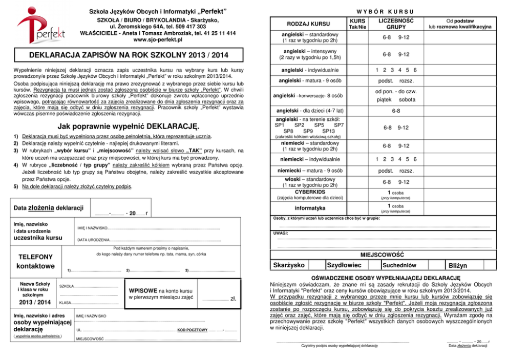 Szkoła Języków Obcych i Informatyki „Perfekt” WYBÓR KURSU SZKOŁA / BIURO / BRYKOLANDIA - Skarżysko, ul. Żeromskiego 64A, tel. 509 417 303 WŁAŚCICIELE - Aneta i Tomasz Ambroziak, tel. 41 25 11 414 www.sjo-perfekt.pl RODZAJ KURSU KURS Tak/Nie LICZEBNOŚĆ GRUPY angielski – standardowy (1 raz w tygodniu po 2h) 6-8 9-12 DEKLARACJA ZAPISÓW NA ROK SZKOLNY 2013 / 2014 angielski – intensywny (2 razy w tygodniu po 1,5h) 6-8 9-12 Wypełnienie niniejszej deklaracji oznacza zapis uczestnika kursu na wybrany kurs lub kursy prowadzony/e przez Szkołę Języków Obcych i Informatyki „Perfekt” w roku szkolnym 2013/2014. angielski - indywidualnie Osoba podpisująca niniejszą deklarację ma prawo zrezygnować z wybranego przez siebie kursu lub kursów. Rezygnacja ta musi jednak zostać zgłoszona osobiście w biurze szkoły „Perfekt”. W chwili zgłoszenia rezygnacji pracownik biurowy szkoły „Perfekt” dokonuje zwrotu wpłaconego uprzednio wpisowego, potrącając równowartość za zajęcia zrealizowane do dnia zgłoszenia rezygnacji oraz za zajęcia, które mają się odbyć w dniu zgłoszenia rezygnacji. Pracownik szkoły „Perfekt” wystawia wówczas pisemne poświadczenie zgłoszenia rezygnacji. Jak poprawnie wypełnić DEKLARACJĘ. 1) Deklaracja musi być wypełniona przez osobę pełnoletnią, która reprezentuje ucznia. 2) Deklarację należy wypełnić czytelnie - najlepiej drukowanymi literami. 3) W rubrykach „wybór kursu” i „miejscowość” należy wpisać słowo „TAK” przy kursach, na które uczeń ma uczęszczać oraz przy miejscowości, w której kurs ma być prowadzony. 4) W rubryce „liczebność / typ grupy” należy zakreślić kółkiem wybraną przez Państwa opcję. Jeżeli liczebność lub typ grupy są Państwu obojętne, należy zakreślić wszystkie akceptowane przez Państwa opcje. 5) Na dole deklaracji należy złożyć czytelny podpis. 1 2 3 4 5 6 angielski - matura - 9 osób podst. - .............. ............. piątek angielski - dla dzieci (4-7 lat) Imię, nazwisko i data urodzenia angielski - na terenie szkół: SP1 SP2 SP5 SP7 SP8 SP9 SP13 niemiecki – standardowy (1 raz w tygodniu po 2h) 9-12 niemiecki – indywidualnie 1 2 3 4 5 6 niemiecki – matura - 9 osób podst. włoski – standardowy (1 raz w tygodniu po 2h) CYBERKIDS 6-8 rozsz. 9-12 1 osoba (przy komputerze) 1 osoba (przy komputerze) .................................................................................................................................................................................................................... .................................................................................................................................................................................................................... Pod każdym numerem prosimy o napisanie, do kogo należy dany numer telefonu np. tata, mama, syn, córka 1).................................................. SZKOŁA............................................ ......................................................... 2).................................................. Imię, nazwisko i adres osoby wypełniającej deklarację MIEJSCOWOŚĆ 3).............................................. WPISOWE na konto kursu w pierwszym miesiącu zajęć .......................... KLASA............................................... ( wypełnia osoba pełnoletnia ) 6-8 (zakreślić kółkiem właściwą szkołę) ................................................................................................................................................................................................................ DATA URODZENIA.............................................................................................................. TELEFONY 2013 / 2014 9-12 UWAGI: uczestnika kursu Nazwa Szkoły i klasa w roku szkolnym 6-8 Osoby, z którymi uczeń lub uczennica chce być w grupie: IMIĘ I NAZWISKO............................................................................................................... kontaktowe sobota 6-8 informatyka - 20......... r rozsz. od pon. - do czw. angielski –konwersacje- 8 osób (zajęcia komputerowe dla dzieci) Data złożenia deklaracji Od podstaw lub rozmowa kwalifikacyjna zł. IMIĘ I NAZWISKO ................................................................................................................................. UL. .............................................................................................KOD POCZTOWY ....... ......- ............ MIEJSCOWOŚĆ ................................................................................................................................... Skarżysko Szydłowiec Suchedniów Bliżyn OŚWIADCZENIE OSOBY WYPEŁNIAJĄCEJ DEKLARACJĘ Niniejszym oświadczam, że znane mi są zasady rekrutacji do Szkoły Języków Obcych i Informatyki "Perfekt" oraz ceny kursów obowiązujące w roku szkolnym 2013/2014. W przypadku rezygnacji z wybranego przeze mnie kursu lub kursów zobowiązuję się osobiście zgłosić rezygnację w biurze szkoły "Perfekt". Jeżeli moja rezygnacja zgłoszona zostanie po rozpoczęciu kursu, zobowiązuję się do pokrycia kosztu zrealizowanych już zajęć oraz zajęć, które mają się odbyć w dniu zgłoszenia rezygnacji. Wyrażam zgodę na przechowywanie przez szkołę "Perfekt" wszystkich danych osobowych wyszczególnionych w niniejszej deklaracji. ................................................................................................................................... Czytelny podpis osoby wypełniającej deklarację ........... – ........... – 20……r Data złożenia deklaracji