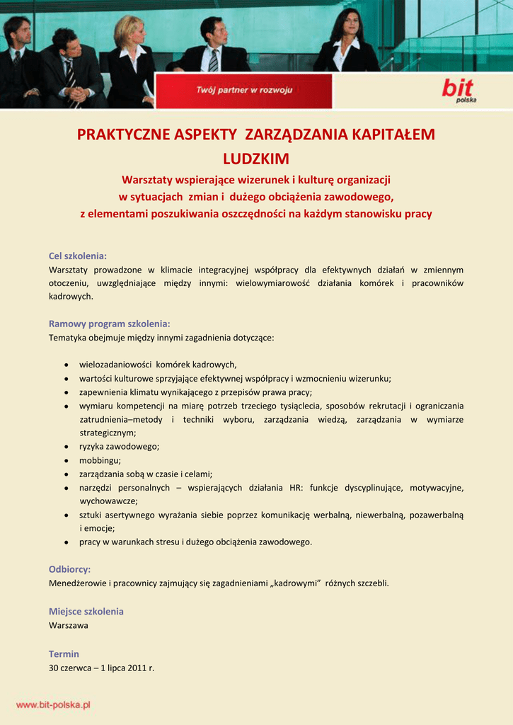 PRAKTYCZNE ASPEKTY ZARZĄDZANIA KAPITAŁEM LUDZKIM Warsztaty wspierające wizerunek i kulturę organizacji w sytuacjach zmian i dużego obciążenia zawodowego, z elementami poszukiwania oszczędności na każdym stanowisku pracy Cel szkolenia: Warsztaty prowadzone w klimacie integracyjnej współpracy dla efektywnych działao w zmiennym otoczeniu, uwzględniające między innymi: wielowymiarowośd działania komórek i pracowników kadrowych. Ramowy program szkolenia: Tematyka obejmuje między innymi zagadnienia dotyczące: wielozadaniowości komórek kadrowych, wartości kulturowe sprzyjające efektywnej współpracy i wzmocnieniu wizerunku; zapewnienia klimatu wynikającego z przepisów prawa pracy; wymiaru kompetencji na miarę potrzeb trzeciego tysiąclecia, sposobów rekrutacji zatrudnienia–metody i techniki wyboru, zarządzania wiedzą, zarządzania strategicznym; ryzyka zawodowego; mobbingu; zarządzania sobą w czasie i celami; narzędzi personalnych – wspierających działania HR: funkcje dyscyplinujące, wychowawcze; sztuki asertywnego wyrażania siebie poprzez komunikację werbalną, niewerbalną, i emocje; pracy w warunkach stresu i dużego obciążenia zawodowego. Odbiorcy: Menedżerowie i pracownicy zajmujący się zagadnieniami „kadrowymi” różnych szczebli. Miejsce szkolenia Warszawa Termin 30 czerwca – 1 lipca 2011 r. i ograniczania w wymiarze motywacyjne, pozawerbalną Czas trwania szkolenia 2 dni Cena za szkolenie 1200 PLN + 23% VAT/ 2 dni szkolenia W cenę wliczono: Materiały szkoleniowe, ciepły posiłek, przerwy kawowe Prowadzący Elżbieta Maria Komorowska (dyplom Trenera Phare, praktyka w Dusseldorfie ), coach, konsultant, doradca, praktyk z ugruntowanym przygotowaniem merytorycznym, wynikającym między innymi z wieloletniej praktyki zawodowej na stanowiskach dyrektorskich (również w korporacji ogólnopolskiej na stanowisku Dyrektora Departamentu Zarządzania Zasobami Ludzkimi oraz Doradcy Zarządu ds. rozwoju w jednej z największych korporacji energetycznych) i edukacyjnej na wyższych uczelniach ( w tym także Wyższej Szkole Przedsiębiorczości i Zarządzania im. L. Koźmioskiego w Warszawie ). Efekty pracy (m.in. w zakresie przyjaznej kultury organizacyjnej) zaskutkowały przyznaniem ( firmie za kadencji Dyrektora) tytułu Pracodawcy Roku w rankingu przeprowadzonym przez czasopismo Newsweek oraz Business Centre Club na Pracodawcę roku. Przygotowanie merytoryczne potwierdzone kilkoma dyplomami (ekonomia, psychologia, zarządzanie na świecie, samorząd) wyższych uczelni (Akademia Ekonomiczna w Krakowie, Uniwersytet Warszawski, Szkoła Główna Handlowa w Warszawie) i kilkunastoma certyfikatami ,również z udziałem tzw. „guru światowego zarządzania”. Certyfikowany Human Resources Manager. Autorka kilku książek, (miedzy innymi: „Vademecum skutecznego działania”„ „Sukces wyborczy i zawodowy”), ponad 200 publikacji (dot. uwarunkowao sukcesu w konkurencyjnym rynku, zarządzania, efektywnego działania etc.) Wieloletnie doświadczenie z zakresu szkoleo i coachingów. ZGŁOSZENIE Na szkolenie …………………………………………………………………………………………………………………………… organizowane w dniu …………………………………………………… w godz. 9.00-17.00 przez firmę bit Polska Sp. z o.o. w Warszawie przy ul. Ostrobramskiej 101a, 4 piętro. DANE UCZESTNIKA: Imię i Nazwisko Stanowisko E-mail Akceptuję koszt szkolenia w wysokości: ……………… za osobę. RAZEM: …………..PLN Razem słownie: ……………………………………………………………………………………… …………………………………………………………(+ 23% VAT) Zamawiający Firma / instytucja: Imię / nazwisko osoby upoważnionej do reprezentowania uczestnika Ulica: Adres: Miejscowośd: …………………………………………………………………….. Kod pocztowy: NIP: Telefon: Fax: E-mail Adres do korespondencji Przesyłając powyższe zgłoszenie zgadzam się na otrzymywanie pocztą elektroniczną na podany powyżej adres e-mail ofert szkoleniowych i doradczych firmy bit Polska Sp. z o.o. zgodnie z Ustawą o świadczeniu usług drogą elektroniczną z dnia 26 sierpnia 2002 r. (Dz. U. nr 144 poz. 1204) Zgodnie z Ustawą o ochronie danych osobowych z dnia 29 sierpnia 1997 r. (Dz. U. nr 133 poz. 883) wiem, że przysługuje mi prawo wglądu do moich danych oraz prawo do ich poprawiania (dotyczy osób fizycznych). WARUNKI ZGŁOSZENIA Przesłanie zgłoszenia faksem (0-22) 465 60 81 lub e-mailem: [email protected] najpóźniej tydzieo przed rozpoczęciem szkolenia. Dokonanie przelewu na konto bit Polska Sp. z o.o. ul. Ostrobramska 101A, 04-041 Warszawa najpóźniej 5 dni przed szkoleniem: Volkswagen Bank direct nr: 02 21 30 0004 2001 0327 6664 0001. Po otrzymaniu zgłoszenia wyślemy do Paostwa fakturę pro-forma. Fakturę VAT wystawimy po otrzymaniu płatności. Zwrotu wpłaconej kwoty dokonujemy na podstawie pisemnej rezygnacji, nie później niż na 5 dni przed terminem szkolenia. Po tym terminie zwracamy 50% wartości szkolenia. Jednocześnie upoważniam firmę bit Polska Sp. z o.o. do wystawiania faktur bez podpisu odbiorcy. -----------------------------------------------Data i czytelny podpis -------------------------------------Pieczątka firmy