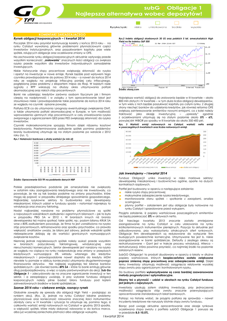 KOMENTARZ ZARZĄDZAJĄCEGO Rynek obligacji korporacyjnych – I kwartał 2014 Początek 2014 roku przyniósł kontynuację korekty z końca 2013 roku - na rynku Catalyst wywołaną głównie problemami płynnościowymi części inwestorów instytucjonalnych, oraz poszukiwaniem kapitału prze wiele spółek, rolujących obligacje oraz oczekiwane zmiany w OFE. Rys.2 Indeks obligacji skarbowych 30 US oraz polskich 5 lat, amerykańskich High Yield na tle indeksu S&P 500 Na zachowanie rynku obligacji korporacyjnych aktualnie wpływają przede wszystkim konieczność „zrolowania” znacznych ilości obligacji co zwiększa ryzyko przede wszystkim dla inwestorów indywidualnych samodzielnie inwestujących. Niskie historycznie stopy procentowe zwiększają skłonność do ryzyka i apetyt na inwestycje w nowe emisje. Rynek będzie pod wpływem tego czynnika prawdopodobnie do połowy 2014 roku – a nawet do końca 2014 roku ze względu na projekcję inflacyjną poniżej celu inflacyjnego, pogłębioną przez problemy z eksportem mięsa do Rosji. W każdym razie sygnały z RPP wskazują na dłuższy okres utrzymywania polityki akomodacyjnej oraz niskich stóp procentowych Banki nie udzielając kredytów zarówno osobom fizycznym jak i firmom cierpią na nadpłynność i w związku z tym oprocentowanie lokat jest stosunkowo niskie i prawdopodobnie takie pozostanie do końca 2014 roku ze względu na czynniki opisane powyżej. Polityka ECB co do utrzymania i prognozy ewentualnego zwiększenia OMT, a także utrzymania polityki akomodacyjnej w Europie, w tym możliwość wprowadzenia ujemnych stóp procentowych w celu zniwelowania ryzyka związanego z ograniczaniem QE3 przez FED zwiększają skłonność do ryzyka inwestorów. Czynniki makroekonomiczne sprzyjają firmom dzięki niższemu kosztowi kredytowania. Przeterminowane zadłużenie spółek pomimo problemów branży budowlanej utrzymuje się na stałym poziomie po wzroście z 2012 roku (rys. 1). Źródło: stooq.com Największa wartość obligacji do zrolowania będzie w III kwartale – około 800 mln złotych i IV kwartale – w tym duża liczba obligacji deweloperów, w tym wielu z nich będzie poszukiwać kapitału po całym rynku. Z drugiej strony niechęć banków do udzielania kredytów, jak również reforma OFE zwiększą zainteresowanie emitentów nowymi emisjami, co z kolei należy traktować jako okazję inwestycyjną – „spready” zgodnie z oczekiwaniami utrzymują się na stałym poziomie około 5% - 6%, powyżej 6M WIBOR po spadku w III kwartale do około 350-400 pkt. Rys. 3 Wartość emisji notowanych na Catalyst, wartość w poszczególnych kwartałach oraz liczba notowanych emisji. netto emisji Rys.1 Należności bankowe z utratą wartości (w mln zł) Jak inwestujemy – I kwartał 2014 Źródło: Opracowanie GO TFI na podstawie danych NBP Polskie przedsiębiorstwa podobnie jak amerykańskie nie zwiększały w ostatnim roku zaangażowania kredytowego oraz nie inwestowały, co powoduje, że nie są tak bardzo podatne na zmiany przychodów, które mogą się pojawić w przypadku silniejszego spowolnienia gospodarczego. Najbardziej ryzykowne sektory to budowlanka oraz deweloperzy mieszkaniowi, których udział w funduszu spada – natomiast największy to windykacja oraz znaczny faktoring. Nadal najbardziej narażone na problemy płynnościowe są spółki o najwyższych wskaźnikach zadłużenia i ogromnych bilansach – jak to było w przypadku PBG SA w 2012 r. W branżach innych niż branża deweloperska też można spotkać takie spółki, np.: poziom bilansu KRUK SA wraz z 80% zadłużeniem powoduje, że firma ta jest uwrażliwiona na ryzyko stóp procentowych, refinansowania oraz spadku przychodów, co prawda większość analityków uważa, że bilans jest zdrowy, jednak wskaźniki spółki niebezpiecznie zbliżają się do wartości granicznych wymuszających zwiększenie kosztów. Niemniej jednak najciekawszych spółek należy szukać przede wszystkim w branżach: pożyczkowej, faktoringowej, windykacyjnej oraz nieruchomości komercyjnych. Sektor deweloperski jest narażony na ryzyko ze względu na ciążąca na rynku nadprodukcję oraz zmiany w przepisach kredytowych wymuszające 5% wkładu własnego dla kredytów mieszkaniowych i prawdopodobnie nawet dopłata do kredytu MDM niewiele tu pomoże w obliczu konieczności utrzymania długoterminowego finansowania aktywów. Nie najlepiej wyglądają też bilanse banków spółdzielczych – jak również banku BPS SA – które to banki emitują głównie dług podporządkowany, a więc o ryzyku porównywalnym do akcji. Sub Go Obligacje 1 – zdecydowało się na znaczne ograniczenie inwestycji w ten sektor, i a zarządzający uważają, iż przy wyborze funduszu obligacji korporacyjnych należy pilnie badać bilans funduszu pod kątem zainwestowanych środków w banki spółdzielcze. Szanse 2014 roku – ciekawe emisje, rosnący rynek Globalnie zawęziły się spready dla obligacji High Yield – podążając za rynkiem akcji. (Rys. 2), jednak na rynku Catalyst lokalne problemy płynnościowe oraz konieczność rolowania znacznej ilości instrumentów obniżyły ceny w IV kwartale i sytuacja ta utrzymuje się, pomimo tego, iż całkowita wartość emisji notowanych na Catalyst w grudniu 2013 spadła, a większość spółek, które miały dokonać rolowania w do końca marca, albo już wcześniej zaniechała płatności albo obligacje wykupiła. Fundusz Obligacji1 unika inwestycji w nisko marżowe sektory: deweloperkę mieszkaniową i budownictwo ogólne, oparte na dużych kontraktach rządowych. Portfel jest budowany w oparciu o następujące założenia: niskie ryzyko stopy procentowej maksymalne zabezpieczenie ryzyka kredytowego. monitorowanie stanu spółek – spotkanie z zarządami, analiza scoringowa płynny portfel – założeniem jest aby obligacje były notowane na rynku Catalyst i sprzedawane przed wykupem. Przyjęto założenie, iż papiery wartościowe p