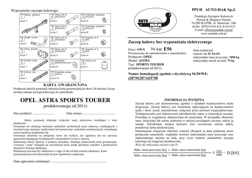 PPUH AUTO-HAK Sp.J. WyposaŜenie zaczepu kulowego: Produkcja Zaczepów Kulowych Henryk & Zbigniew Nejman 76-200 SŁUPSK ul. Słoneczna 16K tel/fax (059) 8-414-414; 8-414-413 E-mail: [email protected] www.autohak.com.pl Zaczep kulowy bez wyposaŜenia elektrycznego E56 Klasa: A50-X Nr kat. Przeznaczony do zamontowania w samochodzie: Producent: OPEL Model: ASTRA Typ: SPORTS TOURER produkowanym od 2011r. Dane techniczne: wartość siły D: 9,6 kN maksymalna masa przyczepy: 1800 kg maksymalny nacisk na kulę: 75 kg Numer homologacji zgodnie z dyrektywą 94/20/WE: e20*94/20*1419*00 KARTA GWARANCYJNA Producent udziela gwarancji niniejszą kartą gwarancyjną na okres 24 miesięcy licząc od dnia zakupu zaczepu kulowego do samochodu: OPEL ASTRA SPORTS TOURER produkowanego od 2011r. Data produkcji .............................. Data zakupu............................................. Zakres gwarancji obejmuje wyłącznie wady jakościowe wynikające z winy producenta. Gwarancja nie obejmuje natomiast uszkodzeń zawinionych przez nabywcę, wynikających z niewłaściwego montaŜu, uŜytkowania lub konserwacji, uszkodzeń mechanicznych, normalnego zuŜycia podczas eksploatacji itp. Gwarancja udzielona na zakupiony towar nie wyłącza, nie ogranicza ani nie zawiesza uprawnień kupującego wynikających z niezgodności towaru z umową. Reklamacje naleŜy zgłaszać w punkcie sprzedaŜy, składając jednocześnie kartę gwarancyjną. Usunięcie "wady" następuje po stwierdzeniu przez punkt sprzedaŜy wspólnie z producentem słuszności złoŜonej reklamacji. Reklamacja powinna być załatwiona w ciągu 14 dni od dnia uznania reklamacji. Karta gwarancyjna jest niewaŜna jeŜeli nie jest wypełniona i podpisana. Data zgłoszenia reklamacji: ................................................................... INFORMACJA WSTĘPNA Zaczep kulowy jest skonstruowany zgodnie z zasadami bezpieczeństwa ruchu drogowego. Zaczep kulowy jest elementem wpływającym na bezpieczeństwo jazdy i moŜe zostać zainstalowany wyłącznie przez personel wyspecjalizowany. Niedopuszczalne jest dokonywanie jakichkolwiek zmian w konstrukcji zaczepu. Powoduje to wygaśniecie dopuszczenia do stosowania. W przypadku obecności masy izolacyjnej lub osłony podwozia w miejscu przylegania zaczepu, naleŜy ją usunąć. Nieosłonięte miejsca karoserii oraz wywiercone otwory naleŜy pomalować farbą antykorozyjną. Informacjami wiąŜącymi odnośnie wartości obciąŜeń są dane podawane przez producenta samochodu, względnie wartości maksymalnej masy przyczepy oraz maksymalnego nacisku na kulę, przy czym wartości parametrów zaczepu kulowego nie mogą być przekroczone. Wzór do obliczania wartości siły D: Maks. masa przyczepy [kg] x Maks. masa samochodu [kg] Maks. masa przyczepy [kg] + Maks. masa samochodu [kg] X 9,81 = 1000 D [kN] INSTRUKCJA MontaŜu i eksploatacji zaczepu kulowego Oznaczenie zacisku wg ISO PN 1 L 2 + 3 31 4 R 5 58R 6 54 7 58L 5 Kolejność czynności przy montaŜu Łączenie przewodów Kierunkowskazy lewe Tylne światła przeciwmgłowe Masa Kierunkowskazy prawe Światła pozycyjne prawe Światła hamowania Światła pozycyjne lewe 10 A 4 9 8 1 8 10 A 3 2 7 6 10 10/A Zaczep kulowy przeznaczony jest do zamontowania w samochodzie: OPEL ASTRA SPORTS TOURER, produkowanym od 2011r., nr katalogowy E56 i słuŜy do ciągnięcia przyczep o masie całkowitej 1800 kg i nacisku na kulę max 75 kg. 9 1. Zdemontować zespół tylnych świateł oraz zderzak wraz z jego metalowym wzmocnieniem. Wzmocnienie nie będzie ponownie montowane. 2. PrzyłoŜyć belkę główną zaczepu (poz. 1) do tylnego płata i lekko przykręcić w punktach A. 3. W podłuŜnice wsunąć uchwyty boczne (poz. 4 i 5) w ten sposób aby otwory wsporników pokryły się z otworami w podłuŜnicach. Przykręcić luźno śrubami M10x35mm (poz. 9) jak pokazano na rysunku. 4. Skręcić zamontowane uchwyty (poz. 4 i 5) z belką główną zaczepu (poz. 1) śrubami M12x35mm (poz. 8) jak pokazano na rysunku. 5. Dokręcić wszystkie śruby z momentem jak pokazano w tabeli. 6. Zamontować zderzak po uprzednim wycięciu w jego dolnej krawędzi (w osi symetrii) fragmentu o szerokości 50mm i głębokości 100mm. 7. Przykręcić część kulistą zaczepu (poz. 2) wraz z blachą pod gniazdo (poz. 3) śrubami M12x75mm (poz. 6) oraz M12x70mm (poz. 7) z wyposaŜenia. 8. Zamontować ponownie zespół tylnych świateł. 9. Podłączyć przewody gniazdka 7 – bieg. do instalacji elektrycznej zgodnie z instrukcją fabryczną samochodu (zaleca się wykonanie w ASO). 10. Uzupełnić ewentualne ubytki powłoki malarskiej zaczepu powstałe w trakcie montaŜu. Zalecany moment skręcający dla śrub i nakrętek 8,8: M6 - 11 Nm M 8 - 25 Nm M 10 - 50 Nm M 12 - 87 Nm M 14 - 138 Nm M16 - 210 Nm OD PRODUCENTA UWAGA Dziękujemy za wybór produkowanego przez naszą firmę zaczepu kulowego. Jego niezawodność została potwierdzona licznymi testami oraz opiniami zadowolonych klientów. JednakŜe niezawodność zaczepów kulowych jest zaleŜna równieŜ od prawidłowego montaŜu oraz prawidłowej eksploatacji. Z tego powodu prosimy Państwa o staranne przeczytanie niniejszej instrukcji montaŜu oraz przestrzeganie właściwych wskazówek. Po zamontowaniu zaczepu kulowego naleŜy uzyskać wpis w dowodzie rejestracyjnym pojazdu na „stacji kontroli pojazdów” właściwej dla miejsca zamieszkania. Samochód powinien być wyposaŜony w : -kierunkowskazy boczne -lusterka boczne o rozstawie co najmniej szerokości przyczepy Sprawdzać śruby mocujące zaczepu kulowego po około 1 000 km przebiegu eksploatacji. Kula zaczepu musi być utrzymana w czystości i konserwowana smarem stałym. Zaczep naleŜy zamontować w miejscach do tego celu przeznaczonych przez producenta samochodu.