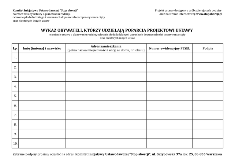 Komitet Inicjatywy Ustawodawczej "Stop aborcji" na rzecz zmiany ustawy o planowaniu rodziny, ochronie płodu ludzkiego i warunkach dopuszczalności przerywania ciąży oraz niektórych innych ustaw Projekt ustawy dostępny u osób zbierających podpisy oraz na stronie internetowej: www.stopaborcji.pl WYKAZ OBYWATELI, KTÓRZY UDZIELAJĄ POPARCIA PROJEKTOWI USTAWY o zmianie ustawy o planowaniu rodziny, ochronie płodu ludzkiego i warunkach dopuszczalności przerywania ciąży oraz niektórych innych ustaw Lp. Imię (imiona) i nazwisko Adres zamieszkania (pełna nazwa miejscowości i ulicy, nr domu, nr lokalu) Numer ewidencyjny PESEL Podpis 1. 2. 3. 4. 5. 6. 7. 8. 9. 10. Zebrane podpisy prosimy odesłać na adres: Komitet Inicjatywy Ustawodawczej "Stop aborcji", ul. Grzybowska 37a lok. 25, 00-855 Warszawa