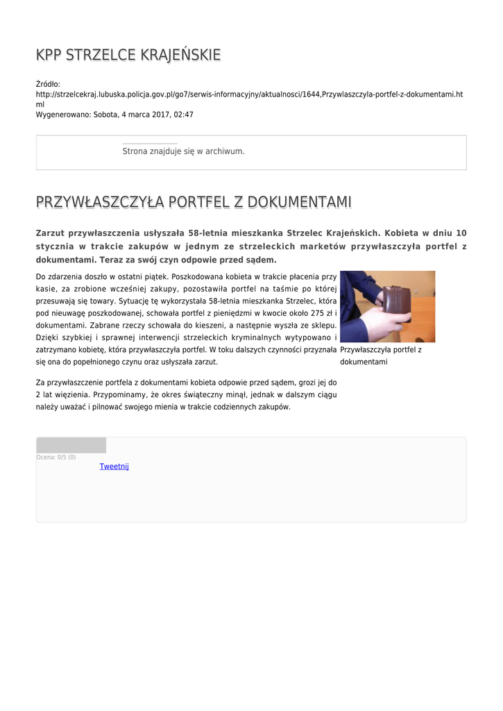 KPP STRZELCE KRAJEŃSKIE Źródło: http://strzelcekraj.lubuska.policja.gov.pl/go7/serwis-informacyjny/aktualnosci/1644,Przywlaszczyla-portfel-z-dokumentami.ht ml Wygenerowano: Sobota, 4 marca 2017, 02:47 Strona znajduje się w archiwum. PRZYWŁASZCZYŁA PORTFEL Z DOKUMENTAMI Zarzut przywłaszczenia usłyszała 58-letnia mieszkanka Strzelec Krajeńskich. Kobieta w dniu 10 stycznia w trakcie zakupów w jednym ze strzeleckich marketów przywłaszczyła portfel z dokumentami. Teraz za swój czyn odpowie przed sądem. Do zdarzenia doszło w ostatni piątek. Poszkodowana kobieta w trakcie płacenia przy kasie, za zrobione wcześniej zakupy, pozostawiła portfel na taśmie po której przesuwają się towary. Sytuację tę wykorzystała 58-letnia mieszkanka Strzelec, która pod nieuwagę poszkodowanej, schowała portfel z pieniędzmi w kwocie około 275 zł i dokumentami. Zabrane rzeczy schowała do kieszeni, a następnie wyszła ze sklepu. Dzięki szybkiej i sprawnej interwencji strzeleckich kryminalnych wytypowano i zatrzymano kobietę, która przywłaszczyła portfel. W toku dalszych czynności przyznała Przywłaszczyła portfel z się ona do popełnionego czynu oraz usłyszała zarzut. Za przywłaszczenie portfela z dokumentami kobieta odpowie przed sądem, grozi jej do 2 lat więzienia. Przypominamy, że okres świąteczny minął, jednak w dalszym ciągu należy uważać i pilnować swojego mienia w trakcie codziennych zakupów. Ocena: 0/5 (0) Tweetnij dokumentami