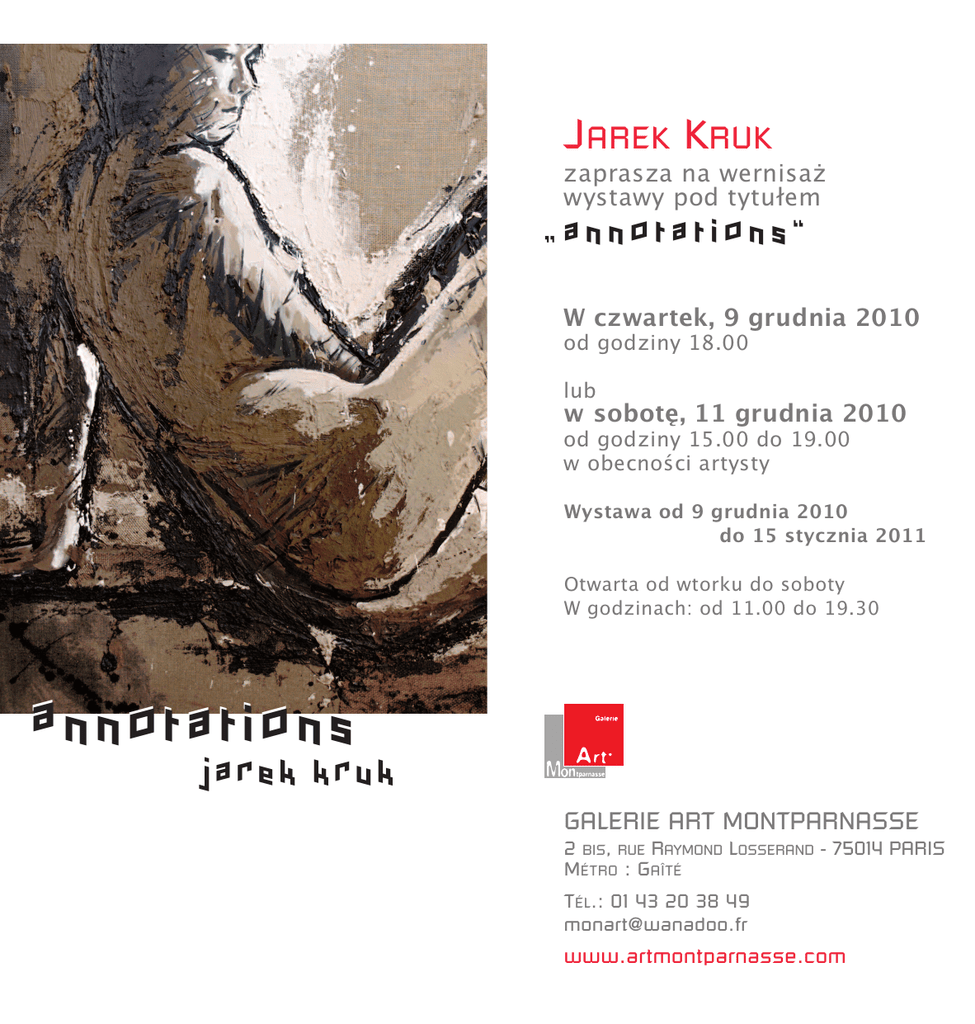 JAREK KRUK zaprasza na wernisa$ wystawy pod tytułem „annotations“ W czwartek, 9 grudnia 2010 od godziny 18.00 lub w sobotę, 11 grudnia 2010 od godziny 15.00 do 19.00 w obecności artysty Wystawa od 9 grudnia 2010 do 15 stycznia 2011 Otwarta od wtorku do soboty W godzinach: od 11.00 do 19.30 a nnnotat notat ions i ons j arek kruk GALERIE ART MONTPARNASSE 2 BIS, RUE RAYMOND LOSSERAND - 75014 PARIS MÉTRO : GAÎTÉ TÉL.: 01 43 20 38 49 [email protected] www.artmontparnasse.com