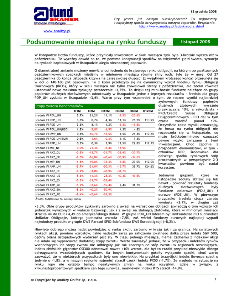 12 grudnia 2008 Czy jesteś już naszym subskrybentem? To najprostszy i najszybszy sposób otrzymywania naszych raportów. Bezpłatnie. http://www.analizy.pl/subskrypcja.shtml www.analizy.pl Podsumowanie miesiąca na rynku funduszy listopad 2008 W listopadzie liczba funduszy, które przyniosły inwestorom w skali miesiąca zysk była 3-krotnie wyższa niż w październiku. To wyraźny dowód na to, że pomimo kontynuacji spadków na większości giełd świata, sytuacja na rynkach kapitałowych w listopadzie uległa nieznacznej poprawie. O diametralnej zmianie możemy mówić w odniesieniu do krajowego rynku obligacji, na którym po gwałtownych październikowych spadkach mieliśmy w minionym miesiącu równie silny ruch, tyle że w górę. Od 27 października do końca listopada krzywa na całej swojej długości (z wyjątkiem krótszego końca) przesunęła się w dół o 140-160 pkt bazowych. To z kolei przełożyło się na dynamiczny wzrost Indeksu Rynku Obligacji Skarbowych (IROS), który w skali miesiąca nie tylko zniwelował straty z października, ale zdołał również ustanowić nowe maksima zyskując ostatecznie +3,75%. To dzięki tej mini-hossie fundusze należące do grupy papierów dłużnych złotówkowych odnotowały w listopadzie jedne z lepszych rezultatów - średnia dla grupy PDP_UN zyskała w listopadzie +3,6%. Warto przy tym wspomnieć o tym, że roczne wyniki najbardziej zyskownych funduszy papierów dłużnych złotowych wyraźnie Stopy zwrotu benchmarków przekraczają 10%, a rekordzista O1M O3M O12M O36M O60M O120M PKO/Credit Suisse Obligacji średnia FI PDU_UN 3,7% 21,2% 11,1% -9,5% -20,6% Długoterminowych - FIO dał w tym średnia FI PDP_UN 3,6% 0,7% 4,3% 11,1% 26,2% 113,9% czasie zarobić ponad 19%. średnia FI PDE_UN 3,3% 8,1% 1,2% -5,3% -15,8% Oczywiście takie wyniki oznaczają, że hossa na rynku obligacji nie średnia FI PDU_UN(USD) 1,2% -5,8% -6,5% 1,3% 4,8% średnia FI SWP_UN 0,6% -10,7% -18,5% 1,5% 26,4% 117,8% rozpoczęła się w listopadzie, co może krótkoterminowo oznaczać średnia FI PDE_UN(EUR) 0,5% -1,6% -0,3% 1,1% 7,3% pewne ryzyko związane z tymi średnia FI RPP_UN 0,3% 0,3% 3,9% 11,5% 22,8% 112,7% inwestycjami. Choć zgodnie z średnia FI MIZ_NE -0,0% -21,3% -31,4% -14,9% prognozami ekonomistów, w tym członków RPP, środowisko dla średnia FI AKZ_GL -0,3% -13,7% -31,7% -33,4% -30,7% dalszego spadku rynkowych stóp średnia FI AKZ_EU -1,0% -16,8% -40,6% -36,9% -34,6% procentowych w perspektywie 2-3 średnia FI MIP_UN -1,6% -19,8% -32,3% -6,8% 27,0% 112,0% kwartałów powinno być nadal średnia FI AKP_UN -3,7% -31,0% -50,3% -15,7% 32,7% 124,6% korzystne. średnia FI AKZ_NE -4,9% -33,0% -48,9% -34,7% Jedynymi grupami, które w listopadzie zdołały zbliżyć się lub średnia FI AKZ_ES -5,3% -33,7% -53,4% nawet - pokonać rezultaty funduszy średnia FI AKP_MS -5,7% -31,6% -55,4% 2,4% 31,7% dłużnych złotówkowych były średnia FI AKZ_EM -8,2% -40,2% -50,9% fundusze dolarowe (PDU_UN) i średnia FI AKZ_RE -9,4% -42,6% -63,3% eurowe (PDE_UN). W pierwszym przypadku średnia stopa zwrotu Źródło: FUNDonline FI, Analizy Online wyniosła +3,7%, w drugim zaś +3,3%. Obie grupy produktów zyskiwały zarówno z uwagi na wzrost cen obligacji (świadczą o tym wzrosty ich jednostek wyrażonych w walucie bazowej), jak i z uwagi na słabnącą złotówkę, która w minionym miesiącu straciła 4% do EUR i 4,4% do amerykańskiego dolara. W grupie PDU_UN liderem był UniFundusze FIO subfundusz UniDolar Obligacje, którego jednostka wzrosła +7,5%, zaś wśród funduszy eurowych najlepiej wypadł najmłodszy produkt w grupie DWS Parasol SFIO Subfundusz DWS Euroobligacji (+8,2%). średnia FI AKZ_US -5,3% -11,3% -28,3% -40,3% -43,5% Niewiele dobrego można nadal powiedzieć o rynku akcji, zarówno w kraju jak i za granicą. Na światowych rynkach akcji, pomimo wzrostów, jakie nadeszły zaraz po zaliczeniu lokalnego dołka przez indeks S&P 500, ogólny bilans listopadowych wydarzeń jest zły. W ciągu pełnego miesiąca, niemal żadnemu z indeksów akcji nie udało się wypracować dodatniej stopy zwrotu. Warto zauważyć jednak, że w przypadku indeksów rynków wschodzących ich stopy zwrotu nie odbiegały już tak znacząco od stóp zwrotu w regionach rozwiniętych. Indeks chińskich gigantów CSI300 odnotował nawet +10% wzrost, ale był to rzadki przykład niezwykle silnego odreagowania wcześniejszych spadków. Na innych kontynentach gościły wyłącznie spadki, choć warto zauważyć, że w niektórych przypadkach były one niewielkie. Na przykład brazylijski indeks Bovespa spadł o jedynie o -1,8%, a w naszym regionie najmniej stracił czeski indeks PX50 (-1,7%). Ze względu na sytuację na rynku ropy nie osłabło tempo negatywnych zmian na rynku rosyjskim, gdzie w związku z kilkunastoprocentowym spadkiem cen tego surowca, moskiewski indeks RTS stracił -14,9%. © Copyright by Analizy Online Sp. z o.o. 1 12 grudnia 2008 Czy jesteś już naszym subskrybentem? To najprostszy i najszybszy sposób otrzymywania naszych raportów. Bezpłatnie. http://www.analizy.pl/subskrypcja.shtml www.analizy.pl Głównych wydarzeniem miesiąca były obniżki stóp procentowych, które miały miejsce w Europie. Bank of England obniżył jednorazowo stopę procentową o -150 pkt bazowych, Europejski Bank Centralny zdecydował się na obniżkę o -0,5 pkt proc. Obniżki o -100 pkt bazowych dokonał nawet Swiss National Bank. Synchronizacja działań miała być jasnym sygnałem, że władze monetarne chcą stymulować rozwój gospodarczy w pogrążonej recesją Europie. Pomimo tych wieści, indeksy europejskie zniżkowały w ślad za ogólnoświatowym trendem. Brytyjski FTSE 250 spadł o -3%, niemiecki DAX o -6,4%, a francuski CAC40 o -6,4%. Zapowiedzi dalszego cięcia stóp procentowych w USA, nie przełożyły się również na amerykański rynek akcji. Indeks amerykańskich blue chipów tj. S%P 500 zakończył miesiąc z –7,5% stratą. Wśród funduszy 