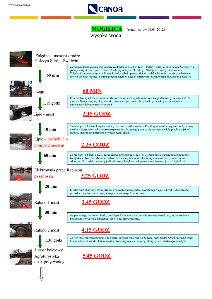 www.canoa.com.pl MOGILICA wysoka woda (ostatni spływ 06.01.2012) Żołędno – most na drodze Połczyn Zdrój - Świdwin 60 min Zwodować kajak można przy moście na drodze nr 152 Świdwin – Połczyn Zdrój w okolicy wsi Żołędno. Na początek szybki nurt, potem przez chwilę płyniemy wzdłuż drogi. Następnie mijamy zabudowania Żołędna i kamieniste bystrze. Potem krótki, szybki i prosty odcinek po łąkach i znów jesteśmy w lesie na krętej i szybkiej rzeczce. 5 minut przed mostem w Łęgach mijamy na lewym brzegu zniszczony kościółek 60 MIN Łęgi 1,15 godz Lipie - most 10 min Lipie – pochyły 3m próg pod mostem 60 min Przy bardzo wysokim poziomie wody pod mostem w Łęgach możemy mieć problem aby się zmieścić. Za mostem 50m prostej szybkiej rzeczki, potem jest jeszcze szybciej i zakręt za zakrętem. Niezbędna umiejętność dobrego manewrowania 2,15 GODZ 5 minut, przed Lipiem koryto rzeki się poszerza, a rzeka zwalnia. Pod drugim mostem wysoki pochyły próg możliwy do spłynięcia, konieczne rozpoznanie z brzegu, gdyż za każdym razem na dole przybywa jakieś drzewo, które może uniemożliwić bezpieczny zjazd. 2,25 GODZ Za progiem jest płytko. Dalej rzeka znowu przyśpiesza i kręci. Miejscami niskie gałęzie leszczyn trochę komplikują płynięcie. Mimo wszystko zdarzają się króciutkie chwile wytchnienia, kiedy możemy się odprężyć. Nie będzie przesadą, jeśli pokonany dotąd odcinek porównamy do rwącej rzeczki górskiej. Elektrownia przed Rąbinem przenoska 3,25 GODZ 20 min Elektrownie obnosimy prawą stroną, wodowanie niewygodne. Powoli pojawiają się krzaki, które trochę przeszkadzają, lecz mimo wszystko płynie się dosyć komfortowo Rąbino 1 most 30 min Rąbino 2 most 1,30 godz 1 most kolejowy Agroturystyka mały próg wodny 3,45 GODZ Od pierwszego mostu jest blisko do sklepu. Dalej rzeka nie zmienia swojego charakteru, może trochę się poszerzyła i wydaje się łatwiejsza, albo to my przywykliśmy. 4,15 GODZ Za tym mostem rzeka zwalnia i miejscami zaczyna rozlewać się po lesie, przy bardzo wysokim stanie wody trudno odnaleźć koryto. Tuż za mostem kolejowym jest niski próg, stawy rybne i chyba agroturystyka. 5,45 GODZ www.canoa.com.pl Powoli zaczyna się robić mniej atrakcyjnie a bardziej uciążliwie. Do obniesienia mamy też za nisko zawieszony mostek. 30 min 6 15 GODZ 2-gi most kolejowy 15 min Przepływamy po raz drugi pod mostem kolejowym. Ze względu na krzaki i powalone drzewa zaczynamy zdecydowanie zwalniać. Most drogowy przed Czarnowąsami 6,30 GODZ Po minięciu mostu płyniemy wzdłuż drogi w wąskim wąwozie. Chwilowo jest łatwiej i przyjemniej 10 min Czarnowąsy, 2m pochyły próg pod mostem 6,40 GODZ Próg pod mostem spływalny, ale uwaga na gruzowisko kamieni za progiem. Na progu trzeba trzymać się prawej strony. Dalszy odcinek to przebijanie się przez krzaki, które nieraz przy wysokiej wodzie można opłynąć polami. 65 min Koniec Rogowa, mały próg, Most na drodze do Dębczyna Tutaj najkorzystniej spływ zakończyć, gdyż dalej, aż do Parsęty, to istna męczarnia. Drzewa, łozy i krzaki tak upodobały sobie tą rzekę, że rośną praktycznie tylko w niej. 25 min 8,10 GODZ Dębczyno – mostek 10 min 7,45 GODZ Jeszcze 2 za niskie do przepłynięcia mostki i powoli wpłyniemy na autostradę, jaką jest bez wątpienia, w porównaniu z Mogilicą, Parsęta Rzeka Parsęta 40 min Białogard – przystań 8,20 GODZ 5 minut za mostem drogowym w Białogardzie, na prawym brzegu jest przystań. Tam można wygodnie dojechać samochodem i odebrać kajak. 9 GODZ Podsumowując: rzeka zwałkowa, choć przy wysokim stanie wody mniej uciążliwa, a odcinek do Rąbina wybitnie górski. Kajaki to wyłącznie krótkie polietylenowe jedynki. Przy wysokim stanie wody wymagane jest u kajakarza opływanie i umiejętność podejmowanie szybko właściwych decyzji. Nie polecam na spływy grupowe – max 2 -3 kajaki w dużych odstępach od siebie. Ogólnie rzeka trudna, lecz bardzo atrakcyjna. POLECAM!!!