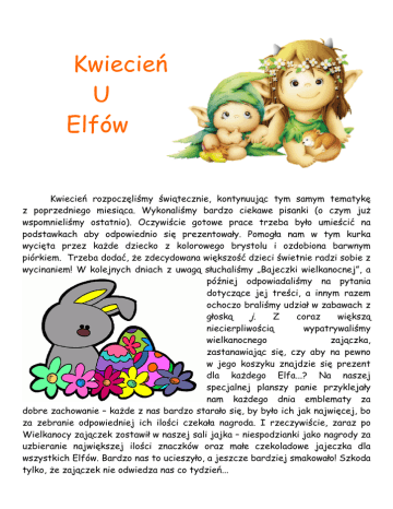 Kwiecień U Elfów Kwiecień rozpoczęliśmy świątecznie, kontynuując tym samym tematykę z poprzedniego miesiąca. Wykonaliśmy bardzo ciekawe pisanki (o czym już wspomnieliśmy ostatnio). Oczywiście gotowe prace trzeba było umieścić na podstawkach aby odpowiednio się prezentowały. Pomogła nam w tym kurka wycięta przez każde dziecko z kolorowego brystolu i ozdobiona barwnym piórkiem. Trzeba dodać, że zdecydowana większość dzieci świetnie radzi sobie z wycinaniem! W kolejnych dniach z uwagą słuchaliśmy „Bajeczki wielkanocnej”, a później odpowiadaliśmy na pytania dotyczące jej treści, a innym razem ochoczo braliśmy udział w zabawach z głoską j. Z coraz większą niecierpliwością wypatrywaliśmy wielkanocnego zajączka, zastanawiając się, czy aby na pewno w jego koszyku znajdzie się prezent dla każdego Elfa...? Na naszej specjalnej planszy panie przyklejały nam każdego dnia emblematy za dobre zachowanie – każde z nas bardzo starało się, by było ich jak najwięcej, bo za zebranie odpowiedniej ich ilości czekała nagroda. I rzeczywiście, zaraz po Wielkanocy zajączek zostawił w naszej sali jajka – niespodzianki jako nagrody za uzbieranie największej ilości znaczków oraz małe czekoladowe jajeczka dla wszystkich Elfów. Bardzo nas to ucieszyło, a jeszcze bardziej smakowało! Szkoda tylko, że zajączek nie odwiedza nas co tydzień... W kolejnym kwietniowym tygodniu rozmawialiśmy na temat ulubionych zabaw, gier i sportów – poznaliśmy nawet kilka nowych (m. in. „Bingo”, które bardzo przypadło nam do gustu, choć na początku mieliśmy trochę trudności ze zrozumieniem jego reguł). Często rozmawialiśmy o istocie zabawy – radości z uczestnictwa w niej, przestrzegania wszystkich reguł i radzenia sobie z porażką, odpowiedniego reagowania na wygraną (nie obnoszenie się z nią). I tak grając w różne gry drużynowe lub biorąc udział w zabawach nie tylko spędziliśmy bardzo ciekawie ten tydzień, lecz nauczyliśmy się czerpać przyjemność z wysiłku fizycznego bez względu na wynik rywalizacji. Dobrze, powiemy prawdę – zdarzały się nam łzy kręcące w oku, lecz szybciutko przełykaliśmy przegraną by ponownie ruszyć do gry i spróbować czy tym razem uda nam się wygrać. A jeżeli nie teraz to może w kolejnej grze – nikt przecież nie jest zawsze najlepszy. Nawet Adam Małysz dużo ćwiczył zanim stał się mistrzem:) Znalazło się jednak w tym tygodniu coś co nie sprawiało nam najmniejszej trudności – przeliczanie do 10. Poznaliśmy wygląd graficzny tej liczby, ćwiczyliśmy przeliczanie (niektórzy już doskonale w pamięci) w tym zakresie na konkretach: palcach, lalkach, klockach, krzesłach, itp. Oczywiście nadal usprawniamy sobie tę umiejętność. Wiele uwagi poświęciliśmy również na ćwiczenie naszych rączek – wykonywanie szlaczków, wycinanki. Następnym tematem, z jakim przyszło nam się zmierzyć, były zwierzęta – te krajowe oraz egzotyczne. Rozwiązywaliśmy mnóstwo zagadek słownych, dzieliliśmy się wiedzą na temat znanych nam zwierząt, a nawet tworzyliśmy ilustracje do wiersza pt. „Zagroda” - można je było podziwiać w naszej szatni. Mieliśmy też okazję bliżej zapoznać się z głoską ł: Łukasz, łopata, łata, ławka… udało nam się odnaleźć całkiem sporo wyrazów na tę głoskę. A przy okazji wykonać kilka łatwych już dla nas ćwiczeń słownikowych – podzielić i podać liczbę sylab i głosek różnych wyrazów, wymyślić kilka własnych zagadek związanych ze zwierzętami, poopowiadać o tym, jakie my byśmy chcieli posiadać zwierzęta. I w trakcie omawiania tych różnych ciekawych tematów odwiedzili nas, jak zwykle co miesiąc, nasi dobrzy znajomi z Filharmonii. Mieliśmy niepowtarzalną okazję przyjrzeć się fletowi poprzecznemu – jego budowie oraz wysłuchać kilka ciekawych utworów. Jak zawsze był również czas na wspólne przypomnienie sobie poznanych wartości – nut, a także na muzykowanie na instrumentach perkusyjnych. Bardzo lubimy te spotkania, kiedy możemy posłuchać koncertów granych na żywo na ciekawych instrumentach. Widać na owych spotkaniach jak wiele dzieci przeżywa grane melodie, próbuje sobie wyobrazić czego dotyczy dany utwór. Nie raz i nie dwa wychodziliśmy z nich bardzo podekscytowani :) Wiele razy powstały ciekawe prace na różne tematy. Jesteśmy bardzo wdzięczni za te koncerty!!! I tylko troszkę smuci nas perspektywa wakacyjnej rozłąki… Niecierpliwie jednak czekamy na kolejne spotkanie w maju!!! Pewnego dnia przyszło nam przydzielić różne zwierzęta oraz owady do środowisk, w których żyją (zoo, las, gospodarstwo, łąka). Niektóre okazy sprawiły nam nieco trudności, ale z pomocą reszty grupy każdy Elf wykonał swoje zadanie prawidłowo. Wiemy już też, co które zwierzęta spożywają oraz jak należy zachować się w stosunku do nich (przede wszystkim ich nie krzywdzimy, zaś te nieznane raczej omijamy szerokim łukiem). Musimy przyznać, że bardzo podoba nam się zabawa w naśladowanie odgłosów i ruchów zwierząt – mieliśmy okazję w jednym dniu posłuchać odgłosów odtwarzanych z płyty CD, a potem sami się w nie zamienialiśmy. Oczywiście chłopcy najczęściej bywali lwami, tygrysami, zaś dziewczynki kolorowymi papugami lub pawiami… już teraz przebieramy nóżkami nie mogąc doczekać się wycieczki do zoo. Dużo czasu mogliśmy spędzać na świeżym powietrzu, bo pogoda była naprawdę wspaniała – czasem panowały prawdziwe upały, więc tym chętniej przebywaliśmy w parku czy ogródku przedszkolnym. Mamy nadzieję, że aura w maju również będzie dopisywała, bo już cieszymy się na kolejne szaleństwa na świeżym powietrzu! Poznaliśmy piosenki: „Kaczki” Chodzą plotki, że u kaczek brak pod progiem wycieraczek, że po błocie depcą po to, by do domu wnosić błoto „Czyżyk” I. Czyżyku, czyżyku, ptaszku maleńki. Czyś 
