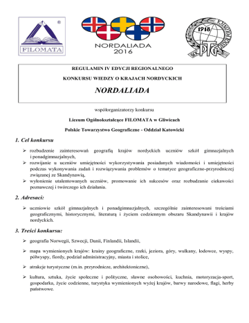 REGULAMIN IV EDYCJI REGIONALNEGO KONKURSU WIEDZY O KRAJACH NORDYCKICH NORDALIADA współorganizatorzy konkursu Liceum Ogólnokształcące FILOMATA w Gliwicach Polskie Towarzystwo Geograficzne - Oddział Katowicki 1. Cel konkursu rozbudzenie zainteresowań geografią krajów nordyckich uczniów szkół gimnazjalnych i ponadgimnazjalnych, rozwijanie u uczniów umiejętności wykorzystywania posiadanych wiadomości i umiejętności podczas wykonywania zadań i rozwiązywania problemów o tematyce geograficzno-przyrodniczej związanej ze Skandynawią, wyłonienie utalentowanych uczniów, promowanie ich sukcesów oraz rozbudzanie ciekawości poznawczej i twórczego ich działania. 2. Adresaci: uczniowie szkół gimnazjalnych i ponadgimnazjalnych, szczególnie zainteresowani treściami geograficznymi, historycznymi, literaturą i życiem codziennym obszaru Skandynawii i krajów nordyckich. 3. Treści konkursu: geografia Norwegii, Szwecji, Danii, Finlandii, Islandii, mapa wymienionych krajów: krainy geograficzne, rzeki, jeziora, góry, wulkany, lodowce, wyspy, półwyspy, fiordy, podział administracyjny, miasta i stolice, atrakcje turystyczne (m.in. przyrodnicze, architektoniczne), kultura, sztuka, życie społeczne i polityczne, sławne osobowości, kuchnia, motoryzacja-sport, gospodarka, życie codzienne, turystyka wymienionych wyżej krajów, barwy narodowe, flagi, herby państwowe. 4. Termin konkursu: etap I (półfinał) i etap II (finał) odbędą się w środę 16 listopada 2016 r. w Liceum FILOMATA, przy ulicy Bojkowskiej 20A w Gliwicach o godzinie 9.00 5. Zasady przeprowadzenia konkursu: Każda szkoła może wystawić do konkursu maksymalnie 2 uczestników, uczestnicy występują w konkursie indywidualnie (każdy uczestnik samodzielnie walczy o jak najlepszy wynik). I etap (półfinał): forma - w tym etapie uczniowie rozwiązują test składający się z zadań otwartych i zamkniętych. Do finału przechodzi dziesięciu najlepszych uczestników (którzy uzyskali najwięcej punktów). W przypadku gdy większa ilość uczestników (większa niż 10) uzyskała taką samą liczbę punktów organizator konkursu może ogłosić dogrywkę lub dopuścić wszystkie osoby z taką samą sumą punktów do finału – decyzję podejmuje wówczas przewodniczący jury konkursu. II etap (finał): forma - podczas finału „na żywo” uczniowie będą odpowiadać (na kartach odpowiedzi) na pytania ukazujące się na ekranie. Pytania te dotyczyć będą charakterystycznych obiektów: architektonicznych i geomorfologicznych, zagadnień świata kultury i sztuki, kuchni, turystyki krajów nordyckich (zostaną one m.in. pokazane na zdjęciach, zaprezentowane w plikach dźwiękowych). Po ukazaniu się pytania uczniowie będą mieli 20 sekund na zapisanie odpowiedzi na karcie. Po ukazaniu się wszystkich slajdów w tym etapie, jury podliczy punkty. 6. Finaliści konkursu: Spośród finalistów troje zwycięzców z największa liczbą punktów – zsumowanych z etapu I i II - zdobędzie nagrody, dyplomy. Pozostali uczestnicy finału otrzymają wyróżnienia. Wszyscy uczestnicy konkursu otrzymają podziękowania i potwierdzenia uczestnictwa w konkursie. 7. Zgłoszenia do konkursu: Zgłoszenia należy przesyłać tylko i wyłącznie drogą mailową na adres: [email protected] Zgłoszeń dokonujemy według podanego poniżej wzoru: Lp. Nazwisko i imię Nazwa Imię i nazwisko nauczyciela/li Telefon kontaktowy, ucznia szkoły przygotowującego adres e-mail 1. 2. Zgłoszenia należy wysłać w terminie do 10 listopada 2016 r. (czwartek) Do szkół/ osób zgłaszających szkołę do konkursu zostanie wysłane potwierdzenie przyjęcia zgłoszenia (potwierdzenie mailowe). Literatura do konkursu: atlas geograficzny świata lub atlas do przyrody dla szkoły podstawowej (dowolne wydawnictwo), wydawnictwa albumowe z zakresu geografii, architektury, zabytków, kultury, sztuki etc. krajów nordyckich, których dotyczy konkurs (dowolne wydawnictwa). Koordynator konkursu: mgr Dariusz Karolczyk (nauczyciel geografii)