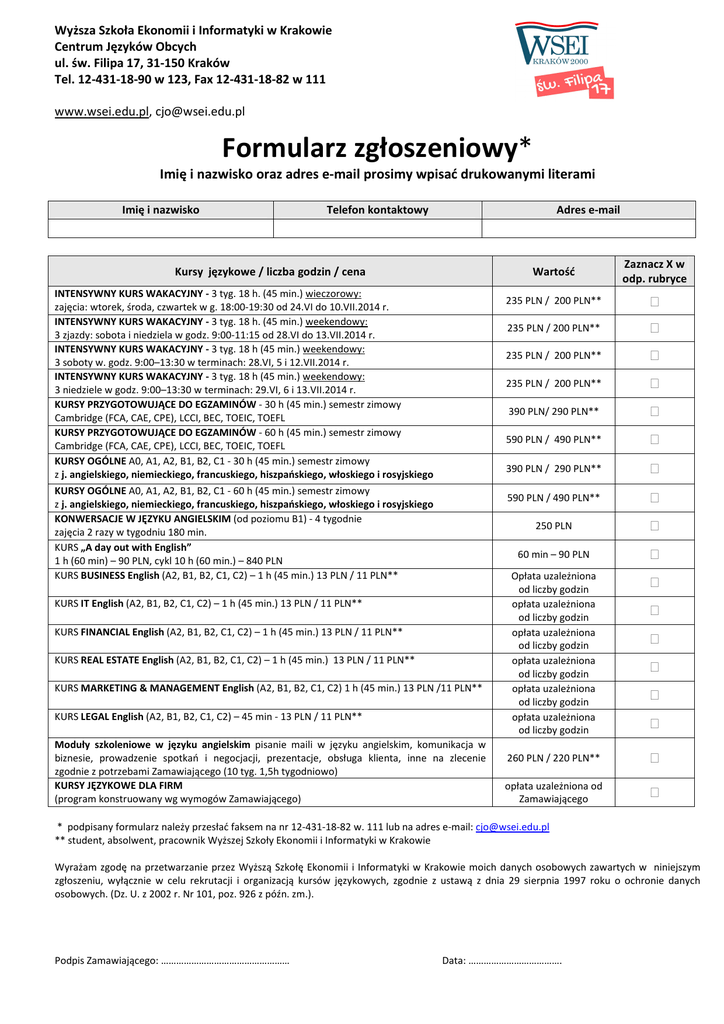 Wyższa Szkoła Ekonomii i Informatyki w Krakowie Centrum Języków Obcych ul. św. Filipa 17, 31-150 Kraków Tel. 12-431-18-90 w 123, Fax 12-431-18-82 w 111 www.wsei.edu.pl, [email protected] Formularz zgłoszeniowy* Imię i nazwisko oraz adres e-mail prosimy wpisać drukowanymi literami Imię i nazwisko Telefon kontaktowy Adres e-mail Kursy językowe / liczba godzin / cena INTENSYWNY KURS WAKACYJNY - 3 tyg. 18 h. (45 min.) wieczorowy: zajęcia: wtorek, środa, czwartek w g. 18:00-19:30 od 24.VI do 10.VII.2014 r. INTENSYWNY KURS WAKACYJNY - 3 tyg. 18 h. (45 min.) weekendowy: 3 zjazdy: sobota i niedziela w godz. 9:00-11:15 od 28.VI do 13.VII.2014 r. INTENSYWNY KURS WAKACYJNY - 3 tyg. 18 h (45 min.) weekendowy: 3 soboty w. godz. 9:00–13:30 w terminach: 28.VI, 5 i 12.VII.2014 r. INTENSYWNY KURS WAKACYJNY - 3 tyg. 18 h (45 min.) weekendowy: 3 niedziele w godz. 9:00–13:30 w terminach: 29.VI, 6 i 13.VII.2014 r. KURSY PRZYGOTOWUJĄCE DO EGZAMINÓW - 30 h (45 min.) semestr zimowy Cambridge (FCA, CAE, CPE), LCCI, BEC, TOEIC, TOEFL KURSY PRZYGOTOWUJĄCE DO EGZAMINÓW - 60 h (45 min.) semestr zimowy Cambridge (FCA, CAE, CPE), LCCI, BEC, TOEIC, TOEFL KURSY OGÓLNE A0, A1, A2, B1, B2, C1 - 30 h (45 min.) semestr zimowy z j. angielskiego, niemieckiego, francuskiego, hiszpańskiego, włoskiego i rosyjskiego KURSY OGÓLNE A0, A1, A2, B1, B2, C1 - 60 h (45 min.) semestr zimowy z j. angielskiego, niemieckiego, francuskiego, hiszpańskiego, włoskiego i rosyjskiego KONWERSACJE W JĘZYKU ANGIELSKIM (od poziomu B1) - 4 tygodnie zajęcia 2 razy w tygodniu 180 min. KURS „A day out with English” 1 h (60 min) – 90 PLN, cykl 10 h (60 min.) – 840 PLN KURS BUSINESS English (A2, B1, B2, C1, C2) – 1 h (45 min.) 13 PLN / 11 PLN** KURS IT English (A2, B1, B2, C1, C2) – 1 h (45 min.) 13 PLN / 11 PLN** KURS FINANCIAL English (A2, B1, B2, C1, C2) – 1 h (45 min.) 13 PLN / 11 PLN** KURS REAL ESTATE English (A2, B1, B2, C1, C2) – 1 h (45 min.) 13 PLN / 11 PLN** KURS MARKETING & MANAGEMENT English (A2, B1, B2, C1, C2) 1 h (45 min.) 13 PLN /11 PLN** KURS LEGAL English (A2, B1, B2, C1, C2) – 45 min - 13 PLN / 11 PLN** Moduły szkoleniowe w języku angielskim pisanie maili w języku angielskim, komunikacja w biznesie, prowadzenie spotkań i negocjacji, prezentacje, obsługa klienta, inne na zlecenie zgodnie z potrzebami Zamawiającego (10 tyg. 1,5h tygodniowo) KURSY JĘZYKOWE DLA FIRM (program konstruowany wg wymogów Zamawiającego) Wartość Zaznacz X w odp. rubryce 235 PLN / 200 PLN** 235 PLN / 200 PLN** 235 PLN / 200 PLN** 235 PLN / 200 PLN** 390 PLN/ 290 PLN** 590 PLN / 490 PLN** 390 PLN / 290 PLN** 590 PLN / 490 PLN** 250 PLN 60 min – 90 PLN Opłata uzależniona od liczby godzin opłata uzależniona od liczby godzin opłata uzależniona od liczby godzin opłata uzależniona od liczby godzin opłata uzależniona od liczby godzin opłata uzależniona od liczby godzin 260 PLN / 220 PLN** opłata uzależniona od Zamawiającego * podpisany formularz należy przesłać faksem na nr 12-431-18-82 w. 111 lub na adres e-mail: [email protected] ** student, absolwent, pracownik Wyższej Szkoły Ekonomii i Informatyki w Krakowie Wyrażam zgodę na przetwarzanie przez Wyższą Szkołę Ekonomii i Informatyki w Krakowie moich danych osobowych zawartych w niniejszym zgłoszeniu, wyłącznie w celu rekrutacji i organizacją kursów językowych, zgodnie z ustawą z dnia 29 sierpnia 1997 roku o ochronie danych osobowych. (Dz. U. z 2002 r. Nr 101, poz. 926 z późn. zm.). Podpis Zamawiającego: …………………………………………… Data: ……………………………….