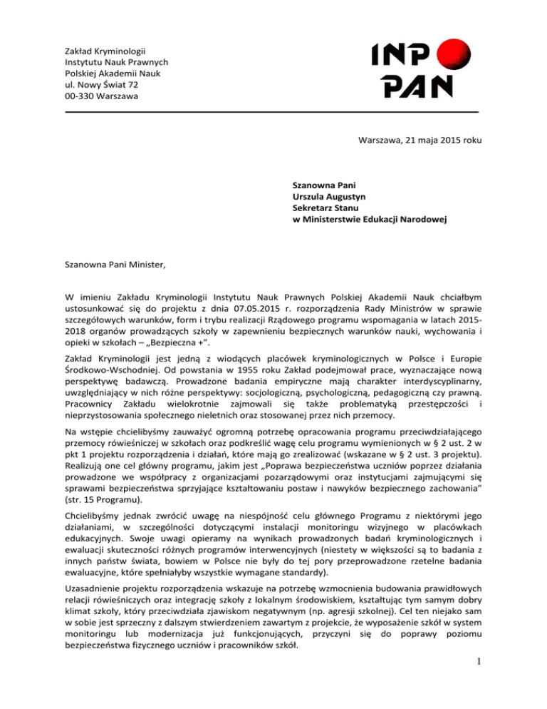 Zakład Kryminologii Instytutu Nauk Prawnych Polskiej Akademii Nauk ul. Nowy Świat 72 00-330 Warszawa Warszawa, 21 maja 2015 roku Szanowna Pani Urszula Augustyn Sekretarz Stanu w Ministerstwie Edukacji Narodowej Szanowna Pani Minister, W imieniu Zakładu Kryminologii Instytutu Nauk Prawnych Polskiej Akademii Nauk chciałbym ustosunkować się do projektu z dnia 07.05.2015 r. rozporządzenia Rady Ministrów w sprawie szczegółowych warunków, form i trybu realizacji Rządowego programu wspomagania w latach 20152018 organów prowadzących szkoły w zapewnieniu bezpiecznych warunków nauki, wychowania i opieki w szkołach – „Bezpieczna +”. Zakład Kryminologii jest jedną z wiodących placówek kryminologicznych w Polsce i Europie Środkowo-Wschodniej. Od powstania w 1955 roku Zakład podejmował prace, wyznaczające nową perspektywę badawczą. Prowadzone badania empiryczne mają charakter interdyscyplinarny, uwzględniający w nich różne perspektywy: socjologiczną, psychologiczną, pedagogiczną czy prawną. Pracownicy Zakładu wielokrotnie zajmowali się także problematyką przestępczości i nieprzystosowania społecznego nieletnich oraz stosowanej przez nich przemocy. Na wstępie chcielibyśmy zauważyć ogromną potrzebę opracowania programu przeciwdziałającego przemocy rówieśniczej w szkołach oraz podkreślić wagę celu programu wymienionych w § 2 ust. 2 w pkt 1 projektu rozporządzenia i działań, które mają go zrealizować (wskazane w § 2 ust. 3 projektu). Realizują one cel główny programu, jakim jest „Poprawa bezpieczeństwa uczniów poprzez działania prowadzone we współpracy z organizacjami pozarządowymi oraz instytucjami zajmującymi się sprawami bezpieczeństwa sprzyjające kształtowaniu postaw i nawyków bezpiecznego zachowania” (str. 15 Programu). Chcielibyśmy jednak zwrócić uwagę na niespójność celu głównego Programu z niektórymi jego działaniami, w szczególności dotyczącymi instalacji monitoringu wizyjnego w placówkach edukacyjnych. Swoje uwagi opieramy na wynikach prowadzonych badań kryminologicznych i ewaluacji skuteczności różnych programów interwencyjnych (niestety w większości są to badania z innych państw świata, bowiem w Polsce nie były do tej pory przeprowadzone rzetelne badania ewaluacyjne, które spełniałyby wszystkie wymagane standardy). Uzasadnienie projektu rozporządzenia wskazuje na potrzebę wzmocnienia budowania prawidłowych relacji rówieśniczych oraz integrację szkoły z lokalnym środowiskiem, kształtując tym samym dobry klimat szkoły, który przeciwdziała zjawiskom negatywnym (np. agresji szkolnej). Cel ten niejako sam w sobie jest sprzeczny z dalszym stwierdzeniem zawartym z projekcie, że wyposażenie szkół w system monitoringu lub modernizacja już funkcjonujących, przyczyni się do poprawy poziomu bezpieczeństwa fizycznego uczniów i pracowników szkół. 1 Monitoring wizyjny stanowi najbardziej popularną, dodatkowo najbardziej kosztowną formę interwencji, skuteczność której jednak nie została potwierdzona. Co więcej, badania kryminologiczne wskazują na niepożądane efekty wprowadzenia monitoringu wizyjnego w postaci zwiększenia ryzyka wiktymizacji uczniów. Oznacza to, że skutek wprowadzonych zmian jest przeciwny do zamierzonego i wprowadzenie monitoringu zamiast zwiększać bezpieczeństwo uczniów, zmniejsza je. Nieskuteczność takiego rodzaju interwencji można porównać z nieskutecznością programów typu instruktażowego (niezmieniających zachowań uczniów, z uwagi na brak efektów w sferze behawioralno-poznawczej), interwencji terapeutycznych czy prowadzenia prac społecznie użytecznych. Na podstawie badań świadczących o nieskuteczności wymienionych programów nie możemy twierdzić, iż stosowanie ich winno być zakazane, albowiem może nieść ono za sobą inne pozytywne efekty. Efekty te jednak (o ile w ogóle wystąpią) będą odmienne od pożądanych i zakładanych w projekcie rozporządzenia, tj. budowy pozytywnego klimatu szkoły oraz redukcji zachowań aspołecznych tak u dzieci, jak i młodzieży. Wskazać należy, iż istnieją inne – tańsze i bardziej efektywne – sposoby osiągnięcia zamierzonych celów. Za skuteczne w badaniach kryminologicznych zostały uznane przede wszystkim programy dostosowane do konkretnej społeczności szkolnej, wpływające zarówno na uczniów, jak i na nauczycieli w sposób podnoszący kompetencje obu tych kluczowych w życiu szkoły grup. Ważne bowiem, by uczniowie poza umiejętnościami edukacyjnymi, kształtowali także umiejętności społeczne (rozwiązywanie osobistych problemów czy konfliktów z innymi osobami bez użycia przemocy). Zaangażowanie dzieci i młodzieży w procesy decyzyjne dotyczące organizacji szkoły podnosi skuteczność programów zmierzających do zmniejszenia poziomu przestępczości i agresji. Uczniowie uczestnicząc w kształtowaniu regulaminu czy kodeksu zachowań chętniej przestrzegają reguł, o powstaniu których współdecydowali, a ponadto są świadomi konsekwencji zachowań wykraczających poza ustalone normy. Nauka szacunku wobec innych, zdobywanie umiejętności komunikacyjnych, rozwiązywanie problemów bez używania przemocy, wspólne tworzenie zbioru reguł obowiązujących wszystkich, przyczyniają się do stworzenia środowiska przyjaznego uczniom i nauczycielom, gwarantując tym samym dobre samopoczucie oraz redukując obawy przed rówieśnikami do minimum. Jako skuteczną formę działań profilaktycznych (dążących do realizacji celów zawartych w Programie) wskazuje się korzystanie z różnych form sprawiedliwości naprawczej. Nie możemy stwierdzić, iż jest to panaceum na wszelkie pojawiające się w rzeczywistości szkolnej problemy. Niemniej jednak dowiedziono, że właściwe stosowanie tych instytucji przyczynia się do poprawy atmosfery i klimatu panującego w szkole, jak również wspomaga proces nauki. Taka forma interwencji i prewencj