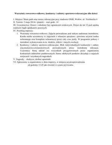 Warsztaty rowerowo-rolkowe, konkursy i zabawy sportowo-rekreacyjne dla dzieci I. Miejsce: Skate park oraz tereny rekreacyjne przy stadionie OSiR, Wołów, ul. Trzebnicka 6 II. Termin: 2 maja 2014r. (piątek) – start godz. 14 III. Uczestnictwo: Dzieci i młodzież bez ograniczeń wiekowych. Dzieci do lat 12 pod opieką rodziców bądź opiekunów prawnych. IV. Przebieg imprezy: 1. Warsztaty rowerowo-rolkowe. Zajęcia prowadzone pod stałym nadzorem instruktora. Każda osoba uczestniczy w zajęciach z własnym sprzętem i powinna używać kasku ochronnego oraz kompletu ochraniaczy przez cały czas jazdy. W programie pokazy i instruktaż wykonywania m.in. skoków, trików i innych ewolucji. 2. Konkursy i zabawy sportowo-rekreacyjne. Blok indywidualnych konkursów i zabaw zręcznościowo-zwinnościowych prowadzonych przez instruktora rekreacji. Uczestnicy biorą udział we wszystkich przygotowanych przez organizatora konkursach oddzielnie punktowanych. Suma zdobytych punktów decyduje o zajętych miejscach i uzyskanych nagrodach. V. Nagrody – słodycze, drobne upominki VI. Zgłoszenia: u organizatora w dniu imprezy, w miejscu jej przeprowadzenia od godziny 13.45 jak również w czasie jej trwania.