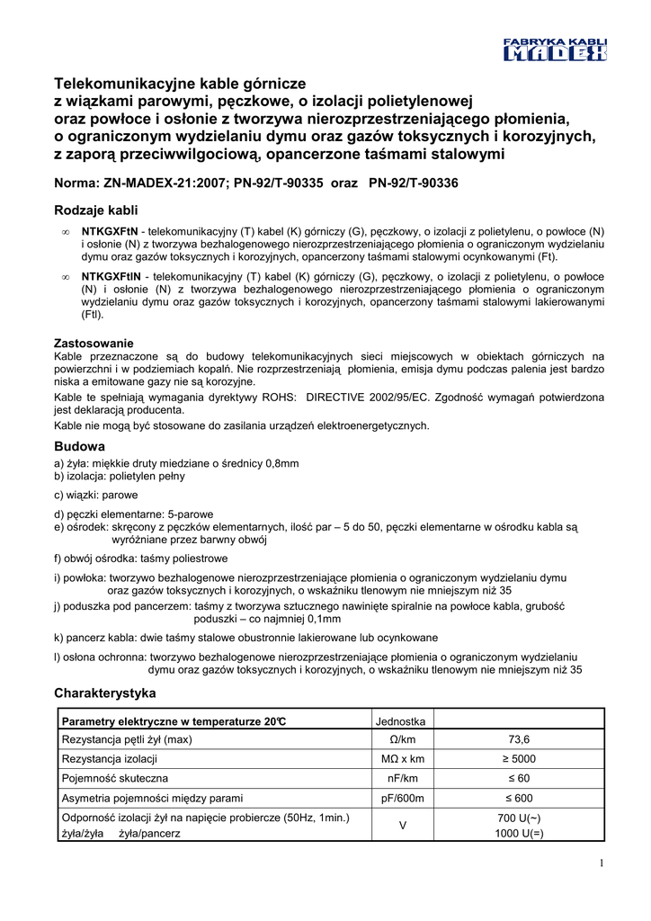 Telekomunikacyjne kable górnicze z wiązkami parowymi, pęczkowe, o izolacji polietylenowej oraz powłoce i osłonie z tworzywa nierozprzestrzeniającego płomienia, o ograniczonym wydzielaniu dymu oraz gazów toksycznych i korozyjnych, z zaporą przeciwwilgociową, opancerzone taśmami stalowymi Norma: ZN-MADEX-21:2007; PN-92/T-90335 oraz PN-92/T-90336 Rodzaje kabli • NTKGXFtN - telekomunikacyjny (T) kabel (K) górniczy (G), pęczkowy, o izolacji z polietylenu, o powłoce (N) i osłonie (N) z tworzywa bezhalogenowego nierozprzestrzeniającego płomienia o ograniczonym wydzielaniu dymu oraz gazów toksycznych i korozyjnych, opancerzony taśmami stalowymi ocynkowanymi (Ft). • NTKGXFtlN - telekomunikacyjny (T) kabel (K) górniczy (G), pęczkowy, o izolacji z polietylenu, o powłoce (N) i osłonie (N) z tworzywa bezhalogenowego nierozprzestrzeniającego płomienia o ograniczonym wydzielaniu dymu oraz gazów toksycznych i korozyjnych, opancerzony taśmami stalowymi lakierowanymi (Ftl). Zastosowanie Kable przeznaczone są do budowy telekomunikacyjnych sieci miejscowych w obiektach górniczych na powierzchni i w podziemiach kopalń. Nie rozprzestrzeniają płomienia, emisja dymu podczas palenia jest bardzo niska a emitowane gazy nie są korozyjne. Kable te spełniają wymagania dyrektywy ROHS: DIRECTIVE 2002/95/EC. Zgodność wymagań potwierdzona jest deklaracją producenta. Kable nie mogą być stosowane do zasilania urządzeń elektroenergetycznych. Budowa a) Ŝyła: miękkie druty miedziane o średnicy 0,8mm b) izolacja: polietylen pełny c) wiązki: parowe d) pęczki elementarne: 5-parowe e) ośrodek: skręcony z pęczków elementarnych, ilość par – 5 do 50, pęczki elementarne w ośrodku kabla są wyróŜniane przez barwny obwój f) obwój ośrodka: taśmy poliestrowe i) powłoka: tworzywo bezhalogenowe nierozprzestrzeniające płomienia o ograniczonym wydzielaniu dymu oraz gazów toksycznych i korozyjnych, o wskaźniku tlenowym nie mniejszym niŜ 35 j) poduszka pod pancerzem: taśmy z tworzywa sztucznego nawinięte spiralnie na powłoce kabla, grubość poduszki – co najmniej 0,1mm k) pancerz kabla: dwie taśmy stalowe obustronnie lakierowane lub ocynkowane l) osłona ochronna: tworzywo bezhalogenowe nierozprzestrzeniające płomienia o ograniczonym wydzielaniu dymu oraz gazów toksycznych i korozyjnych, o wskaźniku tlenowym nie mniejszym niŜ 35 Charakterystyka Parametry elektryczne w temperaturze 20°C Rezystancja pętli Ŝył (max) Rezystancja izolacji Pojemność skuteczna Asymetria pojemności między parami Odporność izolacji Ŝył na napięcie probiercze (50Hz, 1min.) Ŝyła/Ŝyła Ŝyła/pancerz Jednostka Ω/km 73,6 MΩ x km ≥ 5000 nF/km ≤ 60 pF/600m ≤ 600 V 700 U(~) 1000 U(=) 1 Pozostałe dane Bezpieczny zakres temperatur: - podczas układania - podczas pracy kabla Minimalny promień zginania -10°C do +50°C - 40°C do +70°C 10 x średnica zewnętrzna kabla Odporność kabla na rozprzestrzenianie się płomienia próba palności wg PN-EN 50266-2-2;IEC-60332-3-22 Gęstość dymów wydzielanych podczas spalania materiałów pobranych z kabla pomiar wg PN-EN 50268-2; IEC 61034-2 Korozyjności gazów powstałych podczas spalania materiałów pobranych z kabla pomiar wg PN-EN 50267-2-3; IEC 60754-2 Wymiary i masa 1km kabli Typowymiar Orientacyjna grubość izolacji Minimalna grubość powłoki Minimalna grubość osłony Maksymalna średnica zewnętrzna Liczba Cu Masa [mm] 0,35 0,35 0,35 0,35 0,35 [mm] 1,40 1,40 1,40 1,40 1,40 [mm] 1,10 1,20 1,20 1,20 1,20 [mm] 17,5 20,9 23,3 27,2 34,3 [kg/km] 46 91 137 228 456 [kg/km] 377 533 658 883 1373 5x2x0,8 10x2x0,8 15x2x0,8 25x2x0,8 50x2x0,8 Pakowanie Bębny drewniane zwrotne. Długość odcinków fabrykacyjnych – 600m, na Ŝyczenie klienta dostarczane są odcinki o innej długości. Informacje dodatkowe Budowa ośrodka Liczba par w kablu Układ pęczków w ośrodku 5 10 1x (5x2) 2 x (5x2) lub (2x2+8x2) 15 3 x (5x2) 25 5 x (5x2) 50 10x(5x2) Kolory Ŝył w wiązkach parowych Rodzaj pęczka Pęczek 5x2 nieparzysty Pęczek 5x2 parzysty Numer wiązki w pęczku śyła „a” śyła „b” 1 2 3 4 5 1 2 3 4 5 biała biała biała biała biała czerwona czerwona czerwona czerwona czerwona niebieska pomarańczowa zielona brązowa szara niebieska pomarańczowa zielona brązowa szara 2 Oznaczenie pęczków w ośrodku PołoŜenie Rdzeń Warstwa Rodzaj pęczka pęczek licznikowy pęczek kierunkowy pęczek nieparzysty pęczek parzysty pęczek licznikowy pęczek kierunkowy pęczek nieparzysty pęczek parzysty Barwa obrzutu pęczka czerwona niebieska Ŝółta brązowa czerwona niebieska biała zielona 3
