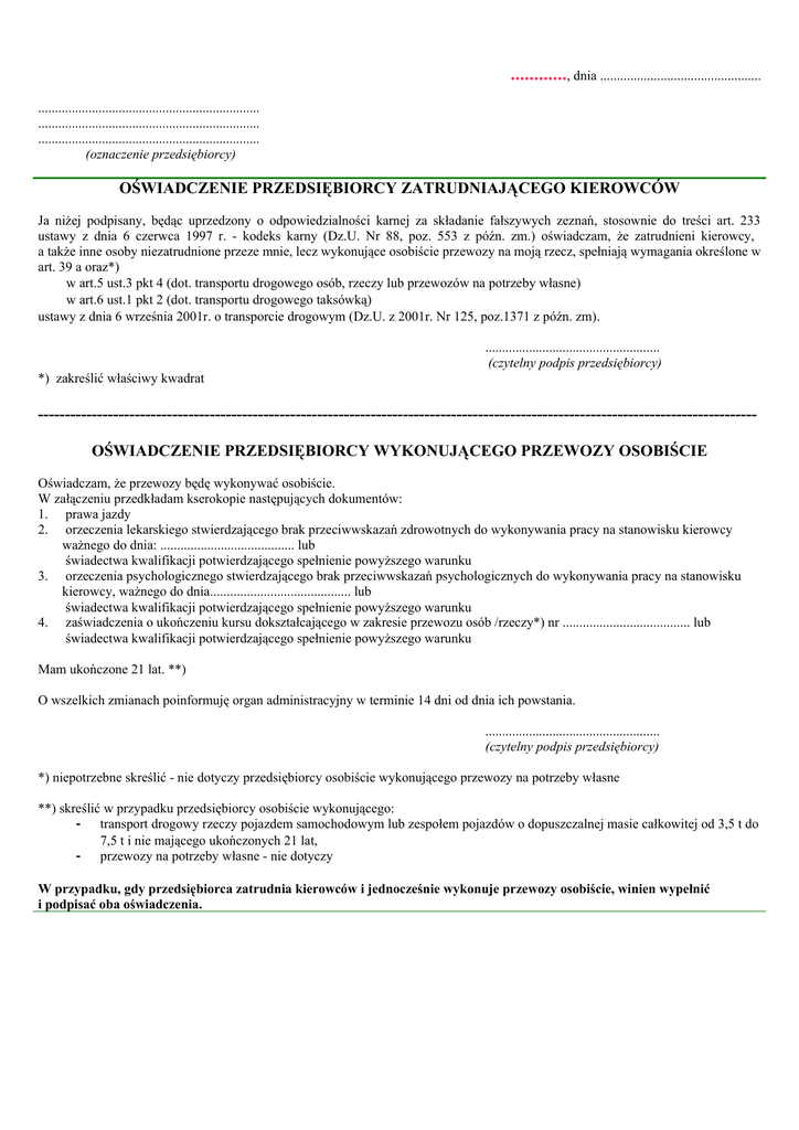 ............, dnia ................................................ .................................................................. .................................................................. .................................................................. (oznaczenie przedsiębiorcy) OŚWIADCZENIE PRZEDSIĘBIORCY ZATRUDNIAJĄCEGO KIEROWCÓW Ja niżej podpisany, będąc uprzedzony o odpowiedzialności karnej za składanie fałszywych zeznań, stosownie do treści art. 233 ustawy z dnia 6 czerwca 1997 r. - kodeks karny (Dz.U. Nr 88, poz. 553 z późn. zm.) oświadczam, że zatrudnieni kierowcy, a także inne osoby niezatrudnione przeze mnie, lecz wykonujące osobiście przewozy na moją rzecz, spełniają wymagania określone w art. 39 a oraz*) w art.5 ust.3 pkt 4 (dot. transportu drogowego osób, rzeczy lub przewozów na potrzeby własne) w art.6 ust.1 pkt 2 (dot. transportu drogowego taksówką) ustawy z dnia 6 września 2001r. o transporcie drogowym (Dz.U. z 2001r. Nr 125, poz.1371 z późn. zm). .................................................... (czytelny podpis przedsiębiorcy) *) zakreślić właściwy kwadrat -------------------------------------------------------------------------------------------------------------------------------------OŚWIADCZENIE PRZEDSIĘBIORCY WYKONUJĄCEGO PRZEWOZY OSOBIŚCIE Oświadczam, że przewozy będę wykonywać osobiście. W załączeniu przedkładam kserokopie następujących dokumentów: 1. prawa jazdy 2. orzeczenia lekarskiego stwierdzającego brak przeciwwskazań zdrowotnych do wykonywania pracy na stanowisku kierowcy ważnego do dnia: ........................................ lub świadectwa kwalifikacji potwierdzającego spełnienie powyższego warunku 3. orzeczenia psychologicznego stwierdzającego brak przeciwwskazań psychologicznych do wykonywania pracy na stanowisku kierowcy, ważnego do dnia.......................................... lub świadectwa kwalifikacji potwierdzającego spełnienie powyższego warunku 4. zaświadczenia o ukończeniu kursu dokształcającego w zakresie przewozu osób /rzeczy*) nr ...................................... lub świadectwa kwalifikacji potwierdzającego spełnienie powyższego warunku Mam ukończone 21 lat. **) O wszelkich zmianach poinformuję organ administracyjny w terminie 14 dni od dnia ich powstania. .................................................... (czytelny podpis przedsiębiorcy) *) niepotrzebne skreślić - nie dotyczy przedsiębiorcy osobiście wykonującego przewozy na potrzeby własne **) skreślić w przypadku przedsiębiorcy osobiście wykonującego: - transport drogowy rzeczy pojazdem samochodowym lub zespołem pojazdów o dopuszczalnej masie całkowitej od 3,5 t do 7,5 t i nie mającego ukończonych 21 lat, - przewozy na potrzeby własne - nie dotyczy W przypadku, gdy przedsiębiorca zatrudnia kierowców i jednocześnie wykonuje przewozy osobiście, winien wypełnić i podpisać oba oświadczenia.