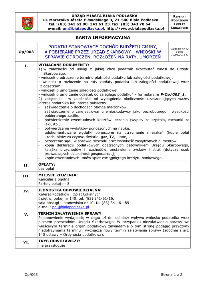 URZĄD MIASTA BIAŁA PODLASKA ul. Marszałka Józefa Piłsudskiego 3, 21-500 Biała Podlaska tel.: (83) 341 61 00, 341 61 23, fax: (83) 343 70 64 e-mail: [email protected], http://www.bialapodlaska.pl REFERAT PODATKÓW I OPŁAT LOKALNYCH KARTA INFORMACYJNA Op/003 PODATKI STANOWIĄCE DOCHÓD BUDŻETU GMINY, A POBIERANE PRZEZ URZĄD SKARBOWY - WNIOSKI W SPRAWIE ODROCZEŃ, ROZŁOŻEŃ NA RATY, UMORZEŃ Wydanie nr 12 z dnia 12.01.2016 r. I. WYMAGANE DOKUMENTY: 1) w zależności od usługi z jakiej chce podatnik skorzystać wnosi do Urzędu Skarbowego: - wniosek o odroczenie terminu płatności podatku lub zaległości podatkowej, - wniosek o rozłożenie na raty zapłaty podatku lub zaległości podatkowej wraz z odsetkami, - wniosek o umorzenie zaległości podatkowej, - wniosek o umorzenie odsetek od zaległego podatku" – formularz nr F-Op/003_1, 2) załączniki - w zależności od wystąpienia okoliczności uzasadniających ważny interes podatnika lub interes publiczny: - zaświadczenie o dochodach obojga małżonków, - zaświadczenie o zarejestrowaniu wnioskodawcy jako bezrobotnego i wysokości pobieranego zasiłku, - potwierdzenie ewentualnych kosztów leczenia (wypisy ze szpitala, rachunki za leki, itp.), - potwierdzenie wydatków ponoszonych na naukę, - udokumentowane wydatki ponoszone na utrzymanie mieszkań (kopie opłat i rachunków za czynsz, światło, gaz, TV, i inne, - orzeczenie sądu w sprawie rozwodu oraz wysokość zasądzonych alimentów, - kopia deklaracji podatkowych opatrzonych datownikiem Urzędu Skarbowego, książka przychodów i rozchodów, zestawienie zysków i strat (dotyczy osób prowadzących działalność gospodarczą), - kopie ewentualnych umów spłat zaciągniętego kredytu bankowego. II. OPŁATY: bez opłat III. MIEJSCE ZŁOŻENIA: Kancelaria ogólna Parter, pokój nr 8 IV. JEDNOSTKA ODPOWIEDZIALNA: Referat Podatków i Opłat Lokalnych I piętro, pokój nr 140, tel. (83) 341-61-16, sala obsługi – stanowisko nr 10, tel.(83) 341-61-89 e-mail: [email protected] V. TERMIN ZAŁATWIENIA SPRAWY: Postanowienie wydaje się w ciągu 14 dni od daty wpływu wniosku podatnika wraz pismem przewodnim Urzędu Skarbowego. W przypadku niezałatwienia sprawy we właściwym terminie organ podatkowy zawiadamia o tym stronę podając przyczyny niedotrzymania terminu i wyznacza nowy termin załatwienia sprawy (zgodnie z art. 140 ustawy – Ordynacja podatkowa). VI. TRYB ODWOŁAWCZY: nie przysługuje Op/003 Strona 1 z 2 VII. PODSTAWA PRAWNA: 1) ustawa z dnia 29 sierpnia 1997 r. Ordynacja podatkowa (Dz. U. z 2015 r. poz.613, z późn. zm.), 2) ustawa z dnia 5 sierpnia 2015 r. o zmianie ustawy o dochodach jednostek samorządu terytorialnego (Dz. U. z 2015 poz. 1293), 3) ustawa z dnia 29 sierpnia 1997 r. o ochronie danych osobowych (Dz. U. z 2002 r. Nr 101, poz.926 z późn. zm.). VIII. UWAGI: W przypadku braku kompletu wymaganych dokumentów wnioskodawca zostanie wezwany do ich uzupełnienia. Op/003 Strona 2 z 2