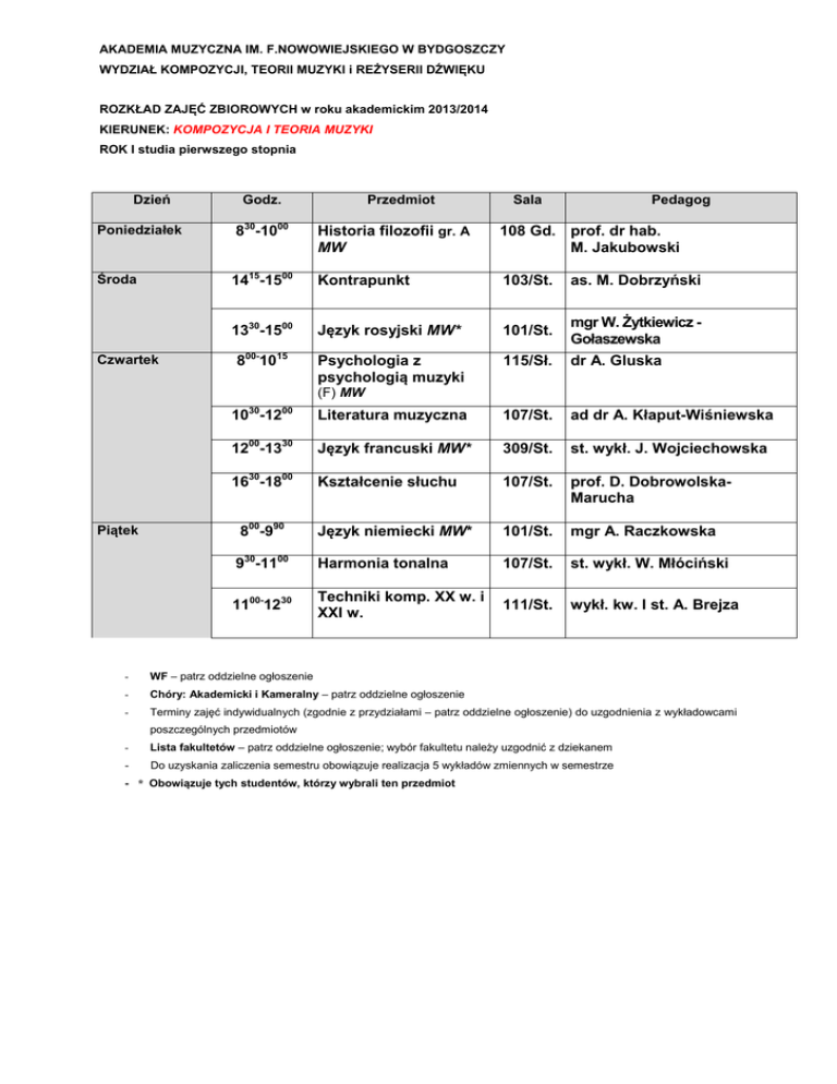 AKADEMIA MUZYCZNA IM. F.NOWOWIEJSKIEGO W BYDGOSZCZY WYDZIAŁ KOMPOZYCJI, TEORII MUZYKI i REŻYSERII DŹWIĘKU ROZKŁAD ZAJĘĆ ZBIOROWYCH w roku akademickim 2013/2014 KIERUNEK: KOMPOZYCJA I TEORIA MUZYKI ROK I studia pierwszego stopnia Dzień Poniedziałek Środa Czwartek Godz. Przedmiot Sala Pedagog 830-1000 Historia filozofii gr. A MW 108 Gd. prof. dr hab. M. Jakubowski 1415-1500 Kontrapunkt 103/St. as. M. Dobrzyński 1330-1500 Język rosyjski MW* 101/St. mgr W. Żytkiewicz Gołaszewska 800-1015 Psychologia z psychologią muzyki 115/Sł. dr A. Gluska Literatura muzyczna 107/St. ad dr A. Kłaput-Wiśniewska 1200-1330 Język francuski MW* 309/St. st. wykł. J. Wojciechowska 1630-1800 Kształcenie słuchu 107/St. prof. D. DobrowolskaMarucha 800-990 Język niemiecki MW* 101/St. mgr A. Raczkowska 930-1100 Harmonia tonalna 107/St. st. wykł. W. Młóciński 1100-1230 Techniki komp. XX w. i XXI w. 111/St. wykł. kw. I st. A. Brejza (F) MW 30 10 -12 Piątek 00 - WF – patrz oddzielne ogłoszenie - Chóry: Akademicki i Kameralny – patrz oddzielne ogłoszenie - Terminy zajęć indywidualnych (zgodnie z przydziałami – patrz oddzielne ogłoszenie) do uzgodnienia z wykładowcami poszczególnych przedmiotów - Lista fakultetów – patrz oddzielne ogłoszenie; wybór fakultetu należy uzgodnić z dziekanem - Do uzyskania zaliczenia semestru obowiązuje realizacja 5 wykładów zmiennych w semestrze - * Obowiązuje tych studentów, którzy wybrali ten przedmiot AKADEMIA MUZYCZNA IM. F.NOWOWIEJSKIEGO W BYDGOSZCZY WYDZIAŁ KOMPOZYCJI, TEORII MUZYKI i REŻYSERII DŹWIĘKU ROZKŁAD ZAJĘĆ ZBIOROWYCH w roku akademickim 2013/2014 KIERUNEK: KOMPOZYCJA I TEORIA MUZYKI ROK II studia pierwszego stopnia Data Poniedziałek Wtorek Środa Godz. Przedmiot Sala Pedagog 1045-1130 Kontrapunkt 103/St. ad. dr M. Kopczyński 900-1030 107/St. kw. II st. dr A. Nowak, prof. ndzw. Analiza form muzycznych 1200-1415 Metodyka kształcenia słuchu, zasad muzyki i harmonii 1200-1330 Język rosyjski MW* 111/St. ad. dr E. Szczurko 1330-1500 Literatura muzyczna 104/St. ad dr A. Kłaput-Wiśniewska 1600 – 1730 Wprowadzenie do pracy naukowej 111/St. dr V. Przech, prof. ndzw. 101/St. mgr W. Żytkiewicz - Gołaszewska (sem. letni) Czwartek Piątek 800-930 Historia muzyki powszechnej 104/St. as. M. Simela 900-1030 Język francuski MW* 309/St. st. wykł J. Wojciechowska 1015-1230 Pedagogika z pedagogiką muzyki (F) MW 115/Sł. dr A. Gluska 1300-1430 Techniki kompozytorskie XX i XXI wieku (sem. zim. 2 g.) 1300-1345 (sem. letni 1 g.) 101/Sł. prof. zw. Z. Bargielski 1500-1630 Kształcenie słuchu 107/St. prof. D. Dobrowolska-Marucha 1400-1530 Język niemiecki MW* 101/St. mgr A. Raczkowska - Chóry: Akademicki i Kameralny – patrz oddzielne ogłoszenie - Terminy zajęć indywidualnych (zgodnie z przydziałami – patrz oddzielne ogłoszenie) do uzgodnienia z wykładowcami poszczególnych przedmiotów - Lista fakultetów – patrz oddzielne ogłoszenie; wybór fakultetu należy uzgodnić z dziekanem Do uzyskania zaliczenia semestru obowiązuje realizacja 5 wykładów zmiennych w semestrze * Obowiązuje tych studentów, którzy wybrali ten przedmiot AKADEMIA MUZYCZNA IM. F.NOWOWIEJSKIEGO W BYDGOSZCZY WYDZIAŁ KOMPOZYCJI, TEORII MUZYKI i REŻYSERII DŹWIĘKU ROZKŁAD ZAJĘĆ ZBIOROWYCH w roku akademickim 2013/2014 KIERUNEK: KOMPOZYCJA I TEORIA MUZYKI ROK III studia pierwszego stopnia Data Godz. Przedmiot Sala Pedagog Poniedziałek 1130-1300 Kontrapunkt - fuga 103/St. ad. dr M. Kopczyński Wtorek 1030-1200 Analiza form muzycznych 107/St. kw. II st. dr A. Nowak, prof. ndzw. 1200-1415 Metodyka kształcenia słuchu, zasad muzyki i harmonii Muzyka polska XX i XXI wieku (sem. zimowy) 111/St. ad. dr E. Szczurko 111/St. ad. dr E. Szczurko Muzyka polska XX i XXI wieku (sem. letni) Metodyka nauczania form muzycznych (F) 111/St. dr V. Przech, prof. ndzw. 1415-1545 1615-1745 1000-1130 Środa 21/Sł. kw. II st. dr A. Nowak, prof. ndzw. (sem. letni) Czwartek 1030-1200 Język rosyjski MW* 101/St. mgr W. Żytkiewicz Gołaszewska 930-1100 Historia muzyki powszechnej 104/St. as. M. Simela 1130-1300 Współczesne Techniki Kompozytorskie 101/Sł. prof. zw. Z. Bargielski 1215-1300 Piątek (sem. zimowy 2 g.) (sem. letni 1 g.) 930-1100 Język niemiecki MW* 101/St. mgr A. Raczkowska 1100-1230 Język niemiecki MW* 101/St. mgr A. Raczkowska - Chóry: Akademicki i Kameralny – patrz oddzielne ogłoszenie - Terminy zajęć indywidualnych (zgodnie z przydziałami – patrz oddzielne ogłoszenie) do uzgodnienia z wykładowcami poszczególnych przedmiotów - Lista fakultetów – patrz oddzielne ogłoszenie; wybór fakultetu należy uzgodnić z dziekanem - Do uzyskania zaliczenia semestru obowiązuje realizacja 5 wykładów zmiennych w semestrze - *Obowiązuje tych studentów, którzy wybrali ten przedmiot Język angielski oddzielne ogłoszenie AKADEMIA MUZYCZNA IM. F.NOWOWIEJSKIEGO W BYDGOSZCZY WYDZIAŁ KOMPOZYCJI, TEORII MUZYKI i REŻYSERII DŹWIĘKU ROZKŁAD ZAJĘĆ ZBIOROWYCH w roku akademickim 2013/2014 KIERUNEK: KOMPOZYCJA I TEORIA MUZYKI SPECJALNOŚĆ: kompozycja ROK I studia drugiego stopnia Data Godz. Przedmiot Sala Pedagog Poniedziałek Wtorek Środa 1330-1415 Muzyka jazzowa i rozrywkowa Czwartek 1245-1330 Akustyka muzyczna 014/Sł. mgr T. Terpiński 900-1030 Analiza dzieła muzycznego 21/Sł. kw. II st. dr A. Nowak, prof. ndzw. 1230-1400 Historia kultury 115/Sł. prof. dr hab. M. Jakubowski Piątek 4/Warm. - Praktyki pedagogiczne – patrz ogłoszenia na tablicy Studium Pedagogicznego - Chór Akademicki i Kameralny – patrz osobne ogłoszenie - Do uzyskania zaliczenia semestru obowiązuje realizacja 5 wykładów zmiennych w semestrze Język angielski oddzielne ogłoszenie mgr Z. Pająk AKADEMIA MUZYCZNA IM. F.NOWOWIEJSKIEGO W BYDGOSZCZY WYDZIAŁ KOMPOZYCJI, TEORII MUZYKI i REŻYSERII DŹWIĘKU ROZKŁAD ZAJĘĆ ZBIOROWYCH w roku akademickim 2013/2014 KIERUNEK: KOMPOZYCJA I TEORIA MUZYKI SPECJALNOŚĆ: teoria muzyki ROK I studia drugiego stopnia Data Godz