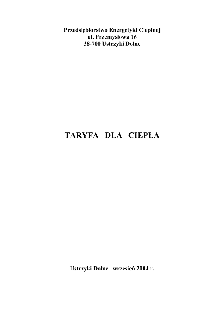 Przedsiębiorstwo Energetyki Cieplnej ul. Przemysłowa 16 38-700 Ustrzyki Dolne TARYFA DLA CIEPŁA Ustrzyki Dolne wrzesień 2004 r. 2 SPIS TREŚCI: Część I - Objaśnienia pojęć użytych w taryfie Część II - Zakres działalności gospodarczej związanej z zaopatrzeniem w ciepło. 1. Podstawa prowadzenia działalności gospodarczej, 2. Zakres prowadzonej działalności. Część III - Podział odbiorców na grupy 1. Charakterystyka potrzeb cieplnych odbiorców, 2. Podział odbiorców na grupy. Część IV - Rodzaje oraz wysokość cen i stawek opłat, 1. Ceny za zamówioną moc cieplną, 2. Ceny ciepła, 3. Ceny nośnika ciepła, 4. Stawka opłaty abonamentowej, 5. Stawki opłat za usługi przesyłowe, 6. Stawki opłat za przyłączenie do sieci. Część V - Zasady ustalania cen i stawek opłat. Część VI - Warunki stosowania cen i stawek opłat. Standardy jakościowe obsługi odbiorców, Część VII - Zasady wprowadzania zmian cen i stawek opłat. 3 CZĘŚĆ I OBJAŚNIENIA POJĘĆ UŻYTYCH W TARYFIE. 1) ustawa - Ustawa z dnia 10.04.1997r. - Prawo energetyczne (Dz. U. z 2003 r. Nr 153 poz. 1504 z późniejszymi zmianami), 2) rozporządzenie przyłączeniowe - rozporządzenie Ministra Gospodarki i Pracy z dnia 30 czerwiec 2004 r. w sprawie szczegółowych warunków przyłączania podmiotów do sieci ciepłowniczych, oraz eksploatacji tych sieci (Dz. U. z 2004 r. Nr 167, poz. 1751), 3) rozporządzenie taryfowe - rozporządzenie Ministra Gospodarki z dnia 12 października 2000 r. w sprawie szczegółowych zasad kształtowania i kalkulacji taryf oraz zasad rozliczeń w obrocie ciepłem, (Dz. U. z 2000 r. Nr 96 poz. 1053), 4) przedsiębiorstwo energetyczne - Przedsiębiorstwo Energetyki Cieplnej w Ustrzykach Dolnych, (w skrócie PEC), prowadzące działalność gospodarczą w zakresie wytwarzania oraz przesyłania i dystrybucji ciepła, 5) odbiorca - każdy kto otrzymuje lub pobiera ciepło na podstawie umowy z przedsiębiorstwem energetycznym, 6) sieć ciepłownicza - połączone ze sobą urządzenia lub instalacje, służące do przesyłania i dystrybucji ciepła ze źródeł ciepła do obiektów, należące do przedsiębiorstwa energetycznego, 7) węzeł cieplny - połączone ze sobą urządzenia lub instalacje, służące do zmiany rodzaju lub parametrów nośnika ciepła dostarczanego z przyłącza oraz regulacji ilości ciepła dostarczanego do instalacji odbiorczych, 8) grupowy węzeł cieplny - węzeł cieplny obsługujący więcej niż jeden obiekt. 9) instalacja odbiorcza - połączone ze sobą urządzenia lub instalacje, służące do transportowania ciepła lub ciepłej wody z węzłów cieplnych do odbiorników ciepła lub punktów poboru ciepłej wody w obiekcie, 10) układ pomiarowo - rozliczeniowy - dopuszczony do stosowania zespół urządzeń, służących do pomiaru ilości i parametrów nośnika ciepła, których wskazania stanowią podstawę do obliczenia należności z tytułu dostarczania ciepła, 11) zamówiona moc cieplna - ustalona przez odbiorcę największa moc cieplna, jaka w ciągu roku występuje w danym obiekcie dla warunków obliczeniowych, która powinna uwzględniać moc cieplną niezbędną dla: a) pokrycia strat ciepła w obiekcie, zapewniającą utrzymanie normatywnej temperatury i wymiany powietrza w pomieszczeniach znajdujących się w tym obiekcie, b) zapewnienia utrzymania normatywnej temperatury ciepłej wody w punktach czerpalnych znajdujących się w tym obiekcie, c) zapewnienia prawidłowej pracy innych urządzeń lub instalacji, zgodnie z określonymi dla nich warunkami technicznymi i wymaganiami technologicznymi, 12) taryfa - zbiór cen i stawek opłat oraz warunków ich stosowania, opracowany przez przedsiębiorstwo energetyczne i wprowadzony jako obowiązujący dla określonych w nim odbiorców w trybie określonym ustawą, 13) źródło ciepła – połączone ze sobą urządzenia i instalacje, służące do wytwarzania ciepła, 14) nielegalne pobieranie ciepła – pobieranie ciepła bez zawarcia umowy z przedsiębiorstwem energetycznym lub niezgodnie z umową. 4 CZĘŚĆ II ZAKRES DZIAŁALNOŚCI GOSPODARCZEJ ZWIĄZANEJ Z ZAOPATRZENIEM W CIEPŁO. 1. Podstawa prowadzenia działalności gospodarczej. Przedsiębiorstwo energetyczne prowadzi działalność gospodarczą w zakresie zaopatrzenia w ciepło w oparciu o posiadane koncesje wraz z późniejszymi zmianami. a) na wytwarzanie ciepła; • WCC/623/404/U/2/98/KJ z dnia 17 listopada 1998 r. z późniejszymi zmianami, b) na przesyłanie i dystrybucję ciepła; • PCC/651/404/U/2/98/KJ z dnia 17 listopada 1998 r. z późniejszymi zmianami. 2. Zakres prowadzonej działalności. Przedsiębiorstwo energetyczne prowadzi działalność gospodarczą związaną z zaopatrzeniem w ciepło w następującym zakresie: a) wytwarzanie ciepła w kotłowni miejskiej zlokalizowanej na terenie miasta Ustrzyki Dolne ul. Przemysłowa 16. b) przesyłanie i dystrybucja ciepła w postaci gorącej wody za pośrednictwem jednej sieci ciepłowniczej należącej do przedsiębiorstwa, zlokalizowanej na terenie miasta Ustrzyki Dolne, współpracującej z kotłownią miejską zlokalizowaną przy ul. Przemysłowej 16 w Ustrzykach Dolnych. CZĘŚĆ III PODZIAŁ ODBIORCÓW NA GRUPY TARYFOWE. 1. Charakterystyka potrzeb cieplnych odbiorców. Przedsiębiorstwo prowadząc działalność w zakresie zaopatrzenia w ciepło pokrywa następujące potrzeby odbiorców: a) centralnego ogrzewania b) podgrzewania wody wodociągowej c) wentylacji i klimatyzacji 2. Podział odbiorców na grupy taryfowe, dokonany został zgodnie z § 10 rozporządzenia taryfowego. Symbol grupy taryfowej „A” „B” Opis (charakterystyka) grupy taryfowej Odbiorcy, do których ciepło dostarczane jest ze źródła ciepła i sieci ciepłowniczej będącej własnością przedsiębiorstwa energetycznego, nośnikiem ciepła jest gorąca woda o parametrach 135/70°C. Odbiorcy samodzielnie eksploatują własne indywidualne węzły cieplne. Odbiorcy, do 