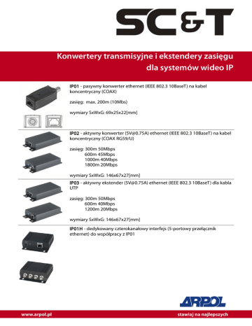 Konwertery transmisyjne i ekstendery zasięgu dla systemów wideo IP IP01 - pasywny konwerter ethernet (IEEE 802.3 10BaseT) na kabel koncentryczny (COAX) zasięg: max. 200m (10Mbs) wymiary SxWxG: 69x25x22[mm] IP02 - aktywny konwerter ([email protected]) ethernet (IEEE 802.3 10BaseT) na kabel koncentryczny (COAX RG59/U) zasięg: 300m 50Mbps 600m 45Mbps 1000m 40Mbps 1800m 20Mbps wymiary SxWxG: 146x67x27[mm] IP03 - aktywny ekstender ([email protected]) ethernet (IEEE 802.3 10BaseT) dla kabla UTP zasięg: 300m 50Mbps 600m 40Mbps 1200m 20Mbps wymiary SxWxG: 146x67x27[mm] IP01H - dedykowany czterokanałowy interfejs (5-portowy przełącznik ethernet) do współpracy z IP01