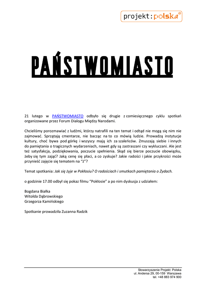 21 lutego w PAŃSTWOMIASTO odbyło się drugie z comiesięcznego cyklu spotkań organizowane przez Forum Dialogu Między Narodami. Chcieliśmy porozmawiać z ludźmi, którzy natrafili na ten temat i odtąd nie mogą się nim nie zajmować. Sprzątają cmentarze, nie bacząc na to co mówią ludzie. Prowadzą instytucje kultury, choć bywa pod górkę i wszyscy mają ich za szaleńców. Zmuszają siebie i innych do pamiętania o tragicznych wydarzeniach, nawet gdy są zastraszani czy wykluczani. Ale jest też satysfakcja, podziękowania, poczucie spełnienia. Skąd się bierze poczucie obowiązku, żeby się tym zająć? Jaką cenę się płaci, a co zyskuje? Jakie radości i jakie przykrości może przynieść zajęcie się tematem na “ż”? Temat spotkania: Jak się żyje w Pokłosiu? O radościach i smutkach pamiętania o Żydach. o godzinie 17.00 odbył się pokaz filmu “Pokłosie” a po nim dyskusja z udziałem: Bogdana Białka Witolda Dąbrowskiego Grzegorza Kamińskiego Spotkanie prowadziła Zuzanna Radzik Stowarzyszenie Projekt: Polska ul. Andersa 29, 00-159 Warszawa tel. +48 883 974 900
