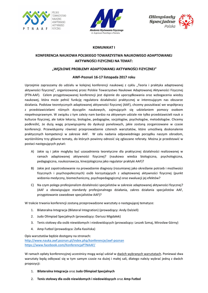 KOMUNIKAT I KONFERENCJA NAUKOWA POLSKIEGO TOWARZYSTWA NAUKOWEGO ADAPTOWANEJ AKTYWNOŚCI FIZYCZNEJ NA TEMAT: „WĘZŁOWE PROBLEMY ADAPTOWANEJ AKTYWNOŚCI FIZYCZNEJ” AWF-Poznań 16-17 listopada 2017 roku Uprzejmie zapraszamy do udziału w kolejnej konferencji naukowej z cyklu „Teoria i praktyka adaptowanej aktywności fizycznej”, organizowanej przez Polskie Towarzystwo Naukowe Adaptowanej Aktywności Fizycznej (PTN-AAF). Celem przygotowywanej konferencji jest dążenie do uporządkowania oraz wzbogacenia wiedzy naukowej, która może pełnić funkcję regulatora działalności praktycznej w interesującym nas obszarze działania. Podstaw teoretycznych adaptowanej aktywności fizycznej (AAF), chcemy poszukiwać we współpracy z przedstawicielami różnych dyscyplin naukowych, zajmujących się udzielaniem pomocy osobom niepełnosprawnym. W związku z tym zależy nam bardzo na aktywnym udziale nie tylko przedstawicieli nauk o kulturze fizycznej, ale także lekarzy, biologów, pedagogów, socjologów, psychologów, metodologów. Chcemy podkreślić, że dużą wagę przywiązujemy do dyskusji panelowych, jakie zostaną zorganizowane w czasie konferencji. Przewidujemy również przeprowadzenie czterech warsztatów, które umożliwią doskonalenie praktycznych kompetencji w zakresie AAF. W celu nadania odpowiedniego porządku naszym obradom, wyróżniliśmy trzy główne tematy, do których powinny odnosić się zgłaszane referaty. Można je przedstawić w postaci następujących pytań: A) Jakie są i jakie mogłyby być uzasadnienia teoretyczne dla praktycznej działalności realizowanej w ramach adaptowanej aktywności fizycznej? (naukowa wiedza biologiczna, psychologiczna, pedagogiczna, naukoznawcza, kinezjologiczna jako regulator praktyki AAF)? B) Jakie jest zapotrzebowanie na prowadzenie diagnozy (rozumianej jako określanie potrzeb i możliwości fizycznych i psychospołecznych) osób korzystających z adaptowanej aktywności fizycznej (punkt widzenia medyczny, biomechaniczny, psychopedagogiczny) oraz ewaluacji jej efektów? C) Na czym polega profesjonalizm działalności specjalistów w zakresie adaptowanej aktywności fizycznej? (AAF a obowiązujące standardy profesjonalnego działania, zakres działania specjalistów AAF, przygotowanie zawodowe specjalistów AAF)? W trakcie trwania konferencji zostaną przeprowadzone warsztaty o następującej tematyce: 1. Bilateralna Integracja (Bilateral Integration) (prowadzący: Andy Dalziell) 2. Judo Olimpiad Specjalnych (prowadzący: Dariusz Migdałek) 3. Tenis stołowy dla osób niewidomych i niedowidzących (prowadzący: Leszek Szmaj, Mirosław Górny) 4. Amp Futbol (prowadząca: Zofia Kasińska) Opis warsztatów będzie dostępny na stronach: http://www.nauka.awf.poznan.pl/index.php/konferencje/awf-poznan https://www.facebook.com/KonferencjaPTNAAF/ W ramach opłaty konferencyjnej uczestnicy mogą wziąć udział w dwóch wybranych warsztatach. Ponieważ dwa warsztaty będą odbywać się w tym samym czasie na dużej i małej sali, dlatego należy wybrać jedną z dwóch propozycji: 1. Bilateralna Integracja oraz Judo Olimpiad Specjalnych 2. Tenis stołowy dla osób niewidomych i niedowidzących oraz Amp Futbol Bardzo prosimy osoby zainteresowane uczestnictwem w powyższej konferencji o wypełnienie załączonego formularza i przesłanie go do dnia 15 maja 2017 roku na następujący adres e-mail: [email protected]. Osoby zainteresowane przedstawieniem referatów lub doniesień, proszone są o przesłanie w powyższym terminie tytułów wystąpień, krótkich streszczeń i określenie w jakim bloku tematycznym lokują swoje wystąpienie. Po zakwalifikowaniu referatów i doniesień przez członków Komitetu Naukowego konferencji, wszyscy uczestnicy otrzymają jej szczegółowy program do dnia 15 września 2017 roku. Koszt uczestnictwa w konferencji przedstawiamy w poniższej tabeli. Kategoria uczestnictwa Członkowie PTN-AAF (opłacone składki) Doktoranci i studenci Pozostali uczestnicy Udział w bankiecie (16 listopada wieczorem) Opłata 200 zł 100 zł 250 zł 100 zł Odpłatność za udział w konferencji prosimy przesyłać do 30 września 2017 roku na adres: Akademia Wychowania Fizycznego w Poznaniu im. Eugeniusza Piaseckiego Katedra Adaptowanej Aktywności Fizycznej, ul. Królowej Jadwigi 27/39; 61-871 Poznań Nr konta: PKO BP SA 86 1020 4027 0000 1902 1271 4947 Z dopiskiem: „Konferencja PTN-AAF 2017”. Dla uczestników konferencji została wynegocjowana specjalna oferta cenowa noclegów: 1. Hotel Ibis Poznań Centrum http://www.accorhotels.com/pl/brands/hotels-ibis.shtml ul. Kazimierza Wielkiego 23, 61-863 Poznań (znajduje się ok. 700 m od AWF) Ceny: pok. 1-os. 169 zł; pok. 2-os. 210zł. Rezerwacja: tel.: +48 61 858 44 00 fax: +48 61 858 44 44 [email protected] 2. Hotel Włoski Business Centrum Poznań www.hotelwloski.pl Dolna Wilda 8, 61 – 552 Poznań (znajduje się ok. 400 m od AWF) Ceny: (15/17.11.2017 pok. 1- 2 os. 317 zł; 17/18.11.2017 pok. 1- 2 os. 239 zł;) Rezerwacja: tel.: +48 61 833 52 62; fax: +48 61 833 52 61; [email protected] W obu hotelach, uczestnicy mogą rezerwować pokój we własnym zakresie na hasło: "Konferencja AWF". Informacje dotyczące konferencji będą dostępne na stronach: http://www.nauka.awf.poznan.pl/index.php/konferencje/awf-poznan https://www.facebook.com/KonferencjaPTNAAF/ Łączę wyrazy szacunku w imieniu Komitetu Naukowego i Komitetu Organizacyjnego prof. dr hab. Stanisław Kowalik
