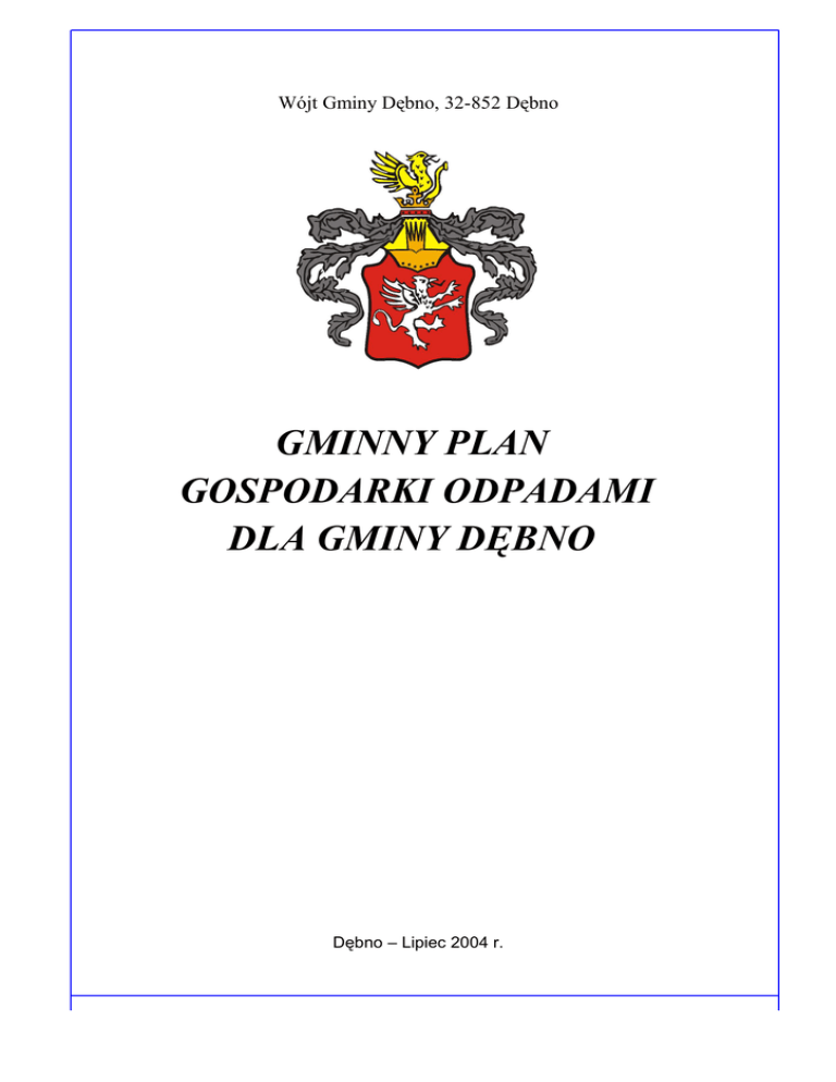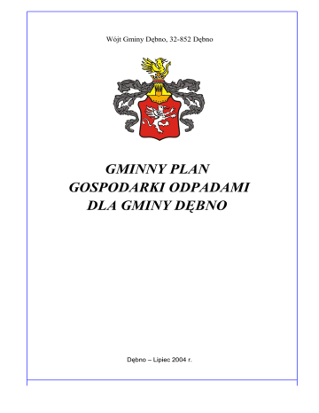 Wójt Gminy Dębno, 32-852 Dębno GMINNY PLAN GOSPODARKI ODPADAMI DLA GMINY DĘBNO Dębno – Lipiec 2004 r. Spis treści I. Wstęp....................................................................................................................................... 3 I.1. Podstawa opracowania...................................................................................... 4 II. Charakterystyka obszaru opracowania................................................................................... 5 II.1. Położenie geograficzne gminy Dębno............................................................... 5 II.2. Charakterystyka geologiczna terenu gminy....................................................... 6 II.3. Struktura jednostki administracyjnej.................................................................. 6 II.4. Zagospodarowanie terenu................................................................................. 8 II.4.1. Struktura własności.................................................................................... 9 II.5. Środowisko przyrodnicze................................................................................... 9 II.5.1. Sytuacja hydrologiczna............................................................................... 9 II.5.2. Gleby.......................................................................................................... 9 II.5.3. Tereny leśne............................................................................................. 10 II.6. Charakterystyka demograficzna i gospodarcza.............................................. 10 II.6.1. Wielkość i struktura zaludnienia gminy.................................................... 10 II.6.2. Gospodarka............................................................................................. 12 II.6.2.1. Rolnictwo.......................................................................................... 12 II.6.2.2. Poza rolnicza działalność gospodarcza .......................................... 12 III.Aktualny stan gospodarki odpadami na terenie gminy Dębno............................................. 13 III.1. Odpady komunalne........................................................................................ 14 III.1.1. Wytwarzanie odpadów.......................................................................... 14 ........................................................................................................................... 15 III.1.2. Zbieranie odpadów................................................................................. 16 III.1.3. Transport, odzysk i unieszkodliwianie odpadów..................................... 18 III.2. Osady ściekowe............................................................................................. 21 III.3. Odpady przemysłowe..................................................................................... 22 ........................................................................................................................... 23 III.3.1. Sposoby postępowania z wytwarzanymi odpadami.................................23 III.3.2. Odzysk odpadów przemysłowych........................................................... 24 IV.Prognoza zmian w gospodarce odpadami............................................................................25 IV.1. Odpady komunalne........................................................................................ 25 IV.2. Osady ściekowe............................................................................................. 29 IV.3. Odpady przemysłowe.................................................................................... 30 V.Działania zmierzające do poprawy sytuacji w zakresie gospodarki odpadami ....................31 V.1. Krótkoterminowy plan działań w latach 2004 –2007....................................... 32 V.2. Długoterminowy plan strategiczny w latach 2004 –2011............................... 32 VI.Planowany system gospodarki odpadami............................................................................ 36 VI.1. Przejęcie zadań w zakresie gospodarki odpadami przez Zakład Zagospodarowania Odpadów (wariant I)............................................................... 36 VI.2. Gospodarka odpadami we własnym zakresie (wariant II).............................. 37 VI.2.1. Zbieranie odpadów komunalnych........................................................... 38 VI.2.2. Transport odpadów komunalnych.......................................................... 39 VI.2.3. Odzysk i unieszkodliwianie odpadów komunalnych .............................. 39 VI.2.4. Odpady niebezpieczne .......................................................................... 41 VI.2.5. Odpady wielkogabarytowe i odpady tekstylne .......................................42 VI.2.6. Odpady budowlane ............................................................................... 42 2 VII.Harmonogram realizacji przedsięwzięć..............................................................................43 VIII.Finansowanie działań i inwestycji.....................................................................................45 VIII.1. Fundusze ochrony środowiska i gospodarki wodnej ................................... 47 VIII.2. Fundacje i programy pomocowe ................................................................. 49 VIII.2.1. Fundacja „EKOFUNDUSZ” ................................................................. 49 VIII.2.2. Fundusze Strukturalne, Fundusz Spójności oraz Programy operacyjne.. 50 IX.System monitoringu i oceny realizacji zamierzonych celów............................................... 53 X.Wnioski z analizy oddziaływania projektu planu na środowisko......................................... 55 XI.Streszczenie w języku niespecjalistycznym.......................................................................