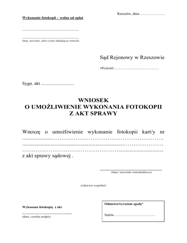 Rzeszów, dnia ……………….. Wykonanie fotokopii – wolne od opłat ............................................................ ............................................................ (imię, nazwisko, adres osoby składającej wniosek) Sąd Rejonowy w Rzeszowie (Wydział):…………………………………….. Sygn. akt ............................ WNIOSEK O UMOŻLIWIENIE WYKONANIA FOTOKOPII Z AKT SPRAWY Wnoszę o umożliwienie wykonanie fotokopii kart/y nr .....................………..…………………………………………. ........................................................................………………… ……………………………………………................................ z akt sprawy sądowej . ______________________ (imię i nazwisko wnioskodawcy) (właściwe wypełnić) Wykonano fotokopię z akt …………………………………..… (data, czytelny podpis) Odmowa/wyrażam zgodę* Odmowa/wyrażam zgodę Sędzia ........................................... Sędzia …………………….………..